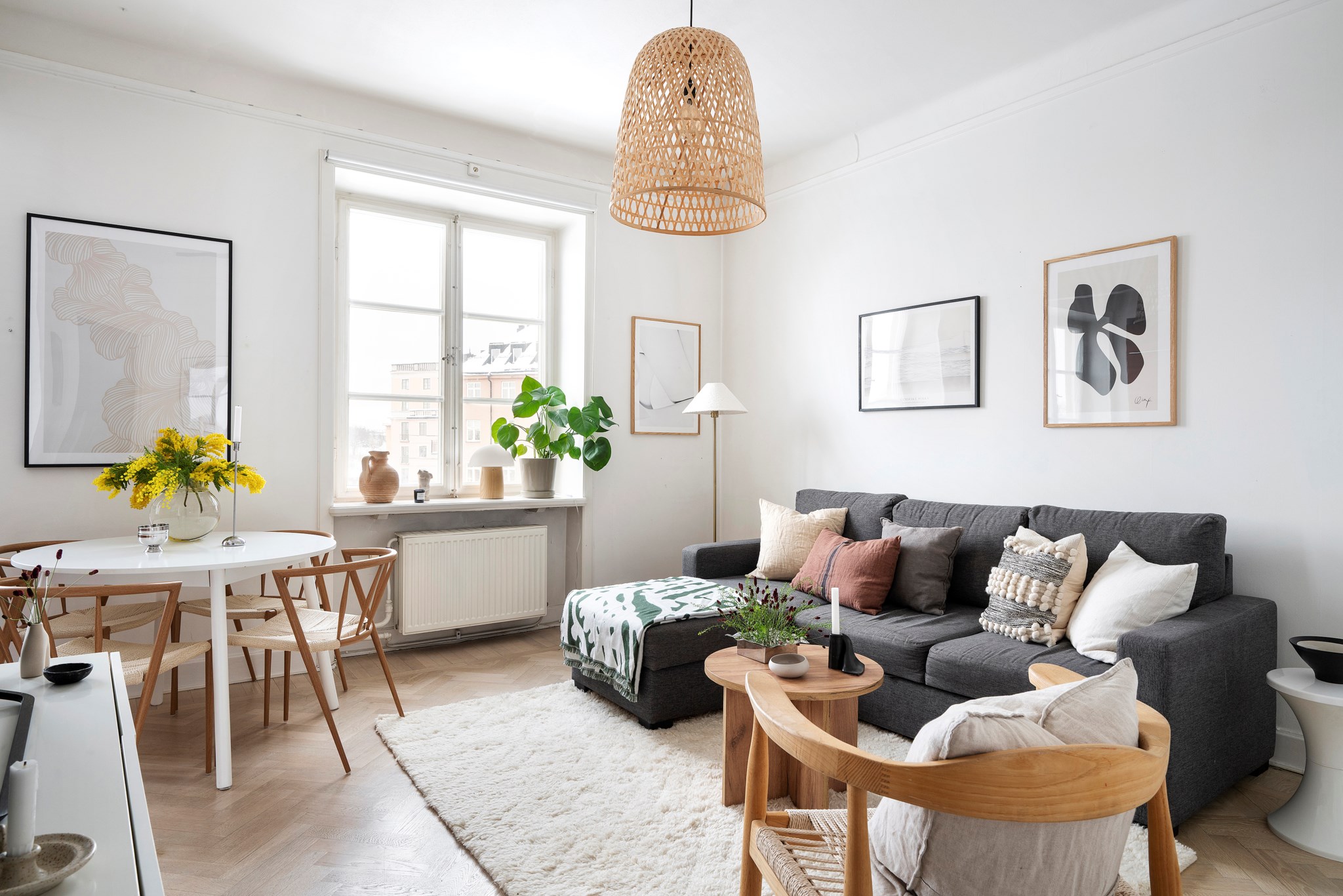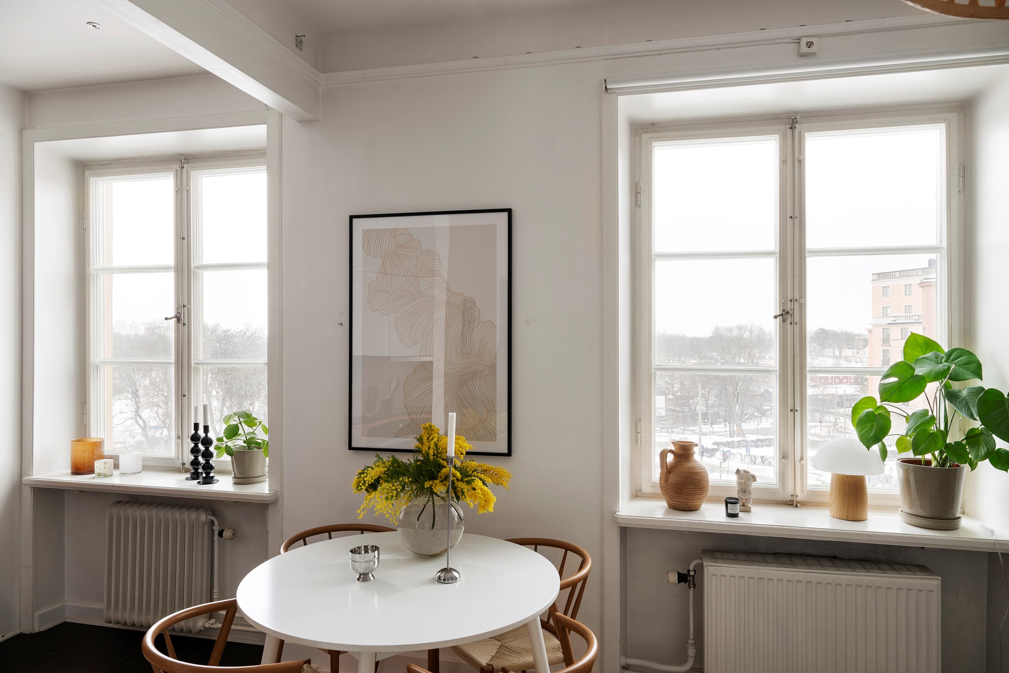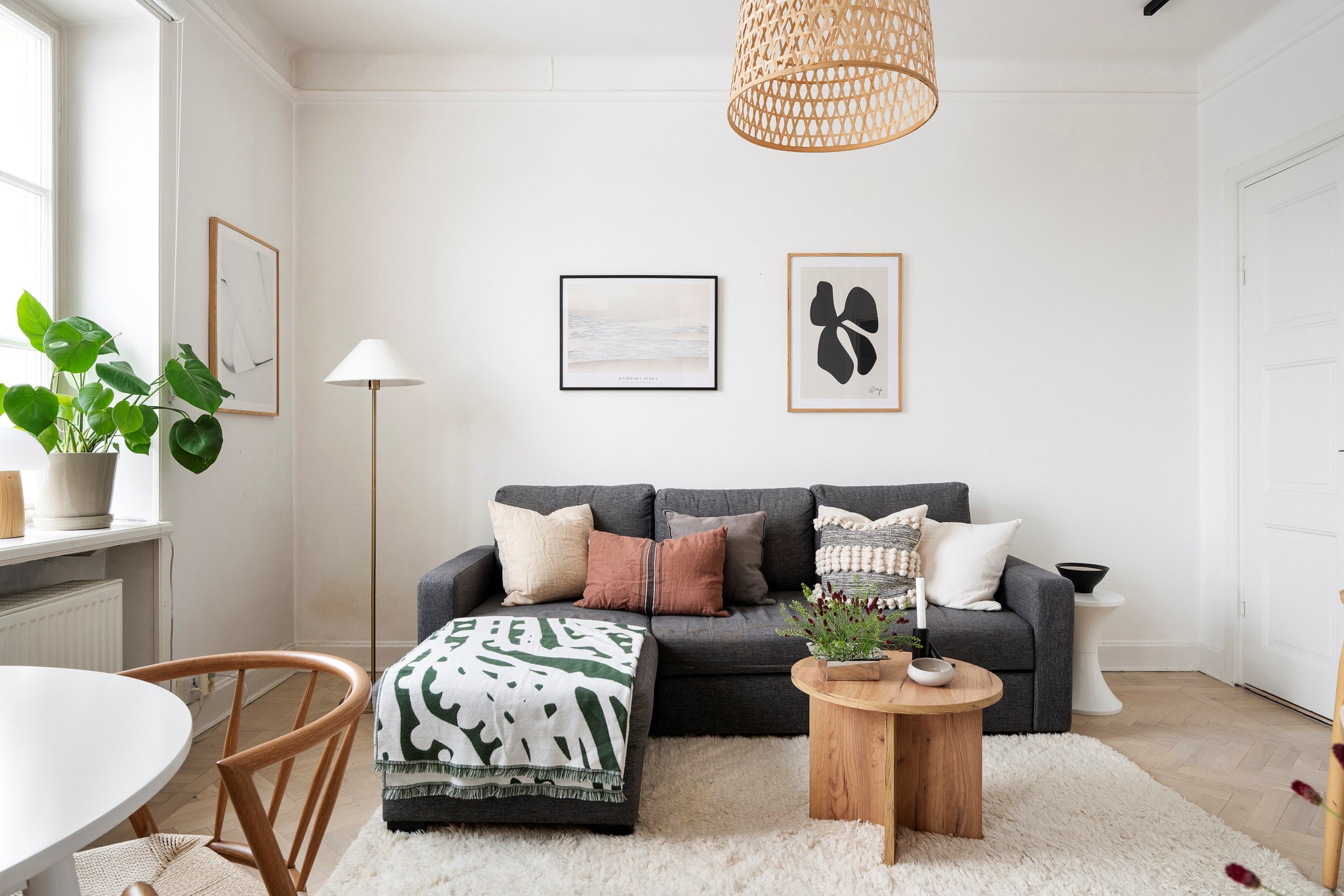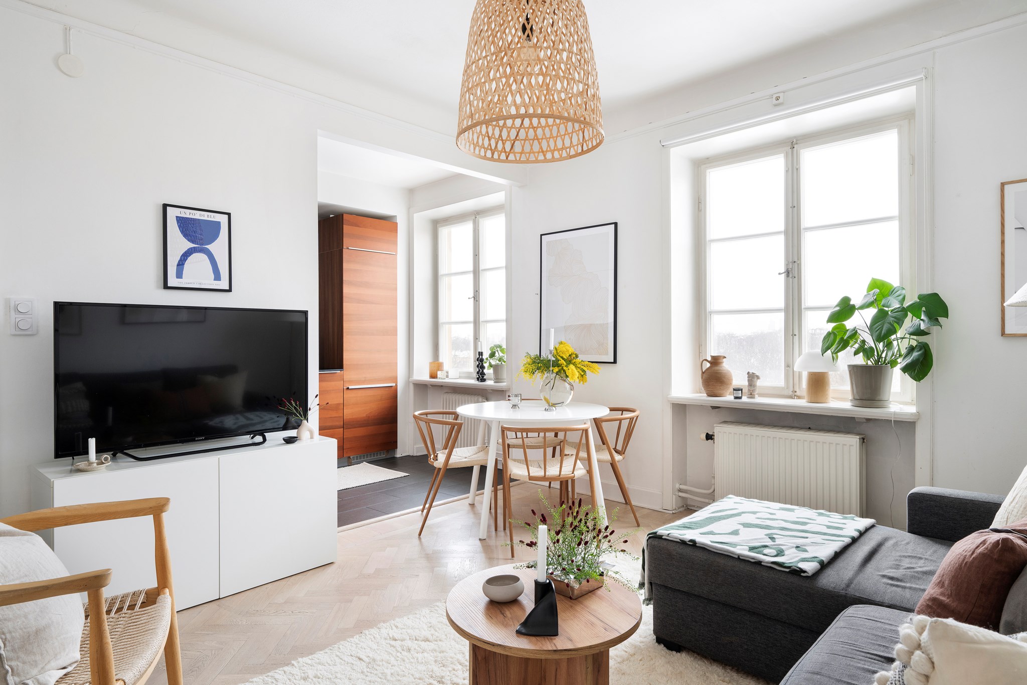 Den öppna planlösningen mellan kök och vardagsrum skapar en social och luftig helhet där fiskbensparketten löper vackert genom rummet. Spröjsade fönster, generös takhöjd och utsikten mot grönska ger karaktär och ett behagligt djup. Här finns plats för både soffgrupp och matplats, samtidigt som planlösningen är flexibel och genomtänkt.