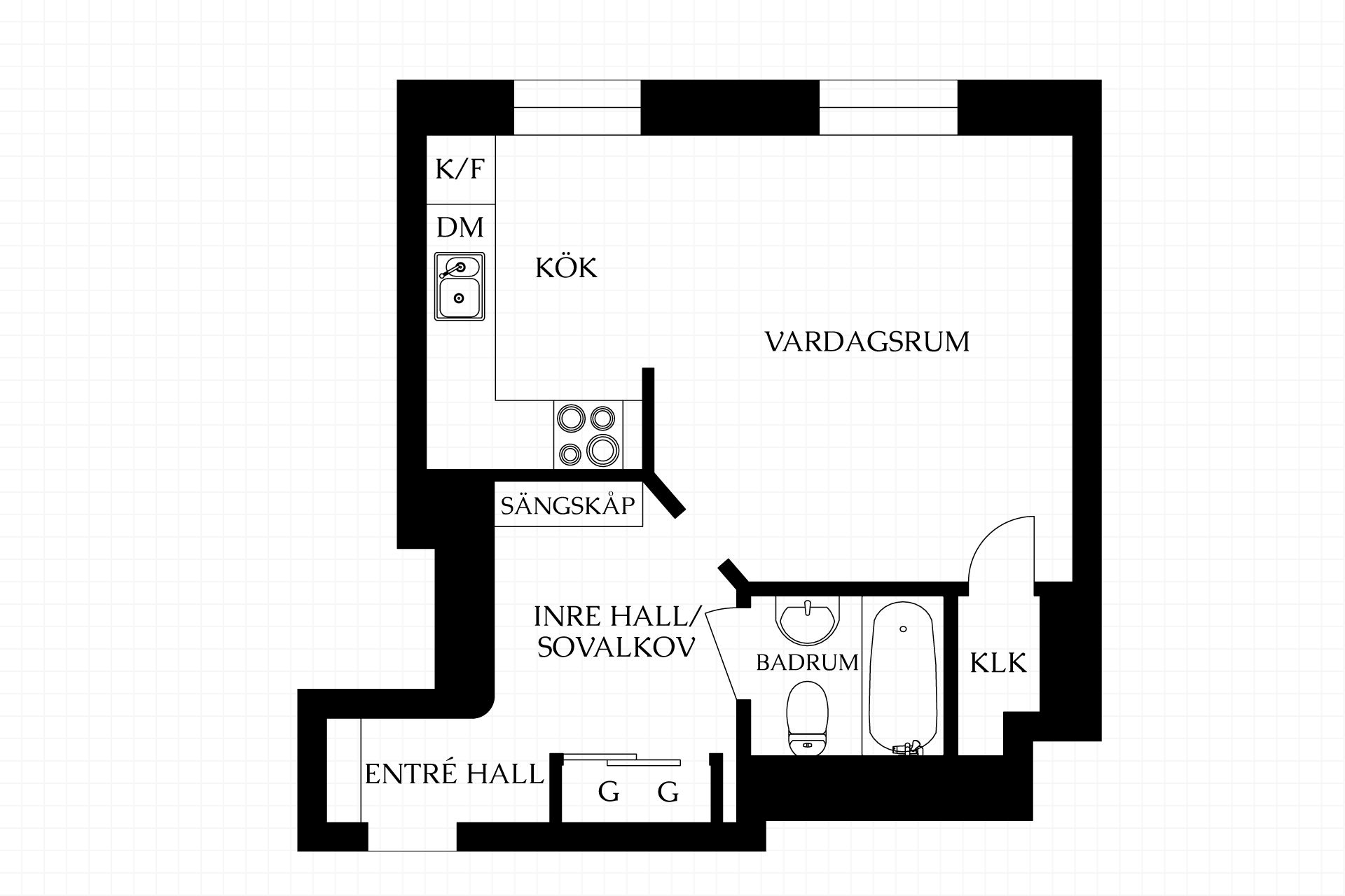 Den inre hallen rymmer ett smart sängskåp som enkelt fälls ut och ger bostaden en naturlig sovdel utan att kompromissa med sällskapsytorna. Förvaringen är ovanligt god för storleken, med både klädkammare i anslutning till rummet och garderob i hallen.