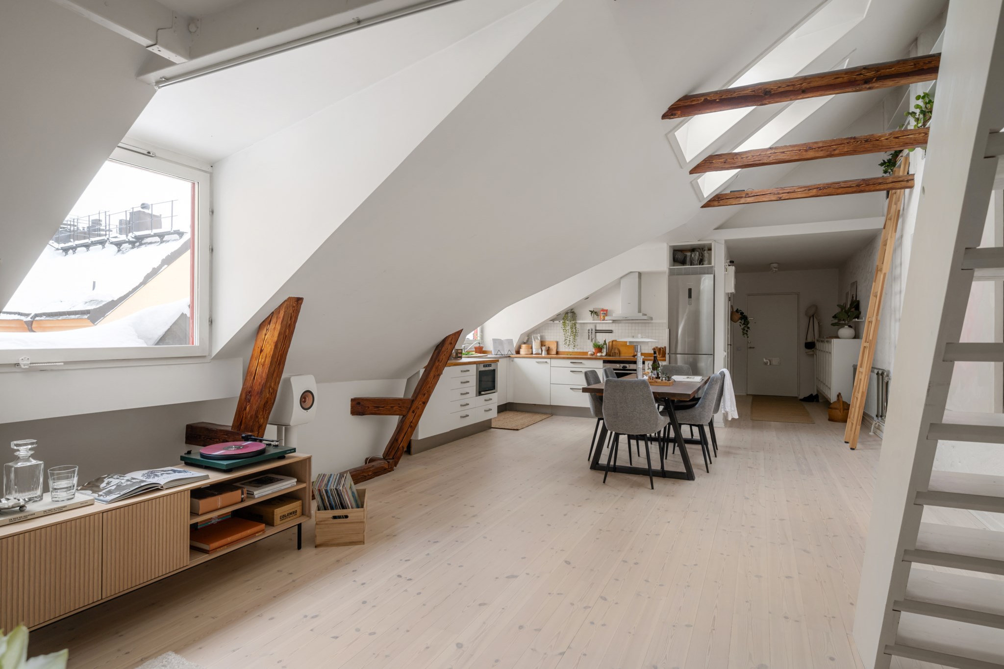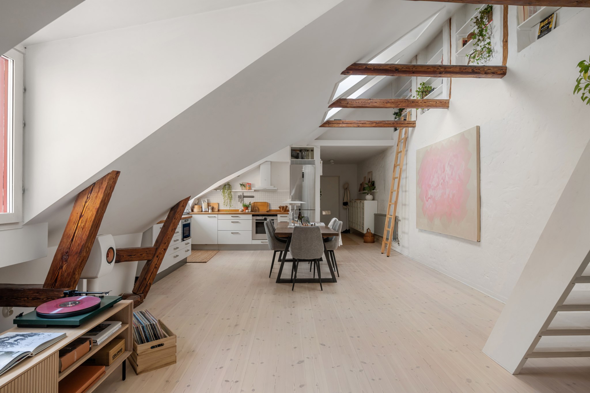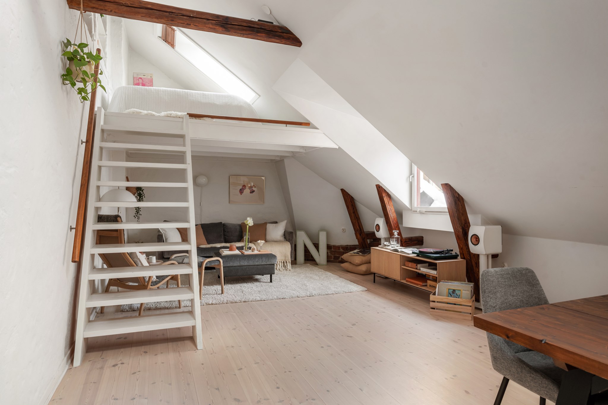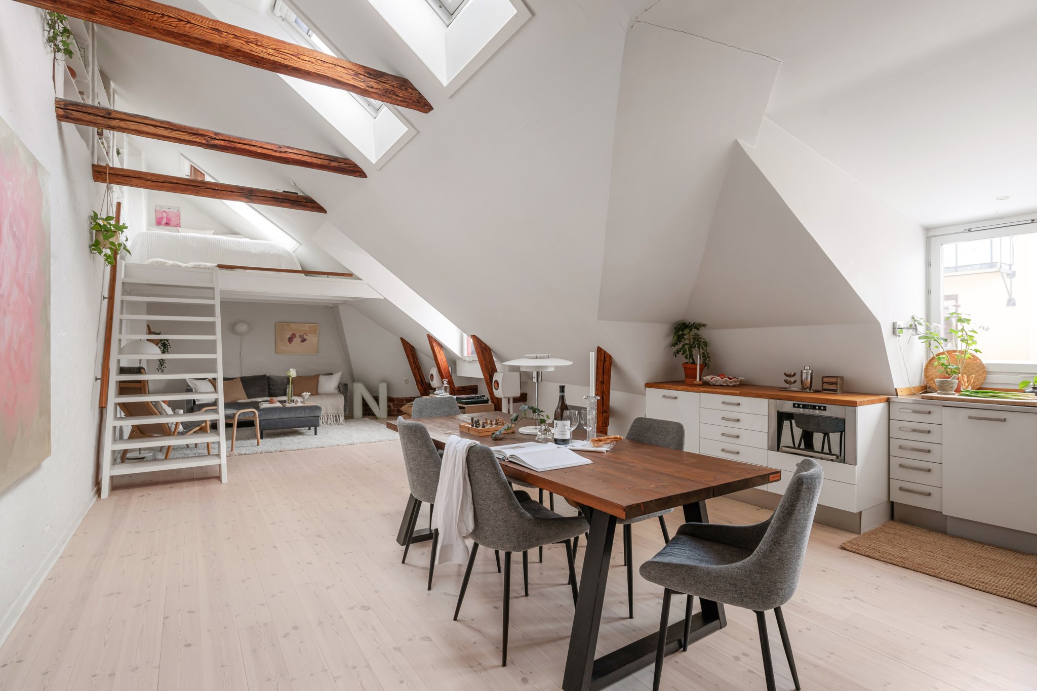 Otroligt ljust och spatiöst vardagsrum med fantastisk rymd, snedtak, synliga bjälkar och upp till 4 meter i takhöjd. Tre takfönster och två fönster mot innergård skänker lägenheten härligt ljus. Rogivande utsikt över grönskande träd, vackra grannfastigheter, takåsar och Maria kyrkas spira. Studiokaraktären är påtaglig med öppen planlösning mellan kök, matplats och vardagsrum. Gott om plats för umgänge och middagar med många gäster. Möblerbar del under loft med plats för soffmöblemang, fåtöljer m.m. Belysning på takbjälkar och längs golvlister skapar stämning kvällstid. Vitputsad vägg längs rummets långsida med smarta nischer. Platsbyggd trappa tar dig upp till mysigt sovloft med ljus via takfönster. Här finns plats för 160cm bred säng. Finns möjlighet att enkelt skapa en 2:a genom att sätta upp en vägg och på så vis få ett separat sovrum; se alternativ planritning.