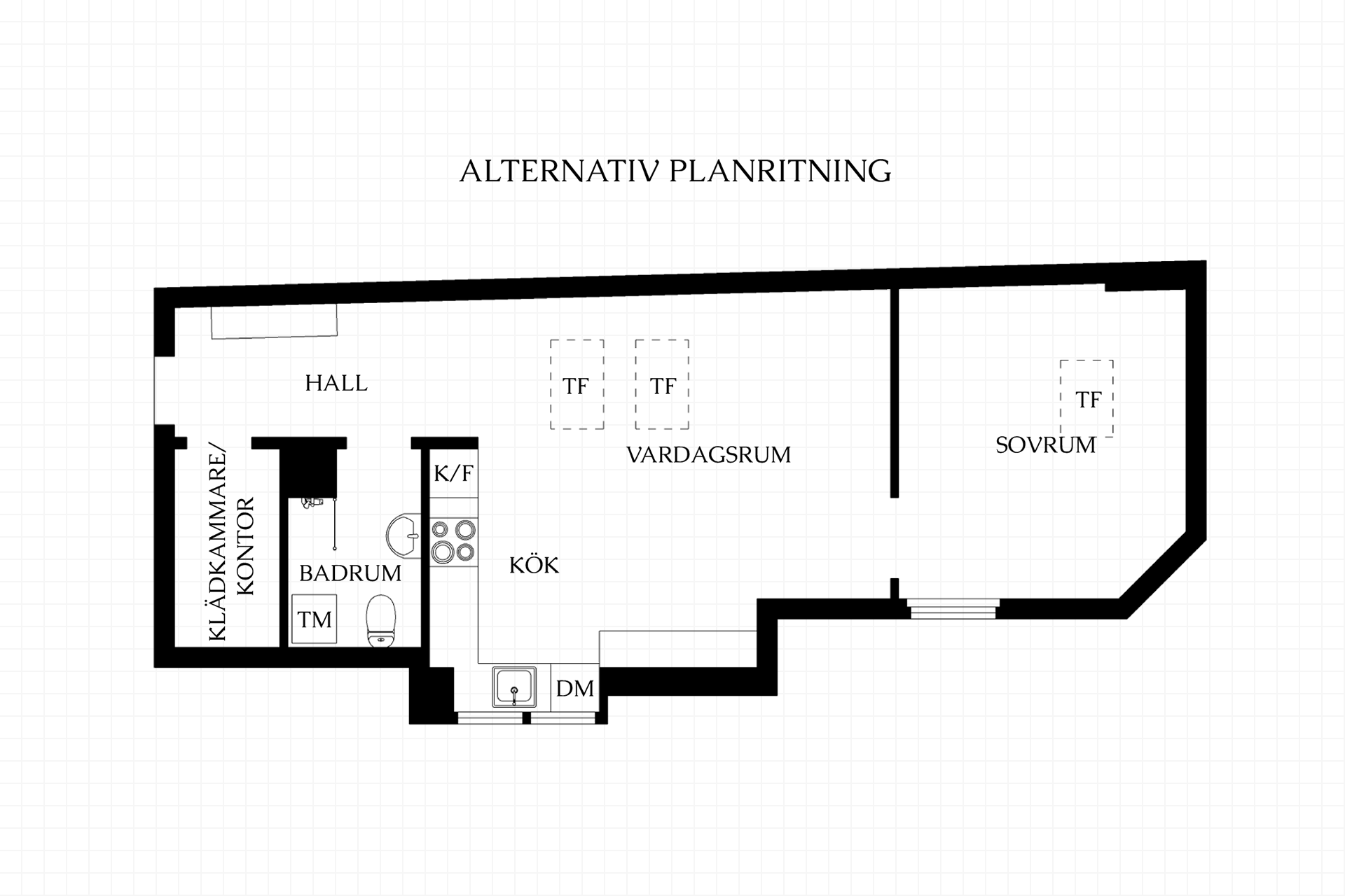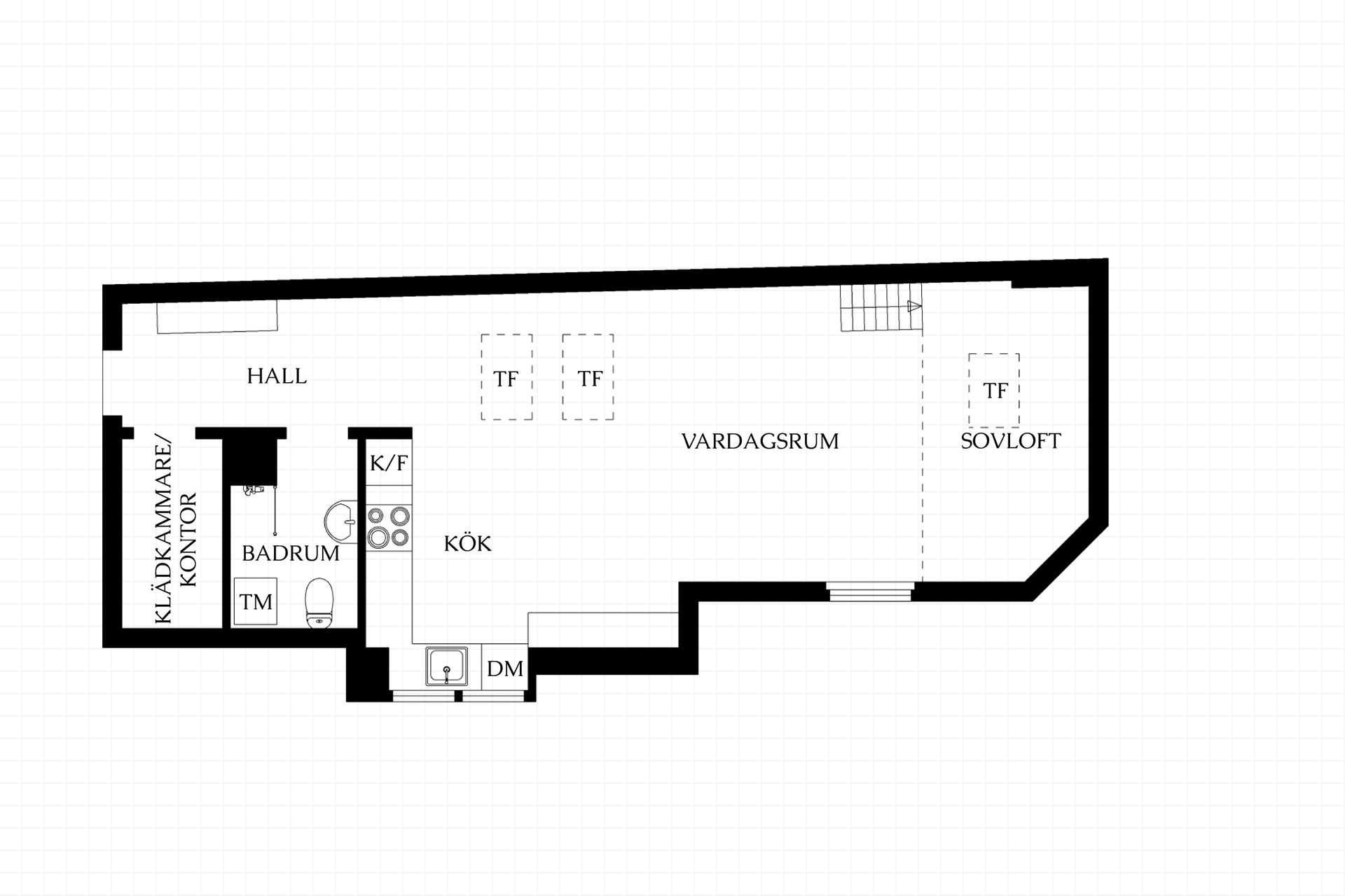 Här erbjuds öppen social planlösning där sällskapsrum och kök skapar luftiga umgängesytor, som gjorda för mingel och middagar. Trappa upp till mysigt sovloft om ca 6m² med plats för dubbelsäng. Finns möjlighet att enkelt skapa en 2:a genom att sätta upp en vägg och på så vis få ett separat sovrum; se alternativ planritning.