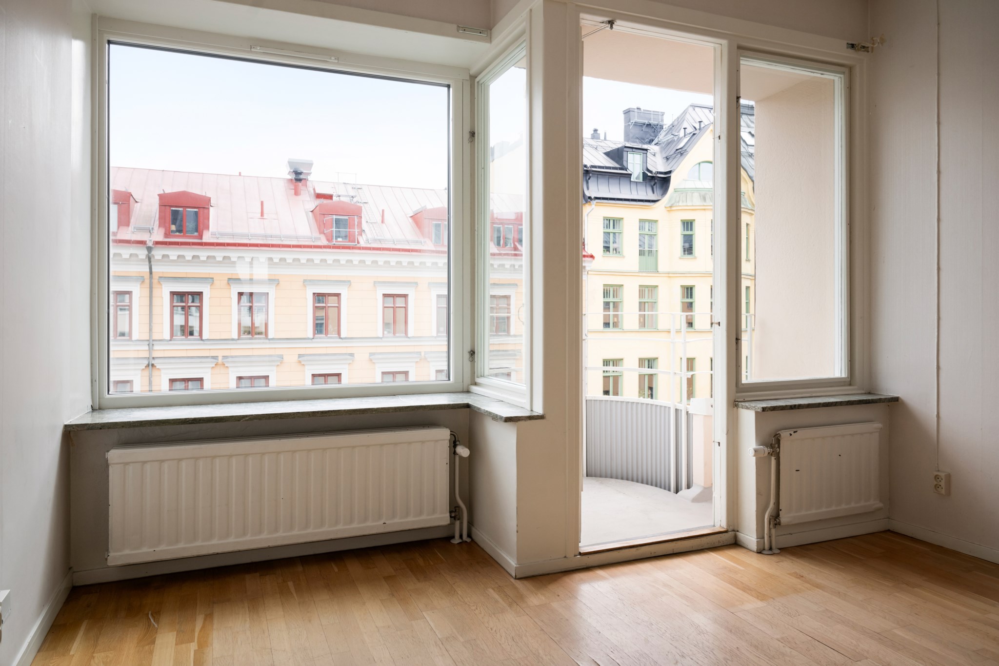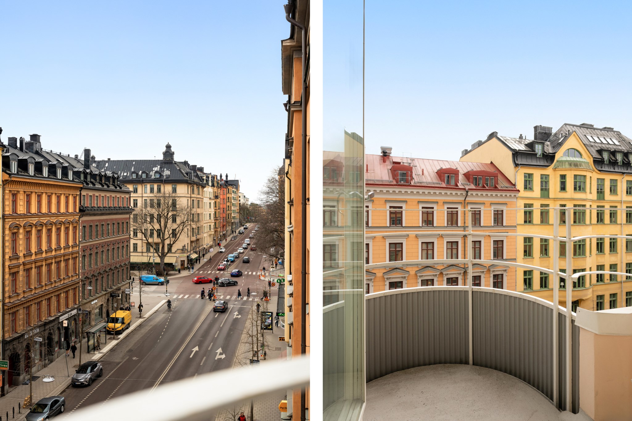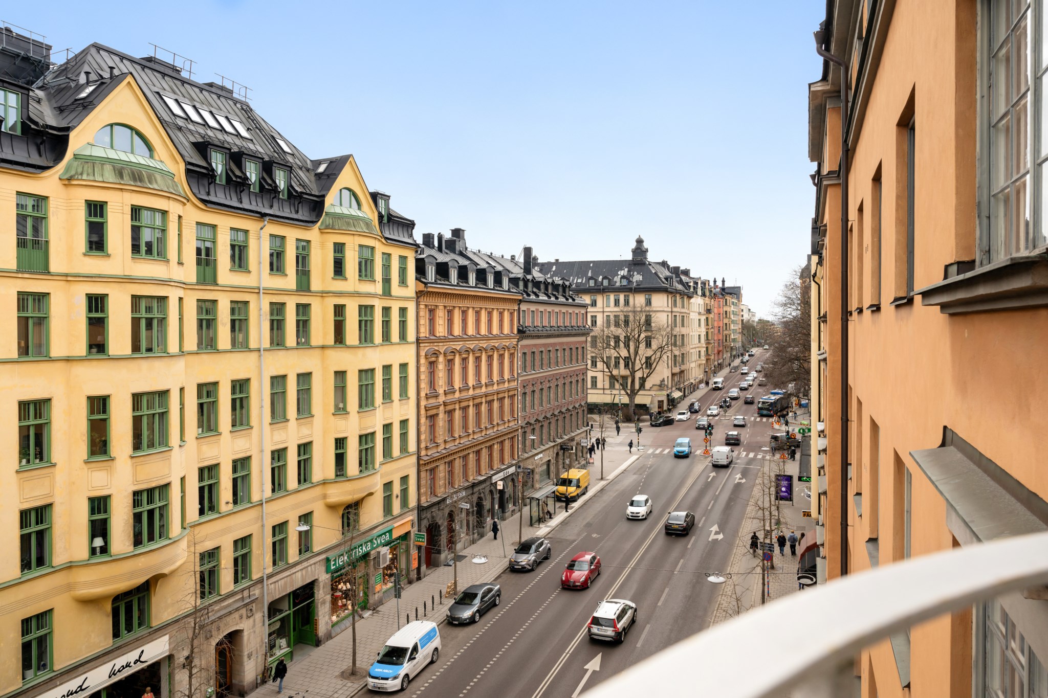 Möblerbar balkong i soligt söderläge med härlig vy mot Slussen i öster och Hornsgatspuckeln i väster. Här kan du avnjuta solen större delen av dagen.