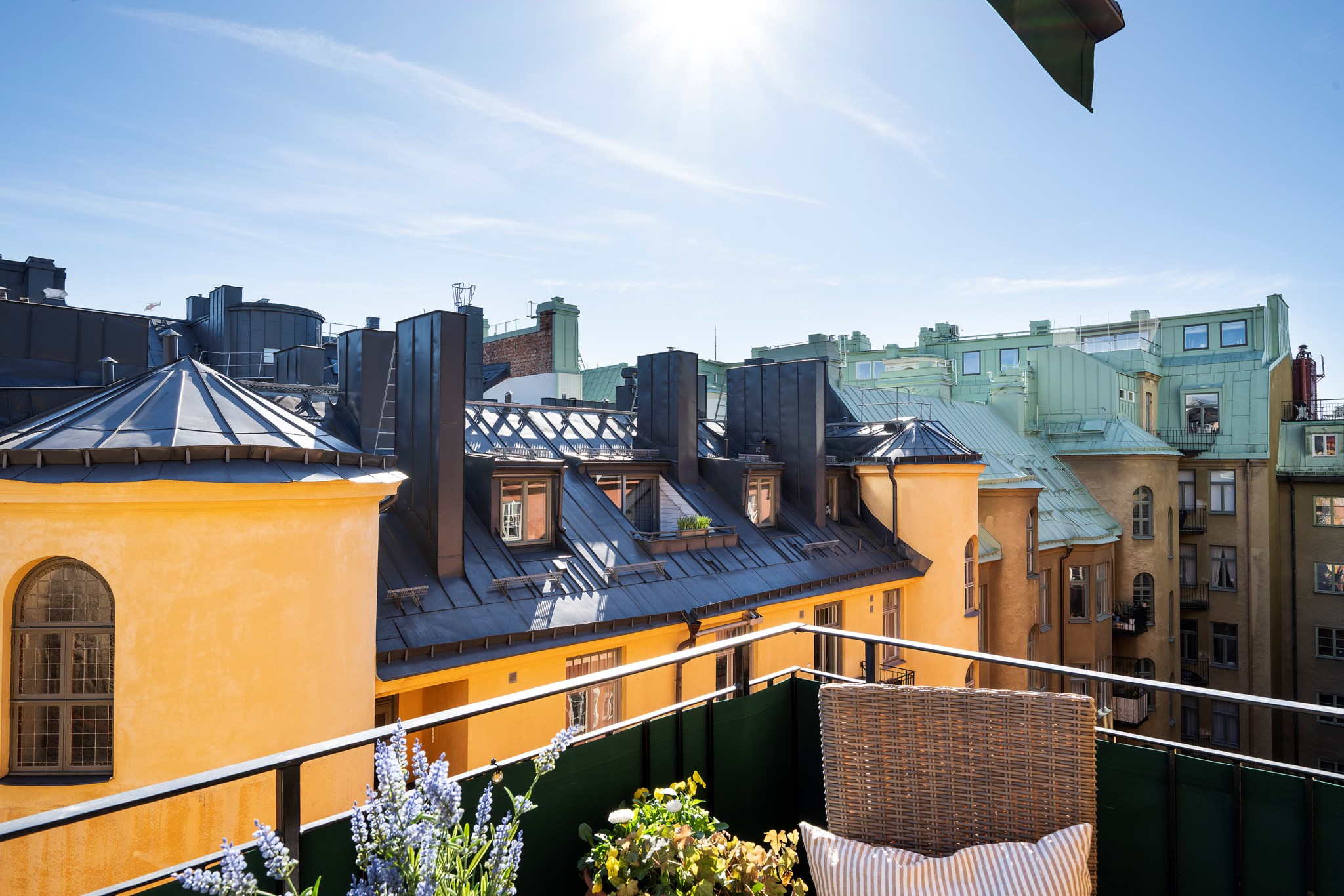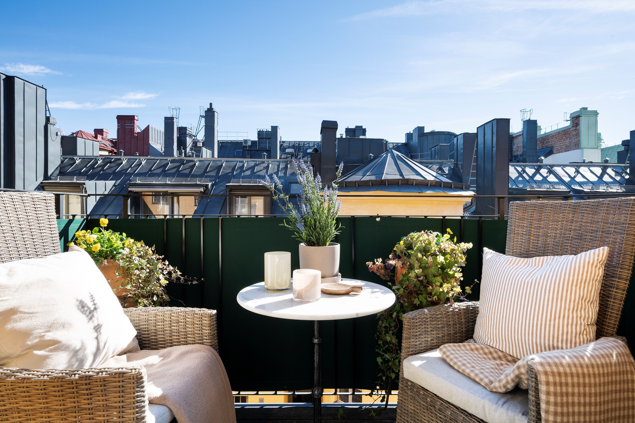 Solig och tyst belägen balkong i sydostligt läge med plats för bord och stolar. Tack vare det höga läget skiner solen här från morgon till eftermiddag under årets sommarmånader.