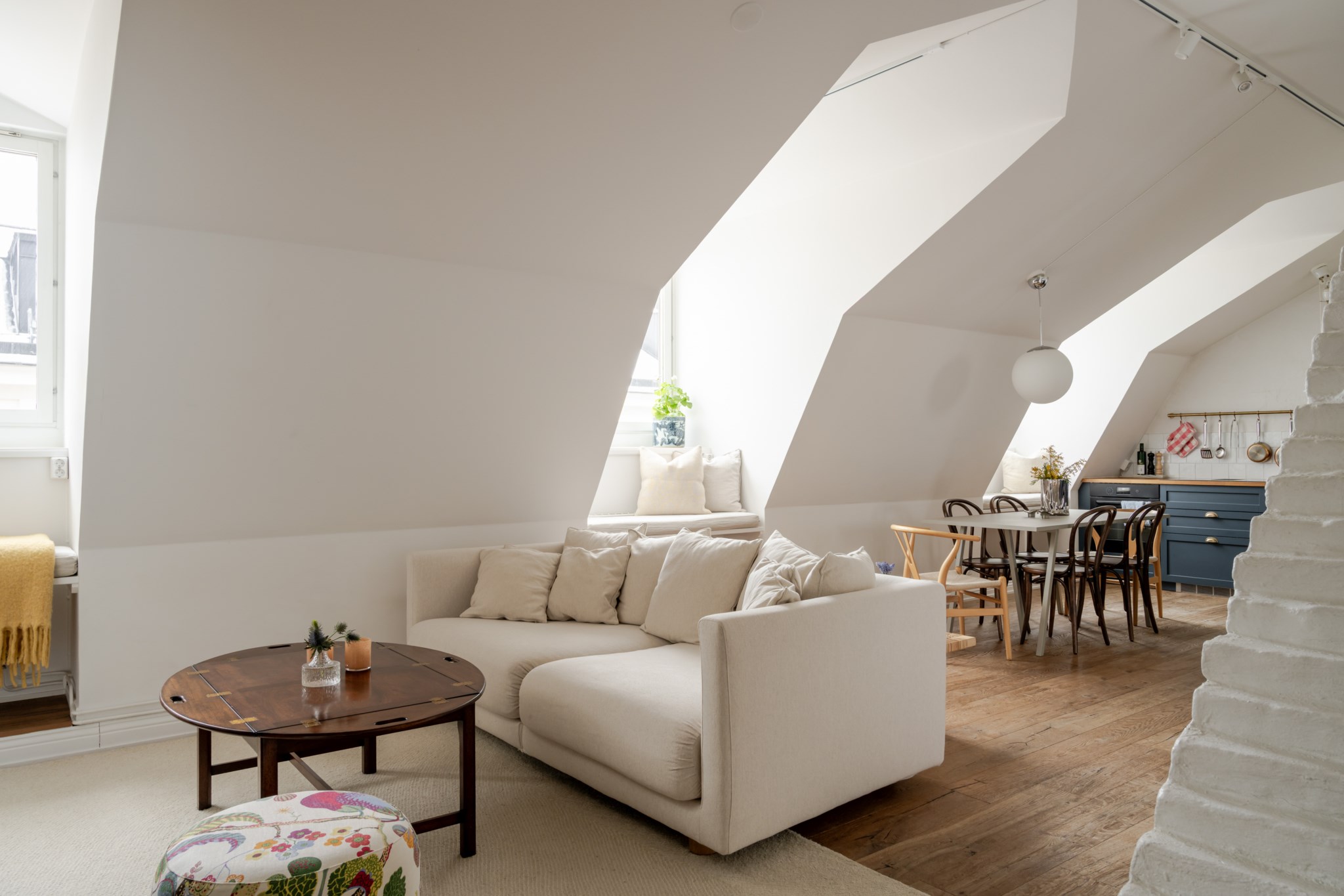 Öppen planlösning mellan kök och vardagsrum. Utmärkt kök med gott om skåp, bra arbetsytor och naturlig plats för ett stort matbord. Kyl/frys, diskmaskin, varmluftsugn samt induktionshäll med fläkt. Lättmöblerat vardagsrum med inbyggd bokhylla. Platsbyggda sittplatser vid samtliga fönster.