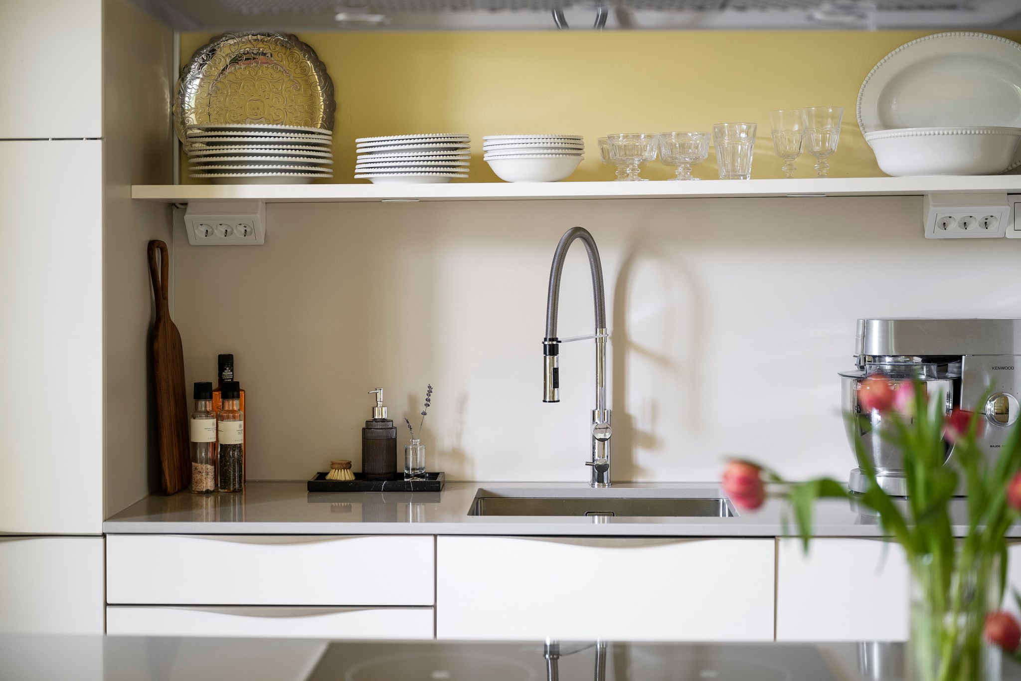 Köket i sig är stilrent vitt med gott om skåp och lådor samt bänkskiva av ljus kvartskomposit. Den maskinella utrustningen består av dubbel kyl och frys, induktionshäll, inbyggnadsugn och mikro samt integrerad diskmaskin. Den väl tilltagna köksön i matchande stil bjuder in till mingel och matlagning - en naturlig samlingspunkt. Finns även gott om utrymme för ett matbord och loungedel.