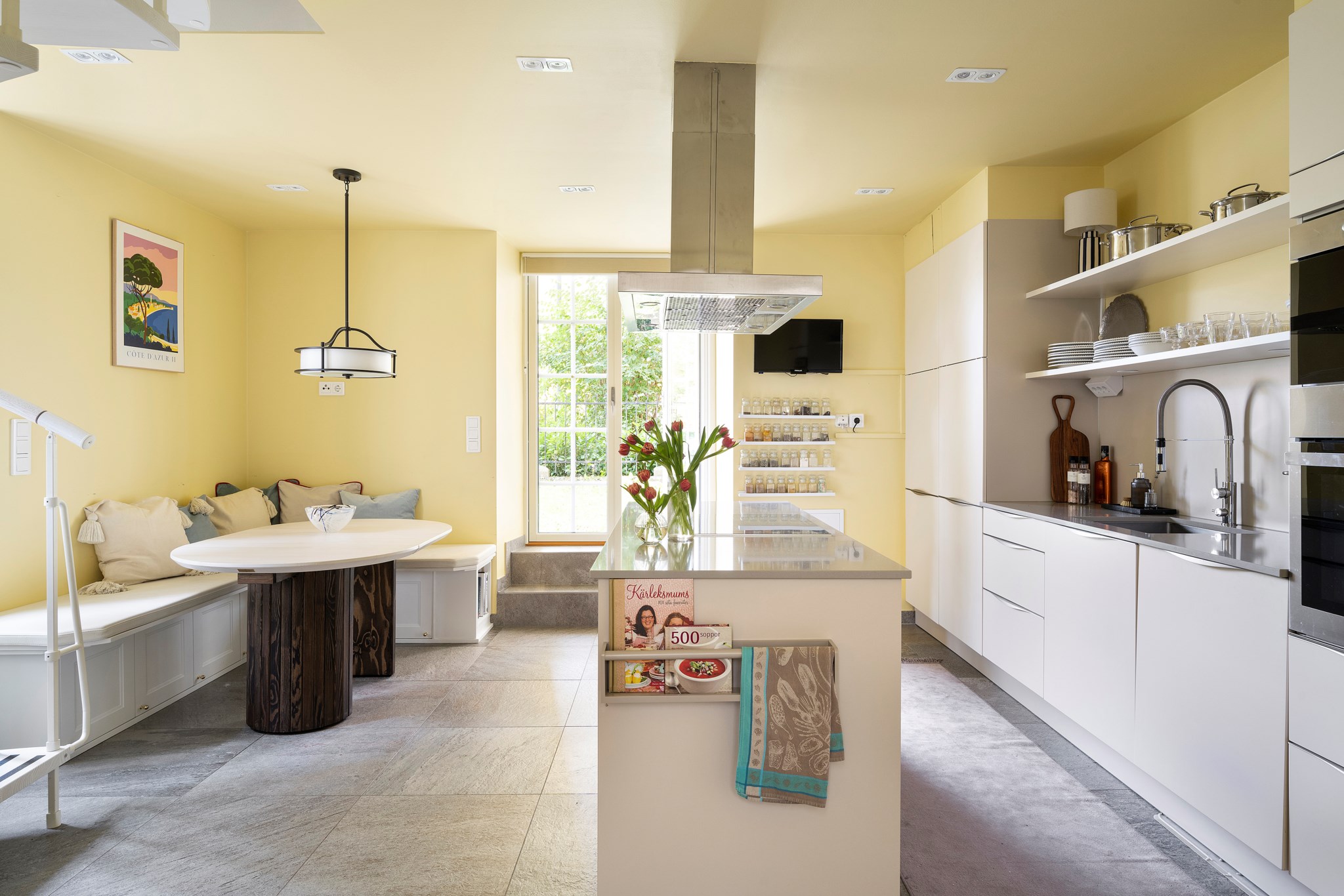 Den nedre våningen köptes loss av tidigare ägare och inkorporerades via en snygg spiraltrappa till ursprungslägenheten. På golvet ligger rustik granitkeramik som minner om italienska stengolv - under dem gömmer sig vattenburen golvvärme. Här finns kök, utgången till uteplats, gäst-wc och ytterdörr med liten hall.