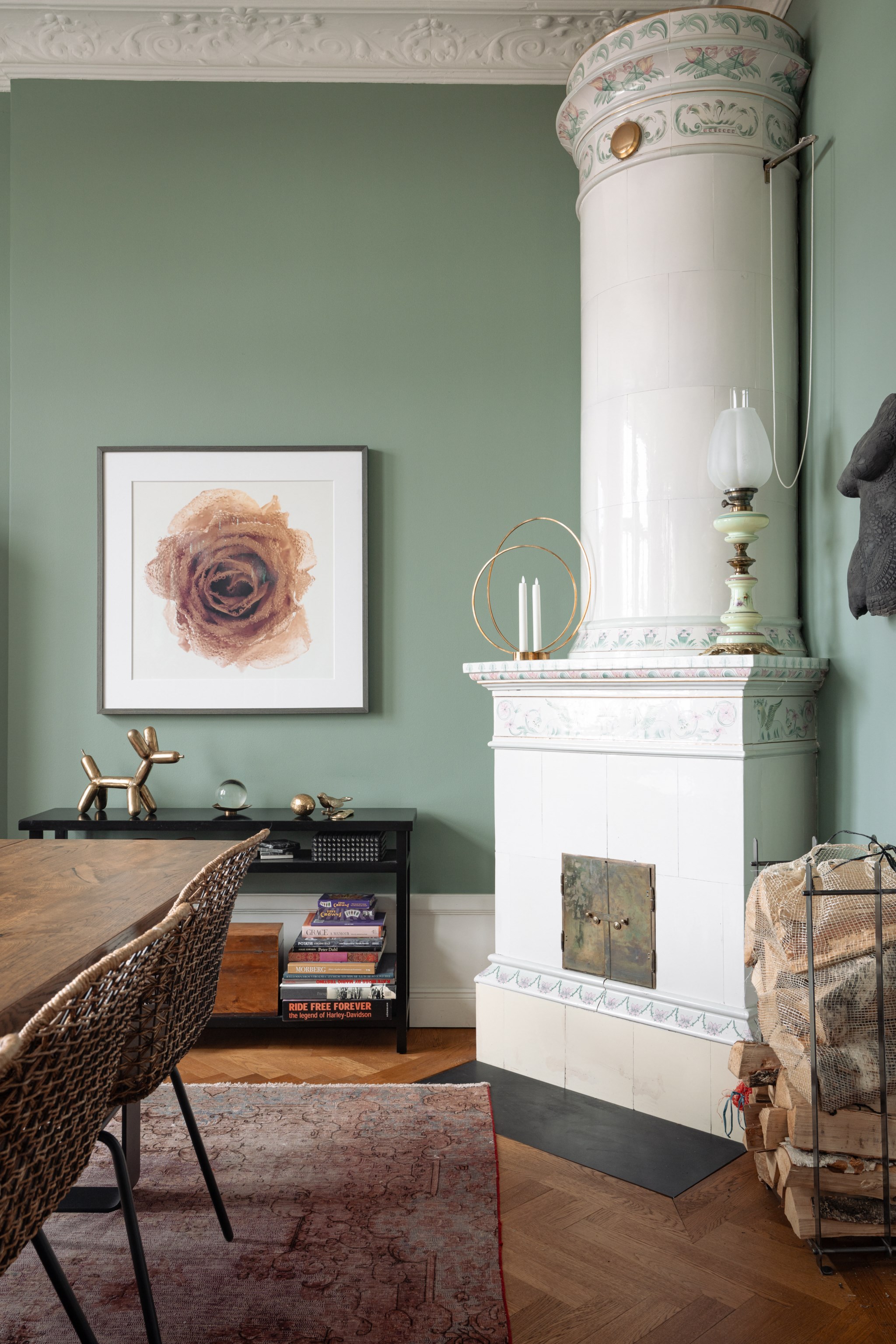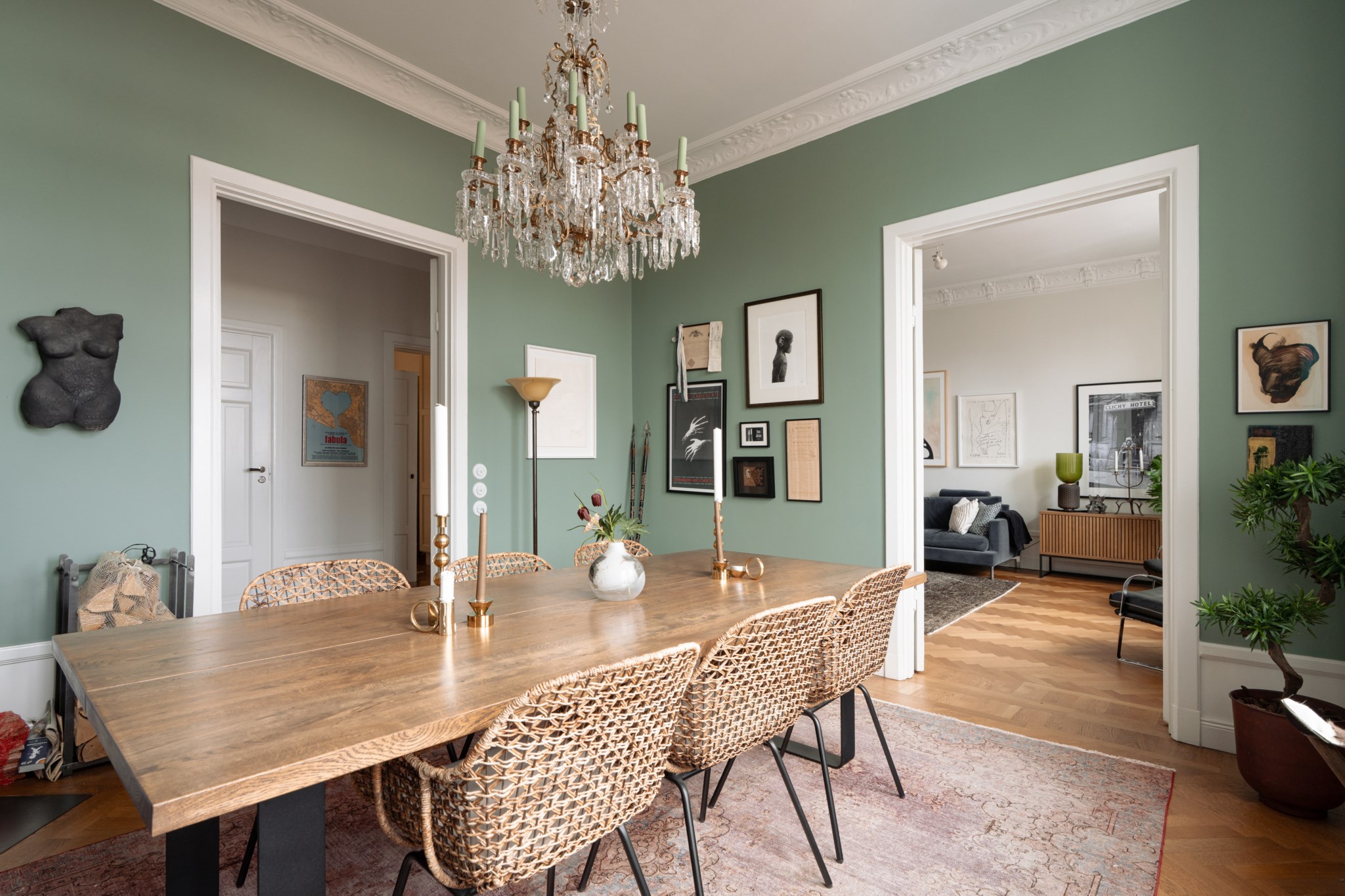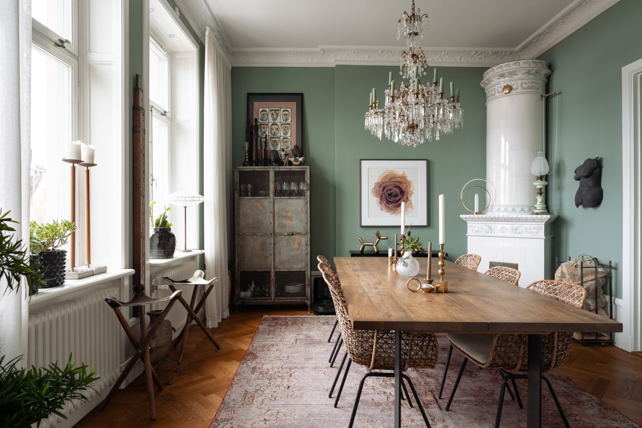 Elegant matsal med stora södervända fönster, högt i tak och vackra stuckaturer. Här finns en fungerande kakelugn och plats för ett stort matbord. Rummet kan vid behov delas av till två separata rum.