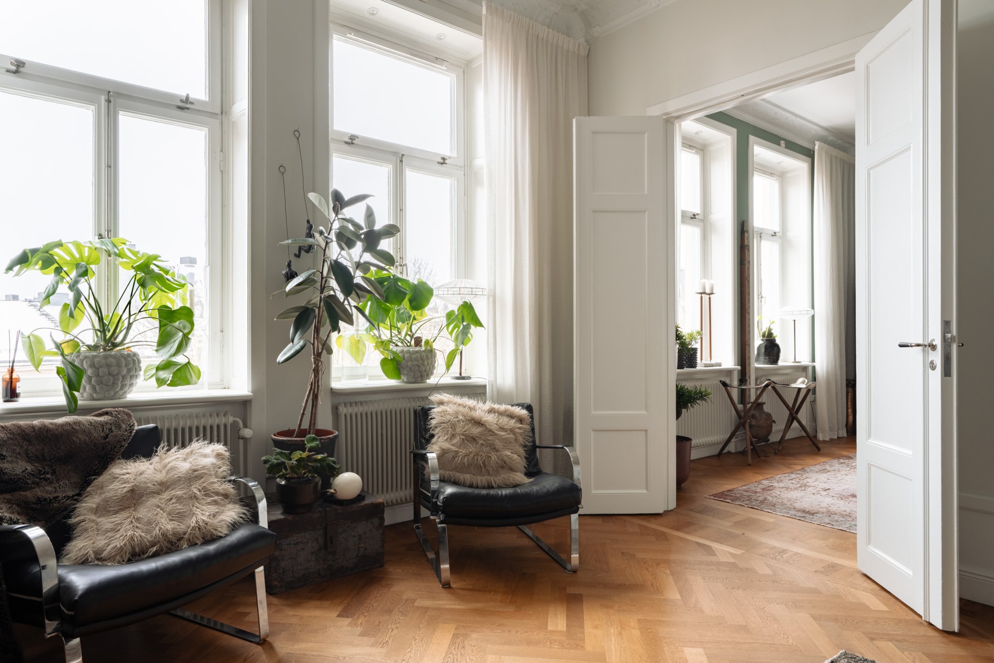Storslaget vardagsrum med generöst ljusinsläpp från stora fönster i söderläge. Högt i tak, vackra stuckaturer och gott om plats för möblering helt efter egen stil och behov.