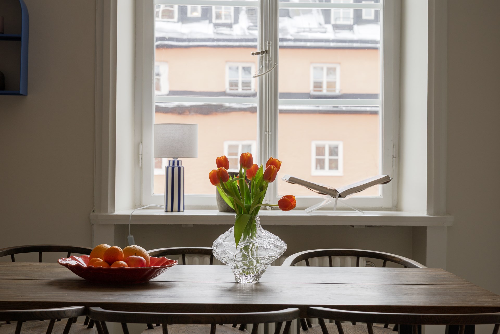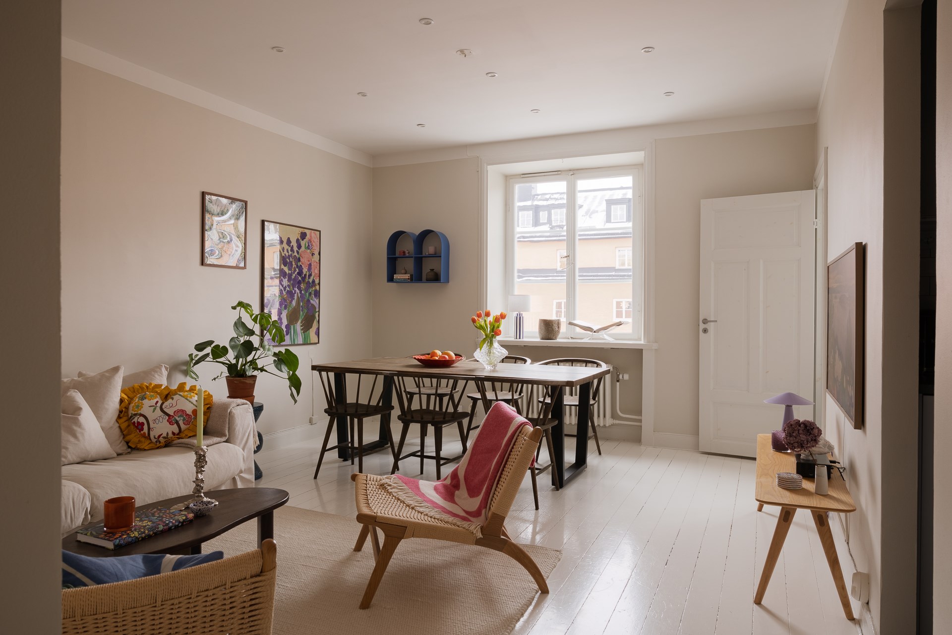Luftigt sällskapsrum i anslutning till köket vilket ger stora umgängesytor. Spröjsat fönster som vetter ut mot Katarina Bangatas grönska och med mycket himmelskontakt. Generös takhöjd med infällda spotlights och ljusa väggar.