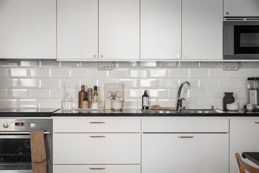 Ett riktigt familjekök! Smakfullt inrett i sval nordisk design med vita snickerier från Vedum, kaklat stänkskydd och arbetsbänk av svart granit med generös dubbelho. Mycket bra förvaring i flera skåp och lådor och med infällda spotlights under skåp. Full maskinell utrustning från Electrolux med induktionshäll, varmluftsugn, micro, fläkt samt integrerad kyl/frys och diskmaskin. Luftigt och lättarbetat kök med goda arbetsytor och plats för ett stort matbord för hela familjen.