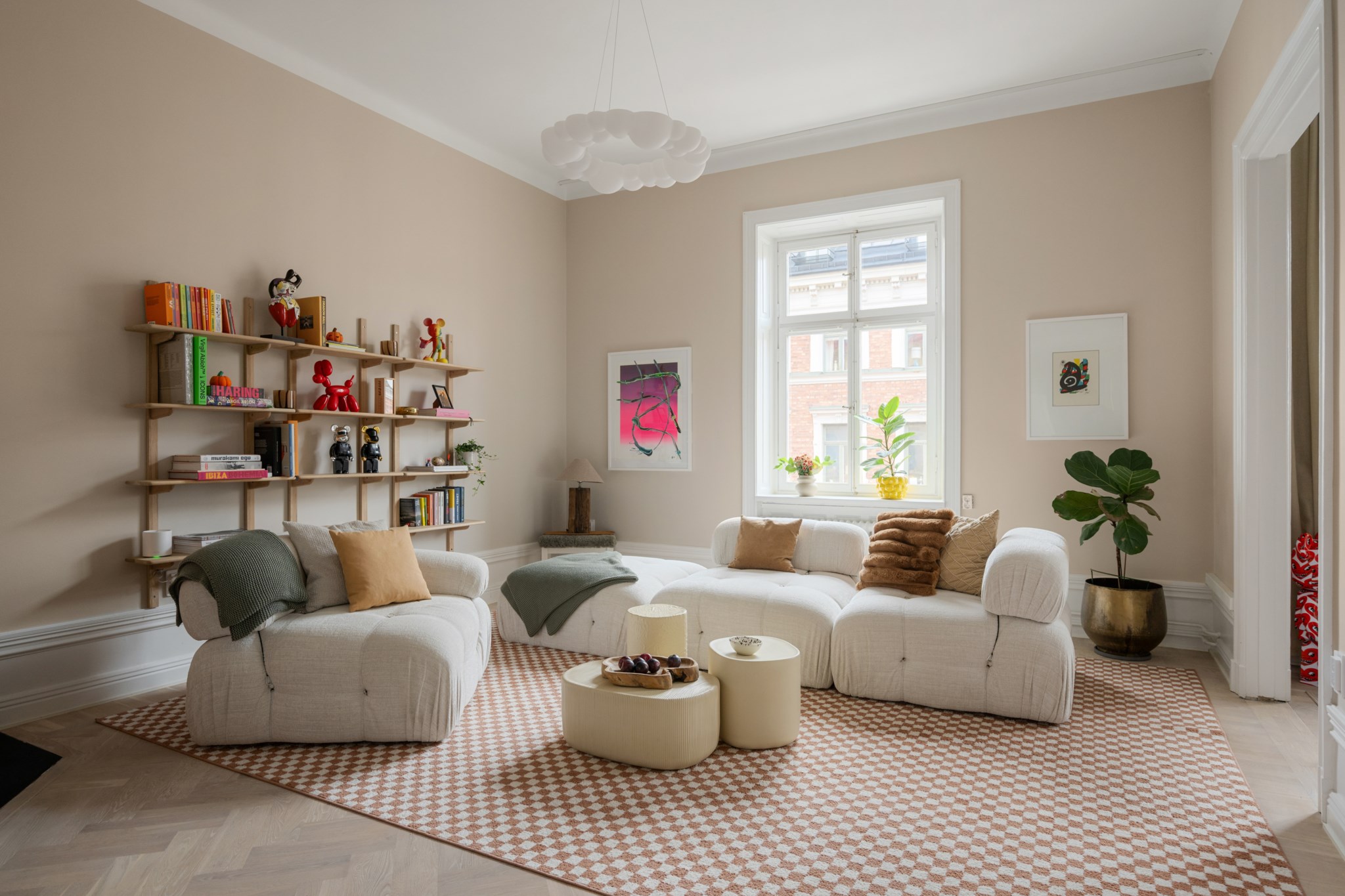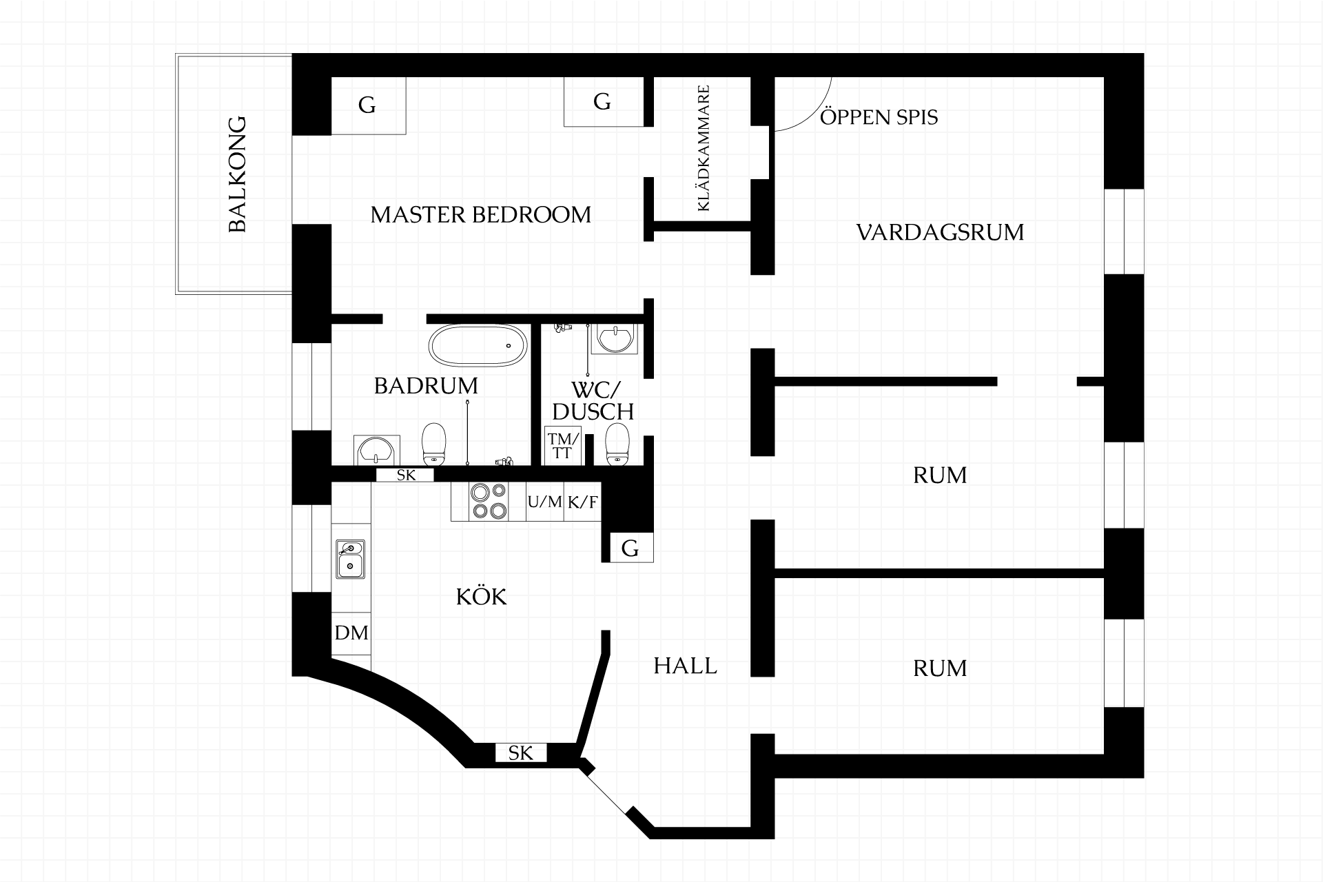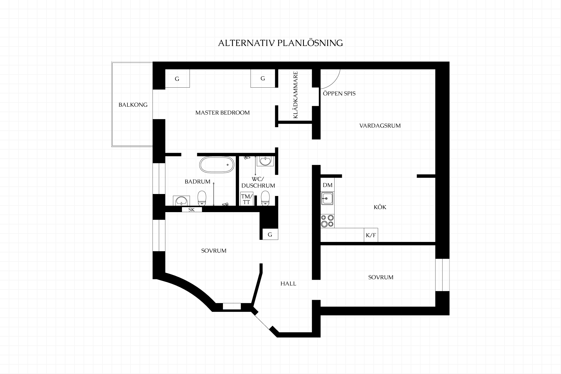 Den genomgående planlösningen är väl avvägd med tre sovrum varav ett idag nyttjas som matsal, platsbyggt och stilfullt kök och vardagsrum med stora sällskapsytor där den fullt fungerande öppna spisen tronar sig upp i bakgrunden. Från master bedroom som är en suite nås balkongen. Ljuset rör sig generöst genom rummen tack vare den höga takhöjden och fönster i två väderstreck. Platsbyggda garderober i master bedroom och walk-in-closet bidrar till att maximera förvaringsutrymmet. Badrummet erbjuder vardagslyx med både duschhörna och badkar samt värmande golvvärme. Ett andra badrum i hallen med dusch och tvättpelare ökar bekvämligheten ytterligare.