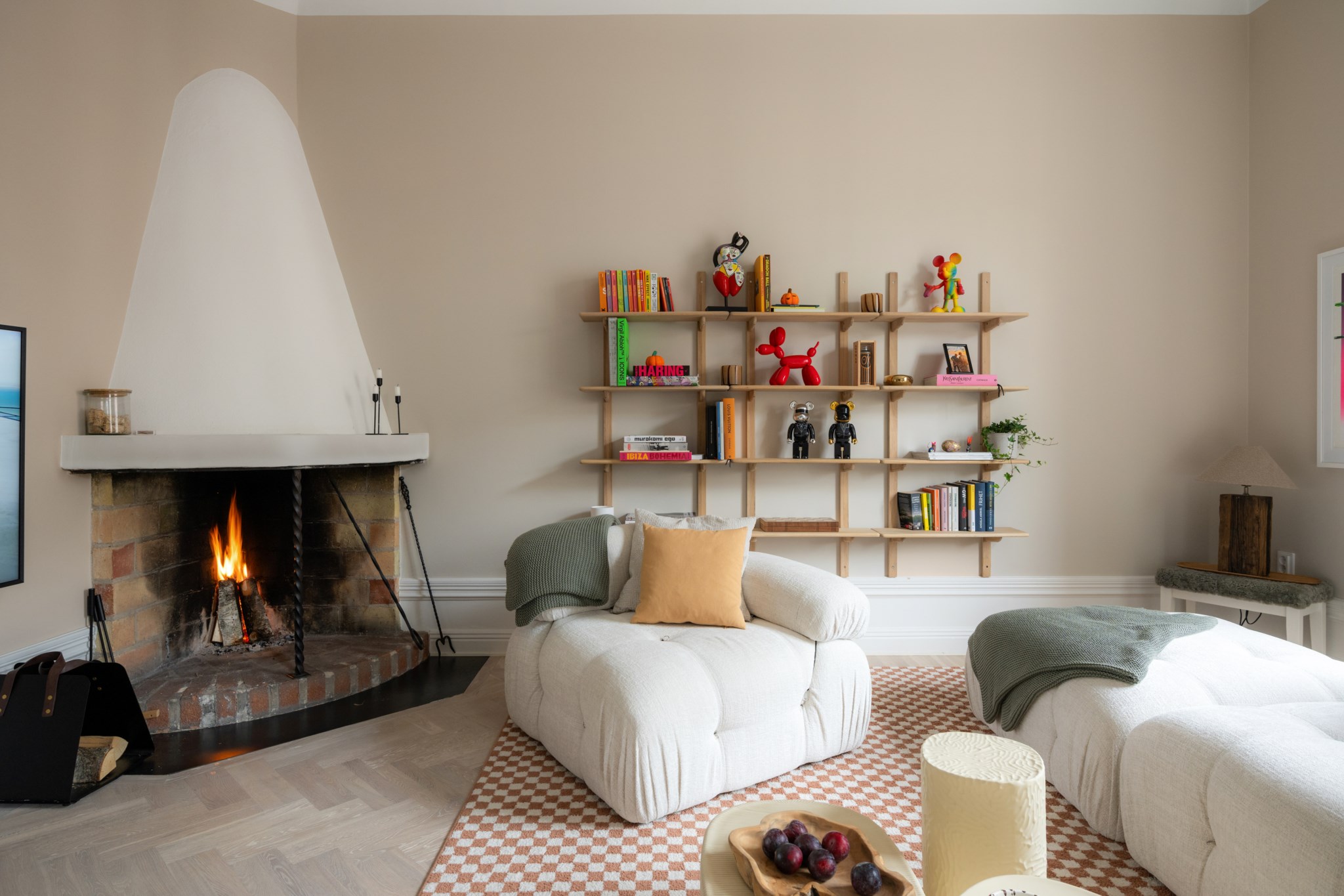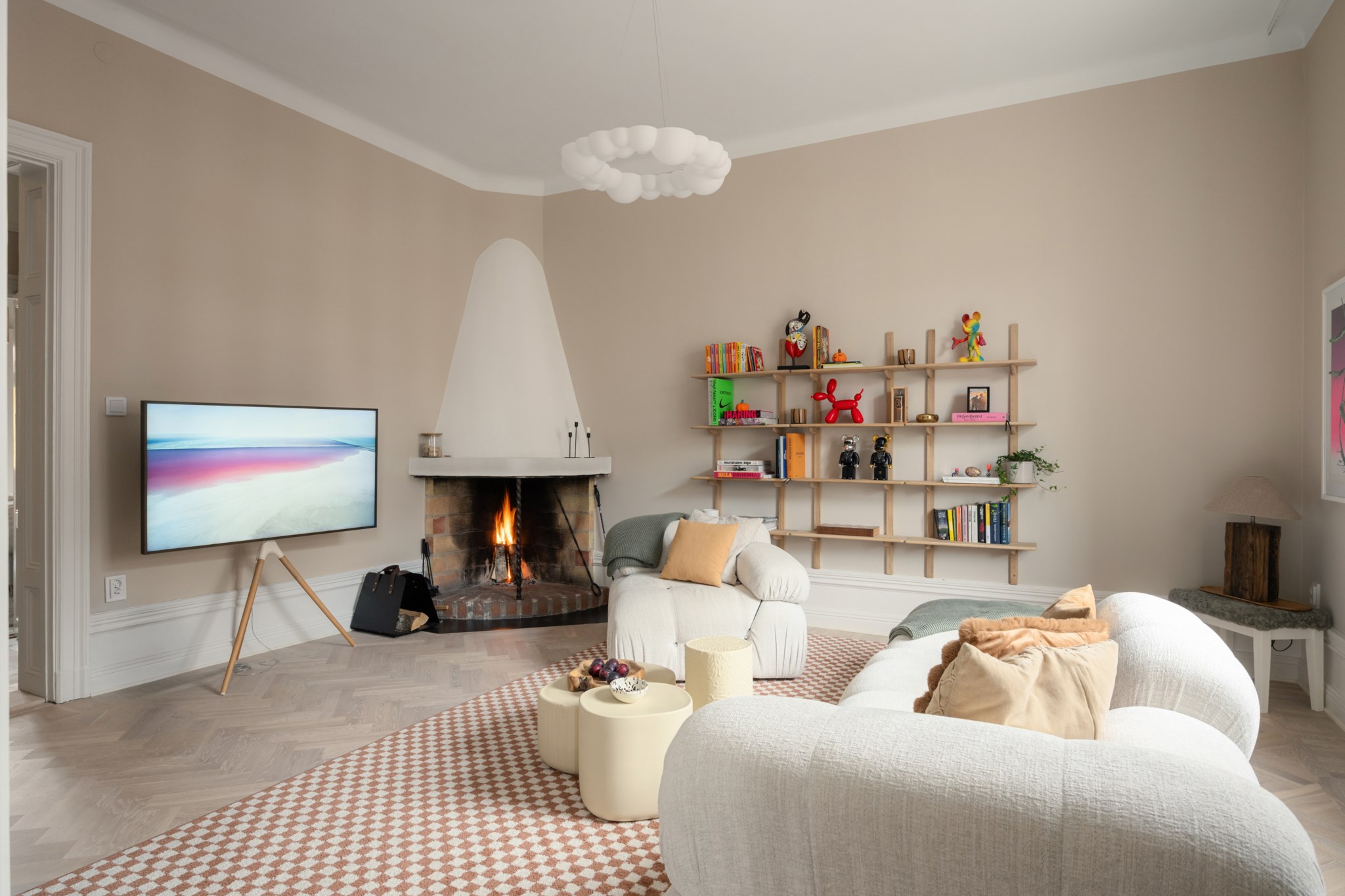 Väldisponerat vardagsrum med gott om utrymme för både soffgrupp och mediamöbel. Stora fönster skapar ett härligt ljusinsläpp och i kombination med den imponerande takhöjden på över 3,2 meter skapar det en känsla av rymd. Den vackra fiskbenmönstrade parketten och den sobra grå tonen på väggarna tillsammans med de vita snickerierna skapar en elegant och sofistikerad atmosfär. Runt den öppna spisen finns den givna samlingspunkten och många timmar mys spenderas i skenet av den.