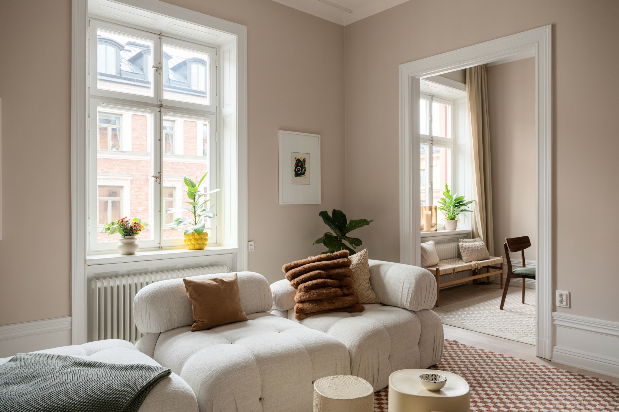 Det andra sovrummet som ligger i fil med vardagsrummet har ett stort fönster och nyttjas idag som matsal. Fiskbensmönstrade parketten och de gråa väggarna återkommer även här och ger en varm och lugn känsla.