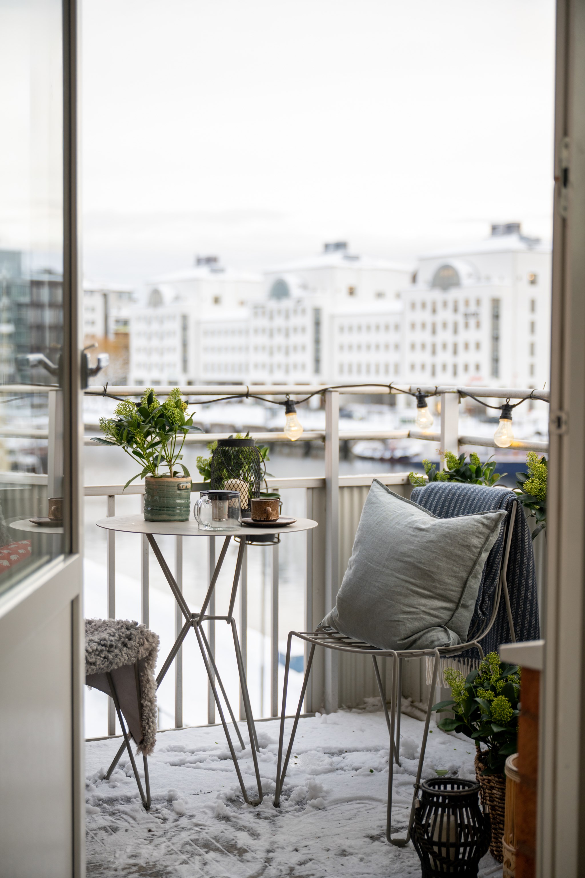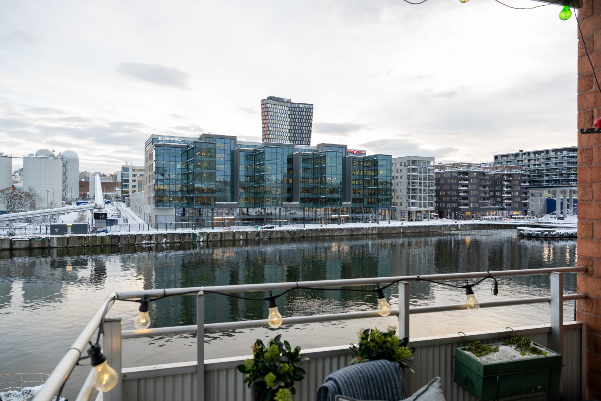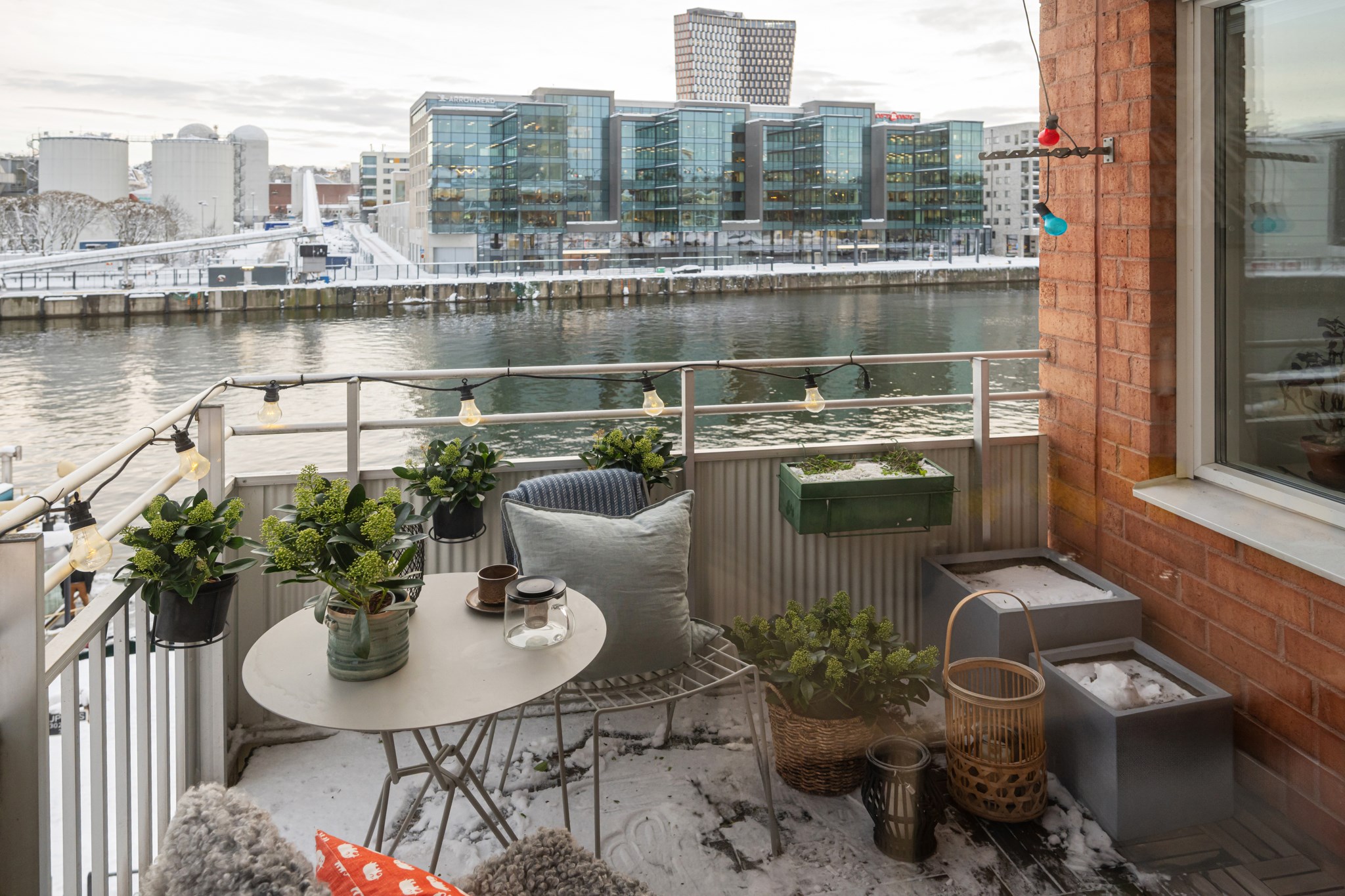 Från vardagsrummet nås den ljuvliga balkongen med magisk utsikt över kajen och vattnet i Hammarby sjö. Gott om plats för balkongmöbler att sitta och njuta i under ljuva sommarkvällar finns. Här tröttnar man aldrig på att blicka över båtlivet.