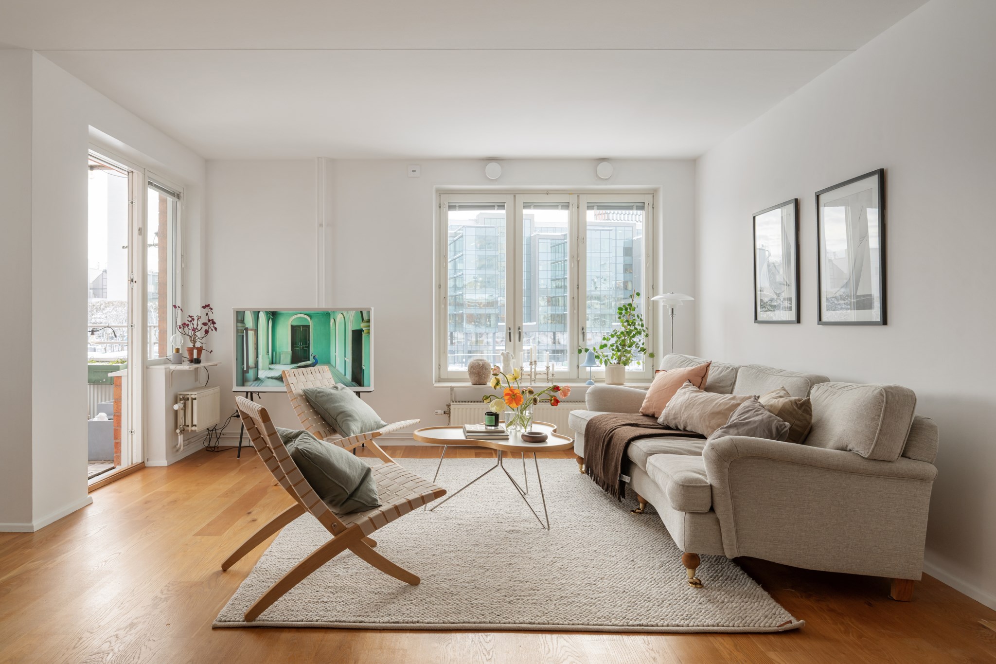 Vardagsrummet som går i en halvöppen planlösning mot köket inbjuder till social samvaro och skapar rymd. Detta i kombination med många fönster, det fria läget och kanalutsikt får ljuset att flöda och skapar en oslagbar känsla. Bostaden är perfekt för det sociala paret som inte ger avkall på komfort eller luftiga ytor men för den som har behov av fler rum går det enkelt att sätta upp en vägg och på så sätt skapa fler sovrum (se alternativ planlösning).