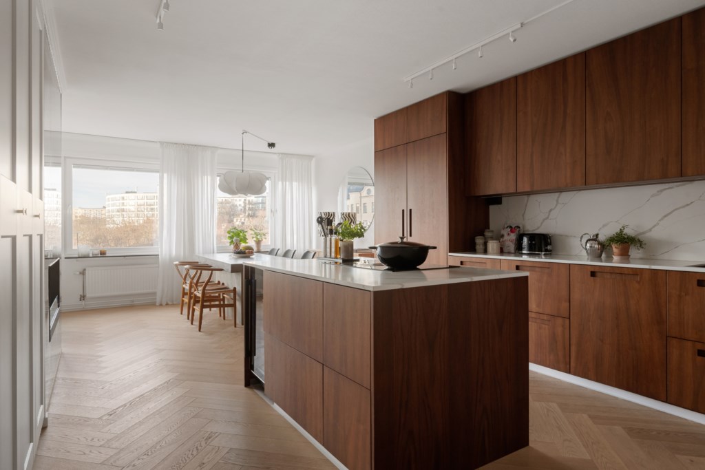 Planlösningen är ljus och genomgående från gården till gatan, den är utmärkt disponerad och utgör en del av husets gamla paradvåning från 1700-talet. Härligt, öppet och platsbyggt sällskapskök som snickeritillverkats och inretts i klassisk och lantlig stil och ger en känsla av svunna tider. Bänksskivor i gotländsk kalksten och komplett maskinell utrustning. Köket inbjuder till middagar och tillställningar i goda vänners lag. Här finns utgången till balkongen som ger en härlig förlängning av köket och som därmed förenar ute med inne.