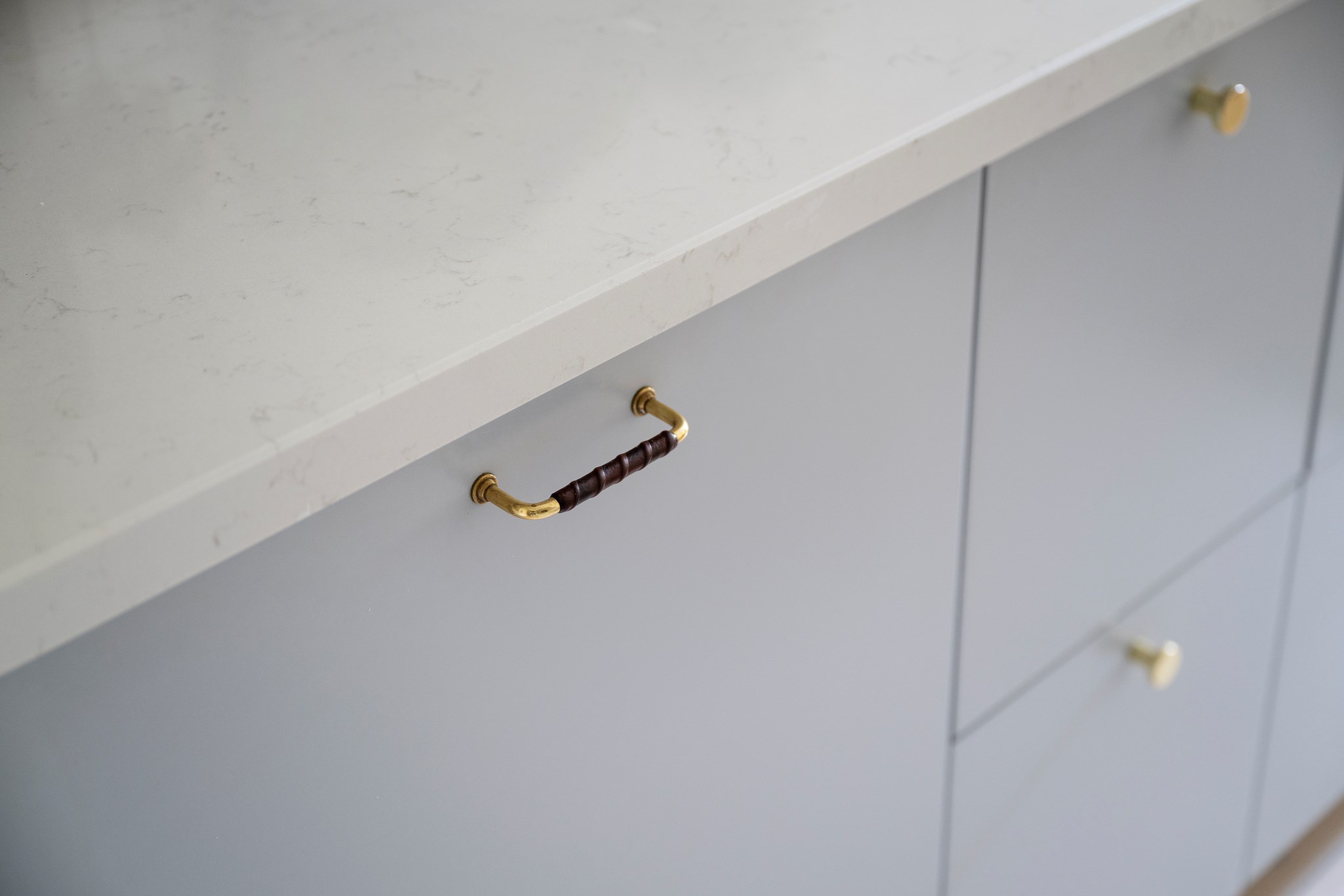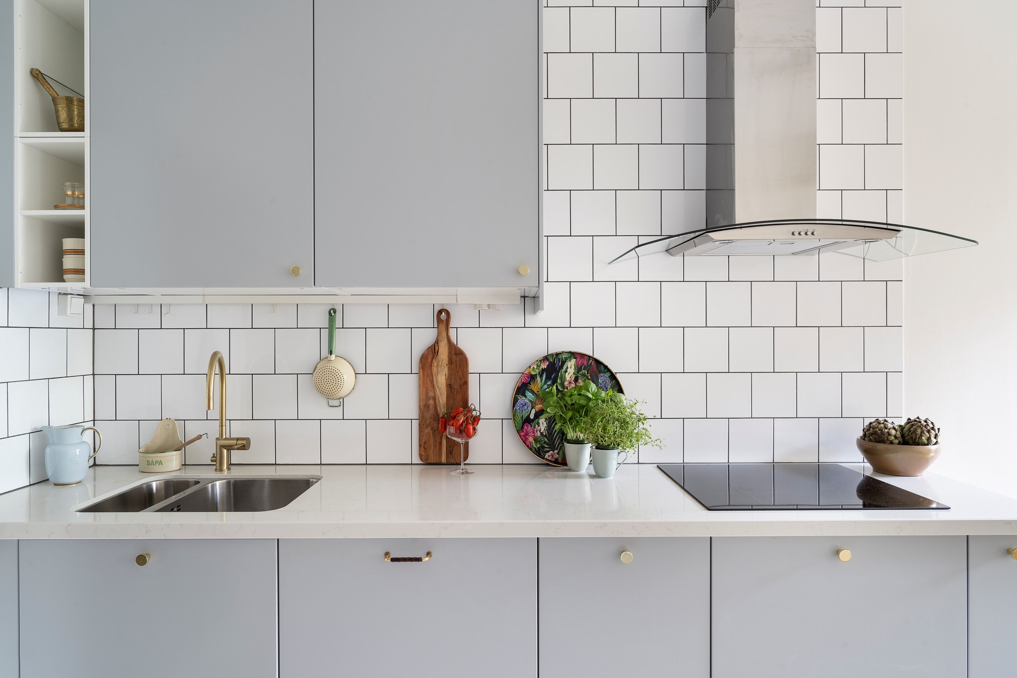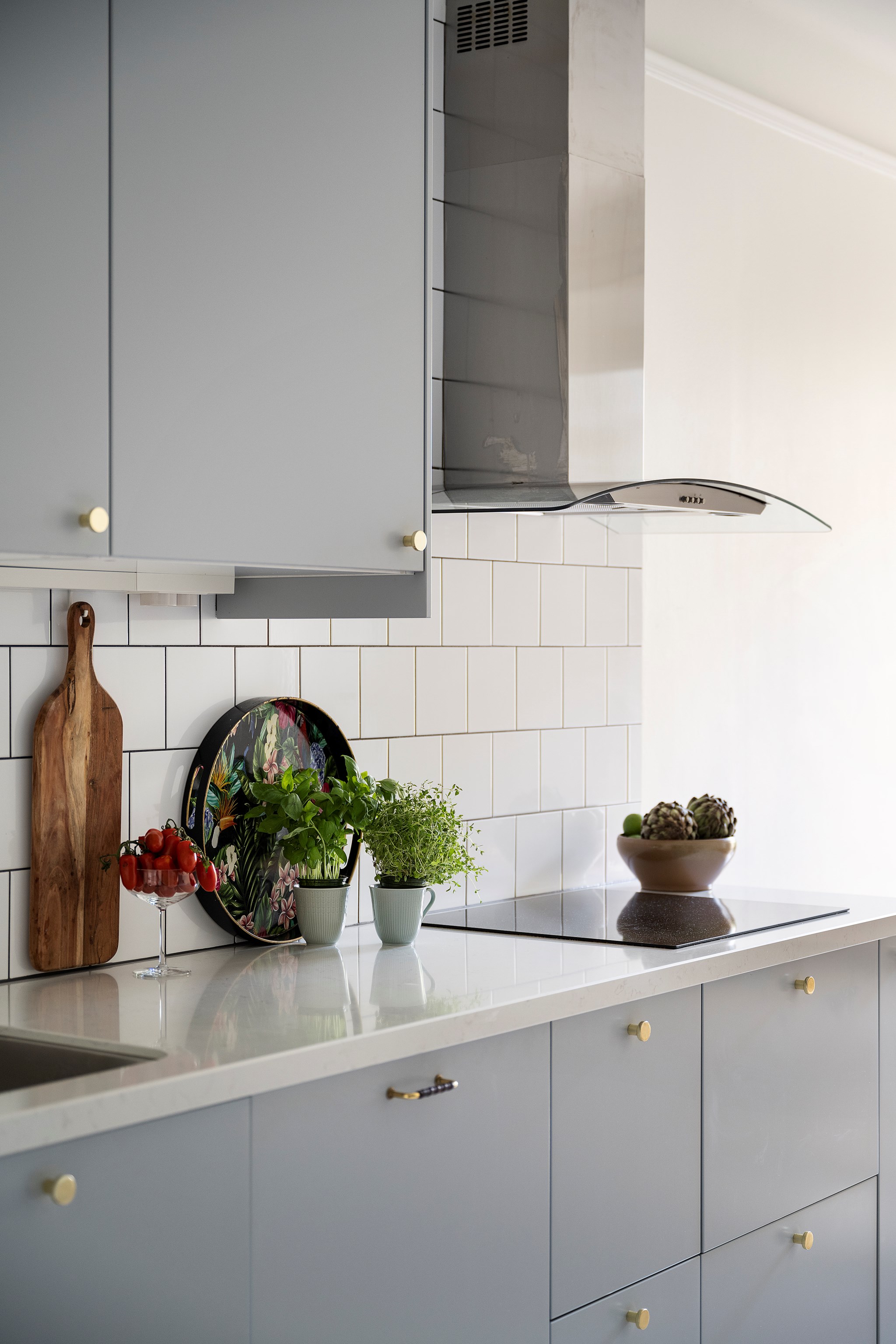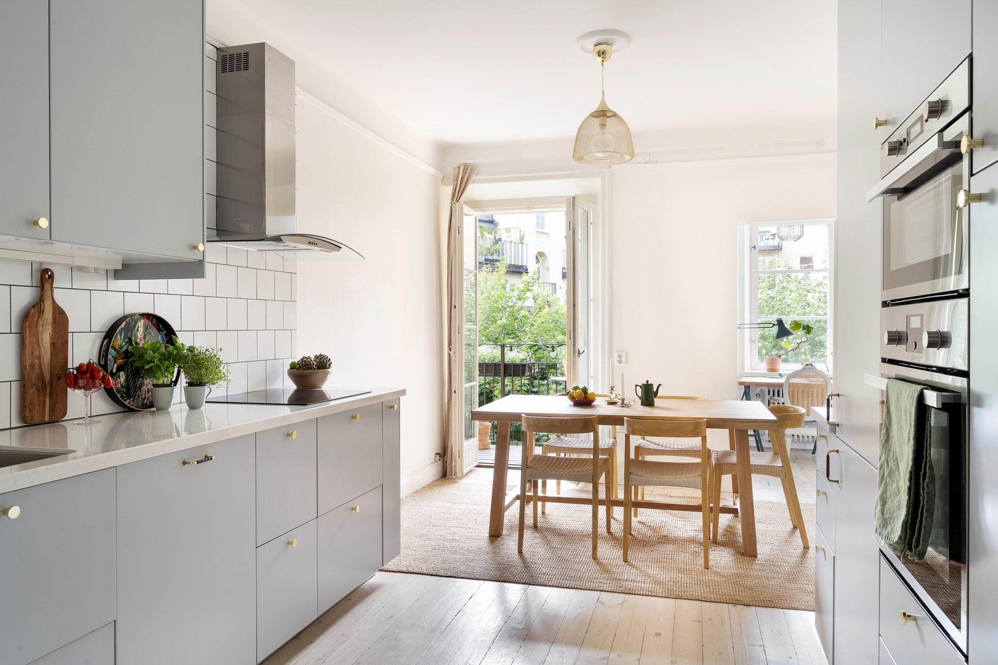 Ett stilfullt och funktionellt kök som renoverades 2017. Ljusgrå luckor och integrerade vitvaror ger ett enhetligt intryck och kombineras med gott om arbetsytor. Här finns plats för ett rejält matbord och rummet blir en naturlig plats för samvaro. Pardörrarna öppnar upp mot balkongen och förlänger köket under årets varmare månader.