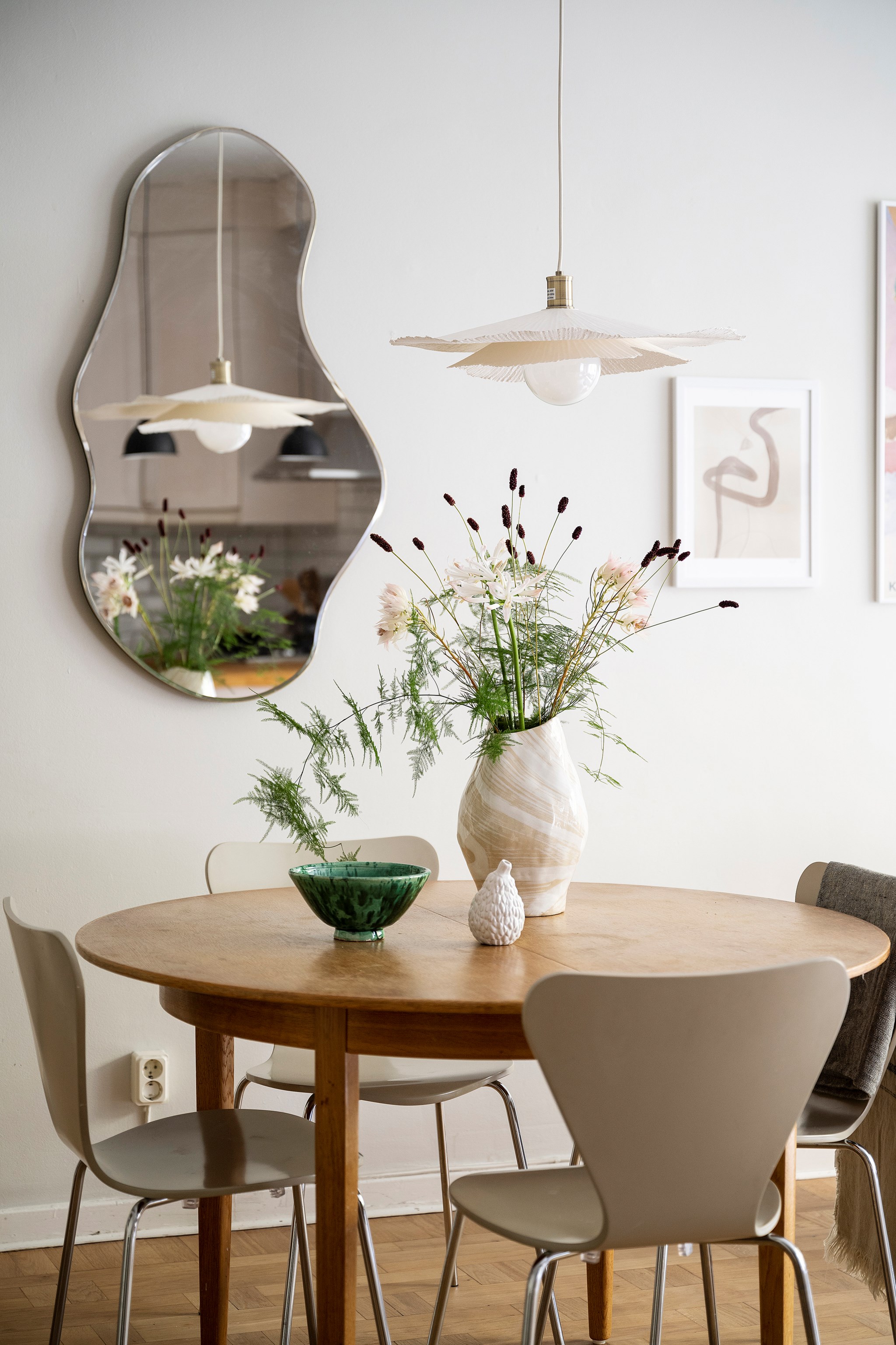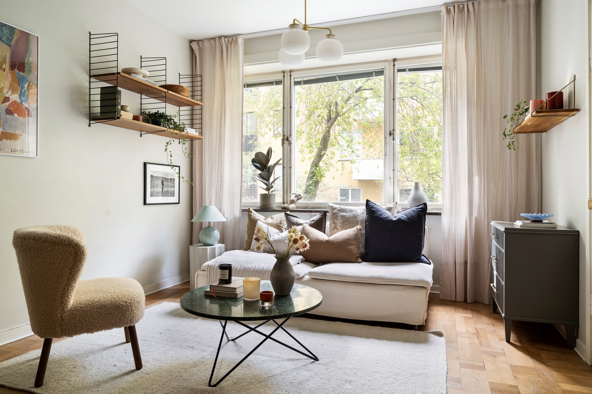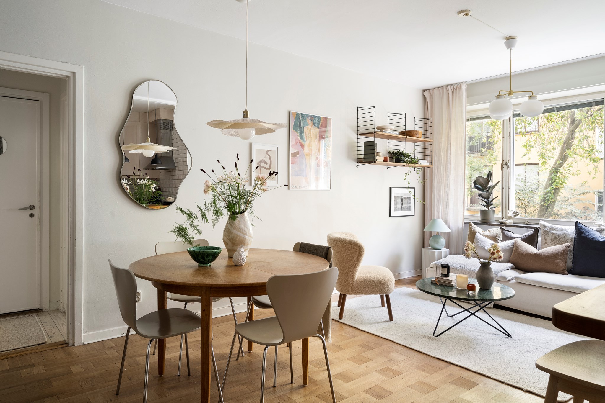 Lägenheten är ett strålande exempel på yteffektivitet där varje kvadratmeter tas tillvara. Två sovrum ryms utan att kompromissa med de sociala ytorna, och i vardagsrummet samsas soffa, matbord och fungerande öppen spis på ett naturligt sätt. Den öppna planlösningen mot köket gör det enkelt att bjuda in vänner till både middagar och spontana kvällar framför brasan. Här finns även gott om förvaring, både i hallens originalgarderober och i sovrummen, vilket gör hemmet lika praktiskt som trivsamt.