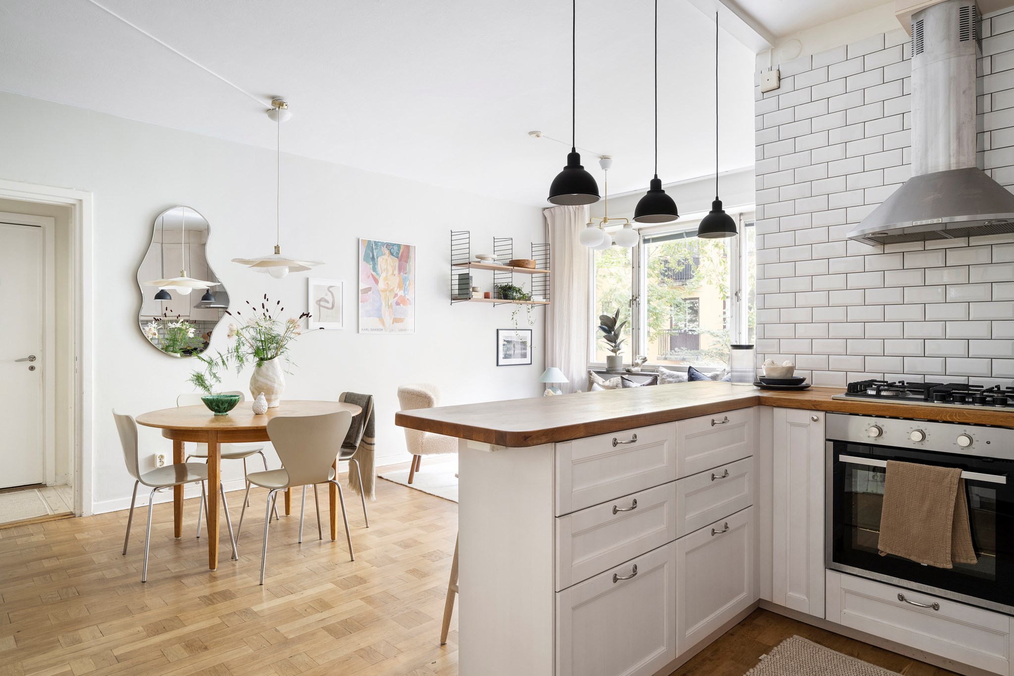 Trivsamt kök med bardisk som rymmer barstolar för vardagsumgänge. Förvaring bakom vita skåpsluckor, gashäll, ugn, fläkt, diskmaskin samt kyl och frys. Vita kakelplattor i klassisk tegelsättning upp till tak ger en tidlös karaktär och en skön atmosfär.