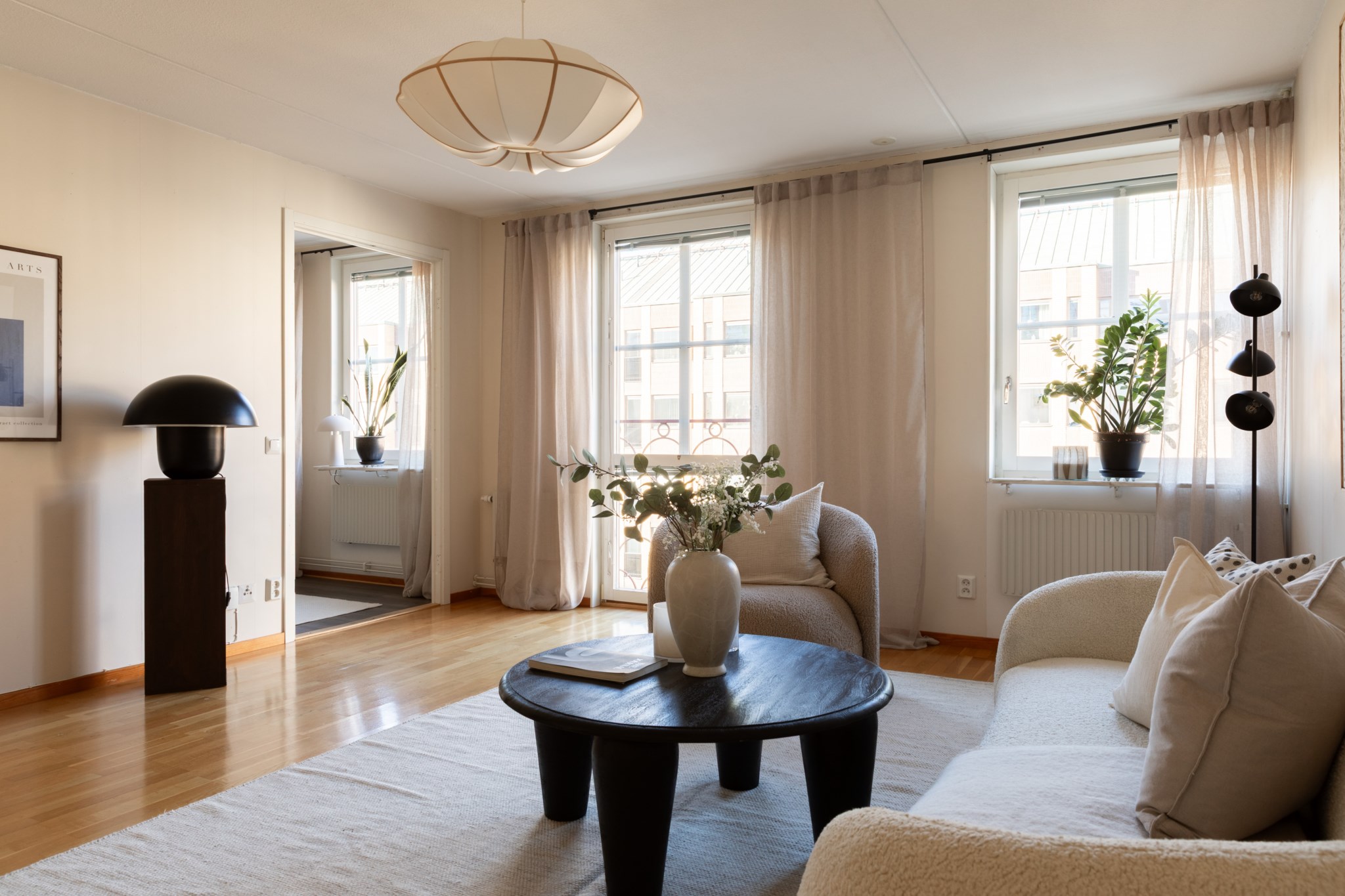 Den genomgående planlösningen skapar ett fint sammanhang mellan rummen som ligger i fil och ger bostaden ett naturligt flöde. De många fönstren bidrar med ett behagligt ljusinsläpp under dagens timmar och förstärker känslan av liv och rörelse. Dispositionen är flexibel och ger utrymme att forma hemmet efter egna behov – oavsett om fokus ligger på sociala ytor, fler sovrum eller generösare arbetsplats.