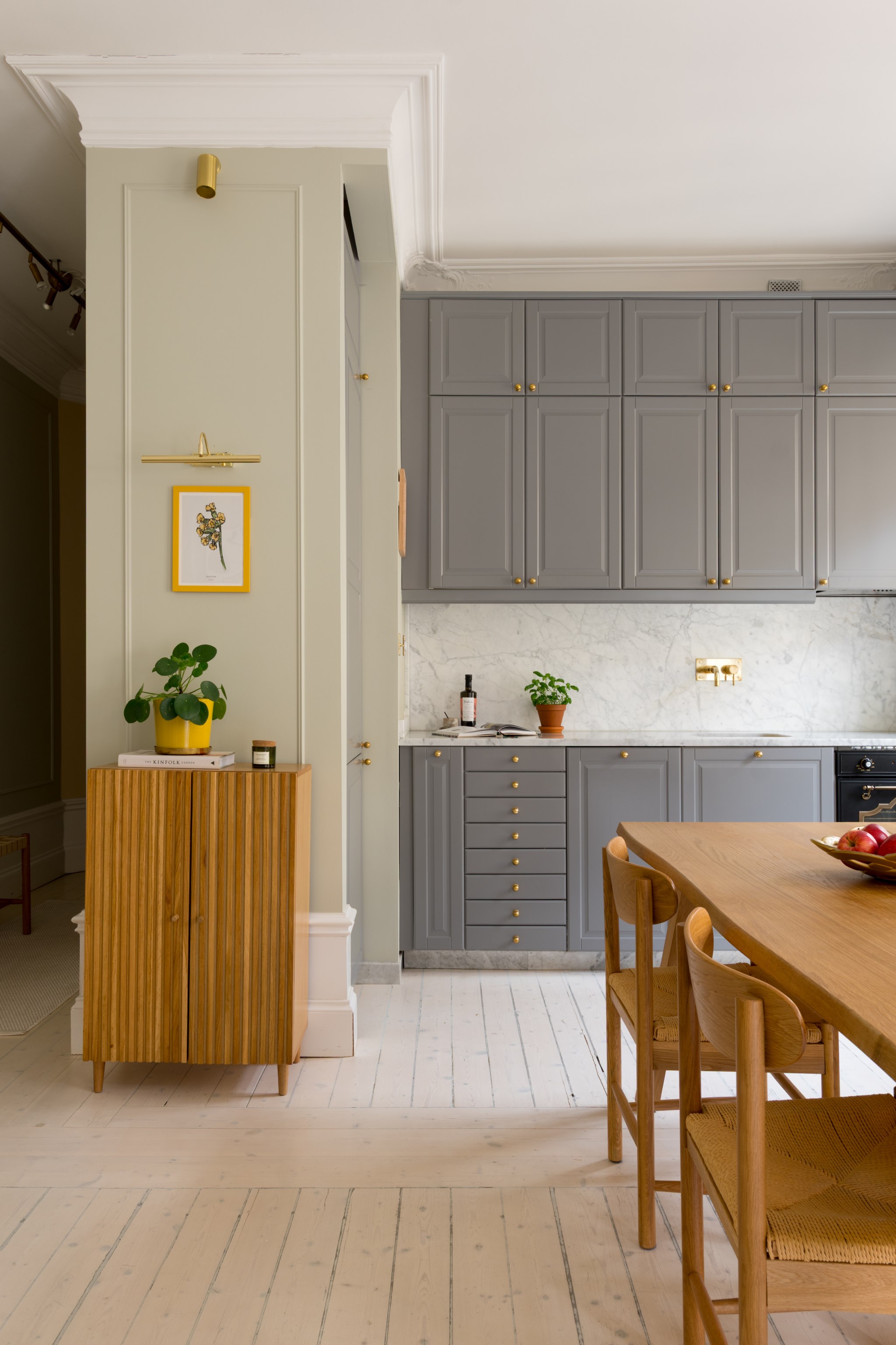 Stilrent kök i öppen planlösning till vardagsrum. Köket har gott om förvaring bakom grå köksluckor och gott om arbetsyta på bänkskiva i marmor. Köket är utrustat med spis, ugn, fläkt, diskmaskin och kyl/frys. Fint ljusflöde från fönster i fil och de helglasade pardörrarna till balkongen.