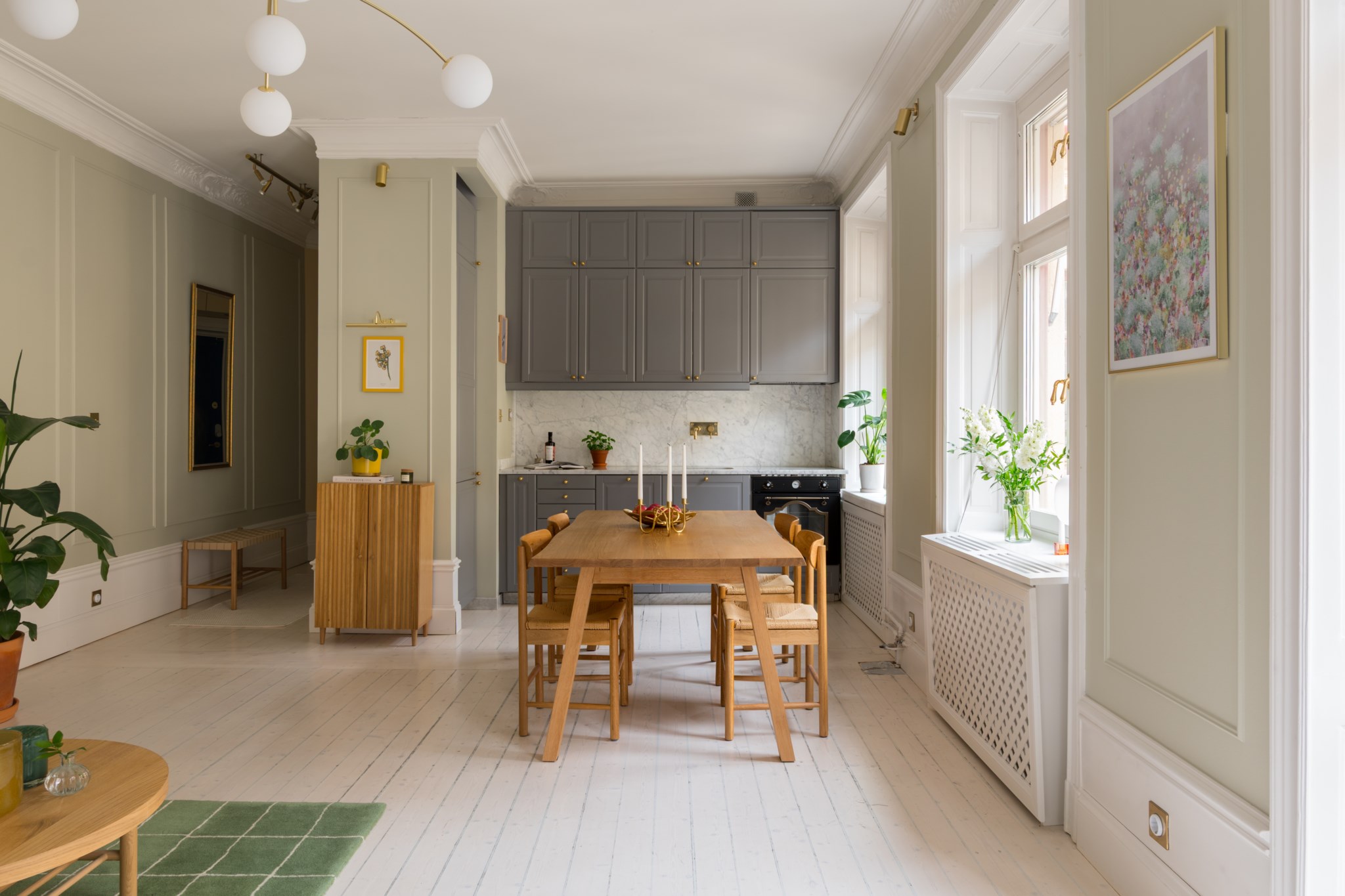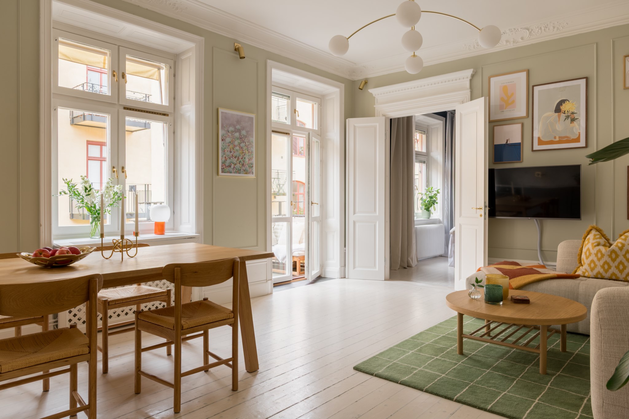 Ljust och lättmöblerat vardagsrum som bjuder in till större sociala tillställningar. Vardagsrummet ligger i öppen planlösning till kök. Sobert färgsatta väggar i en grön kulör. De vackra sekelskiftesattributen och den generösa takhöjden ger rummet en härlig karaktär. Här finns det plats för en stor matplats för 6-10 personer, stor soffgrupp, fåtöljer och mindre möblemang. Fint ljusflöde från fönster och de helglasade pardörrar till balkongen. Samtliga fönster har markiser.