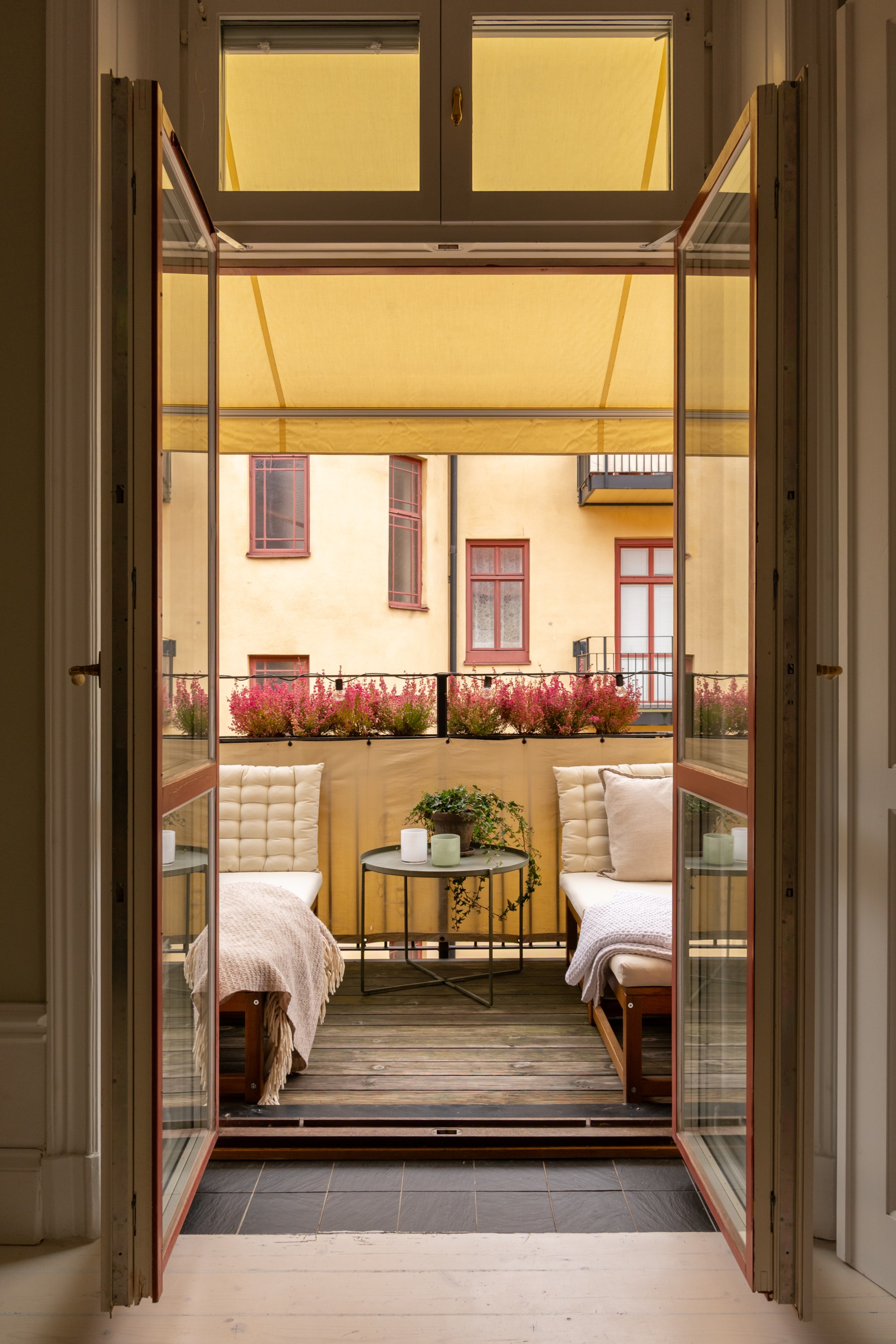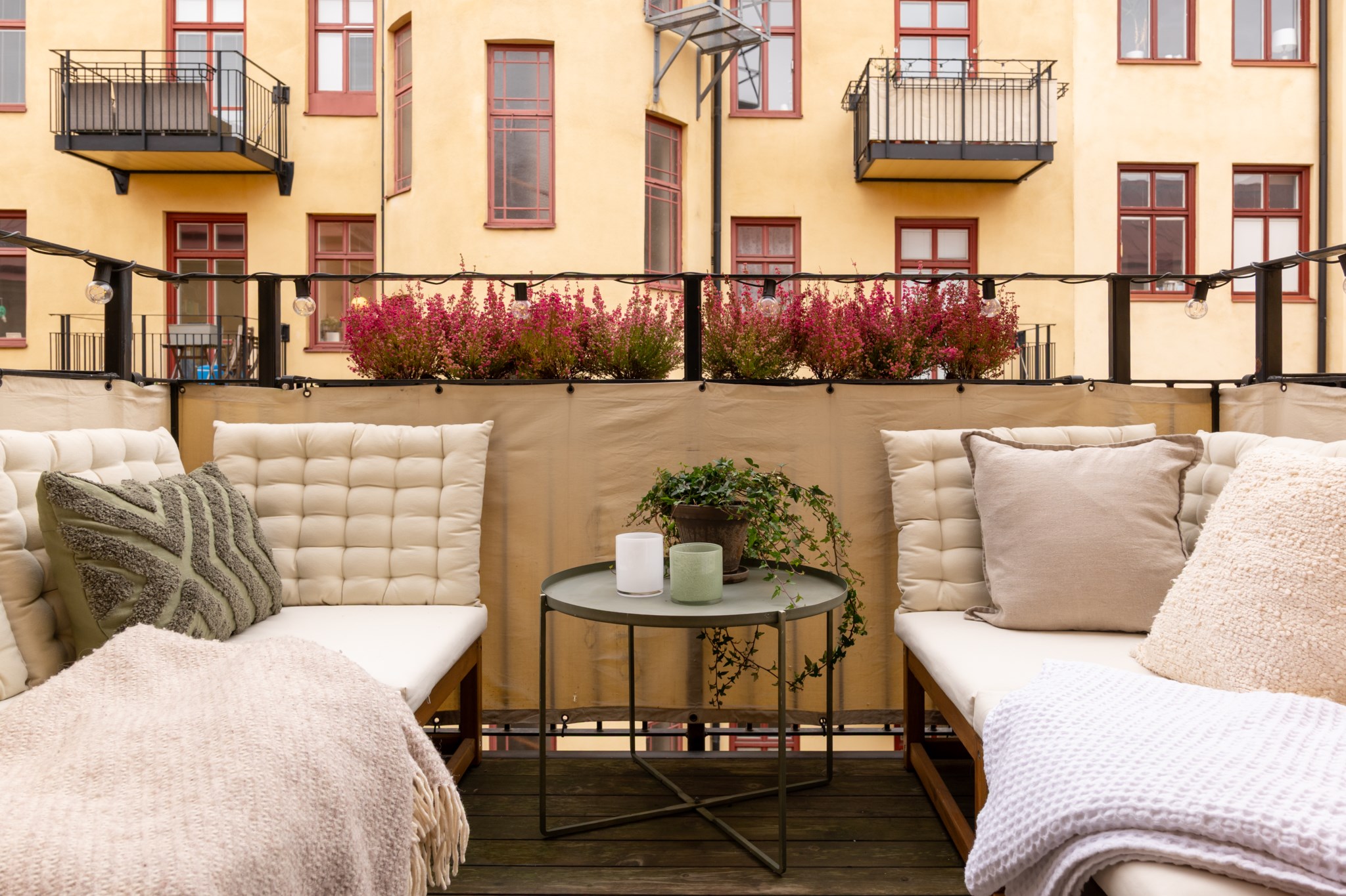 Solig och härlig balkong, högst upp i huset in mot gård. Balkongen och hela lägenheten vetter i söder och här har man sol från ca 09-19 sommartid. Här finns det plats för möblemang och planteringar. Markis finns.