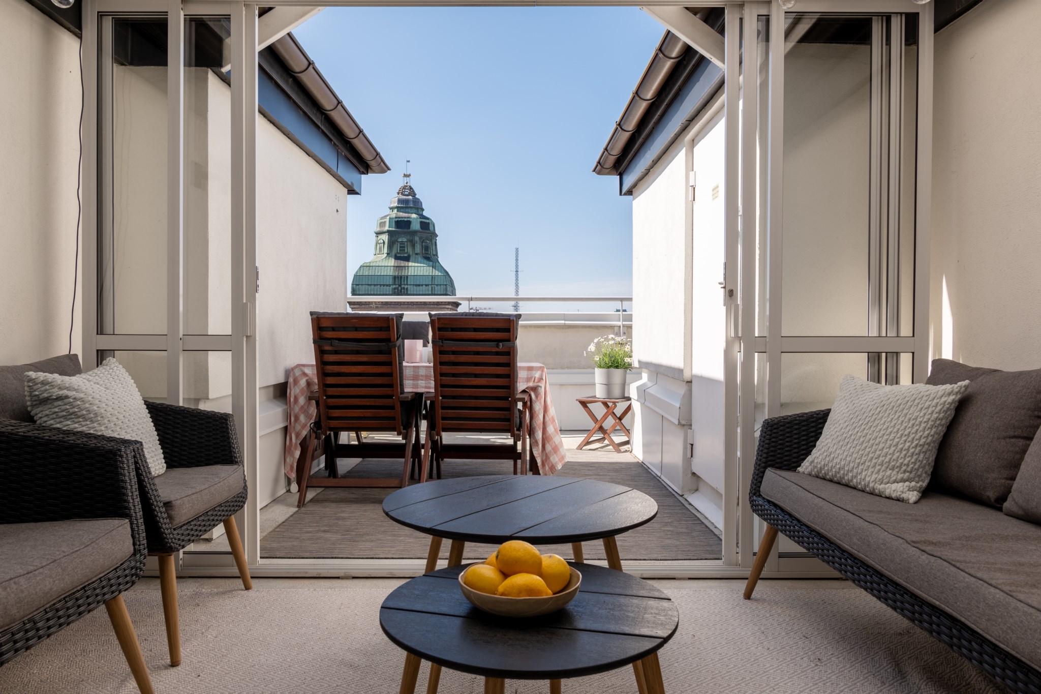 - Balkong med fantastisk utsikt över takåsarna i riktning mot city. Plats för bord, stolar och planteringar.
