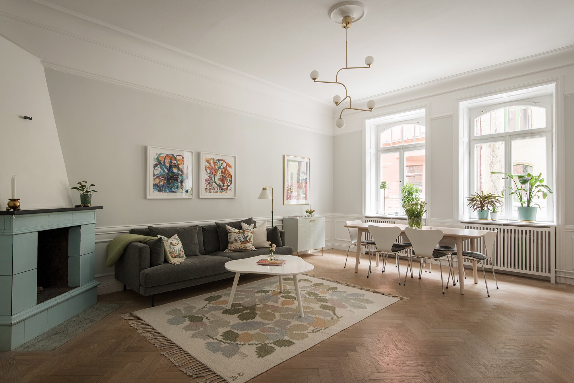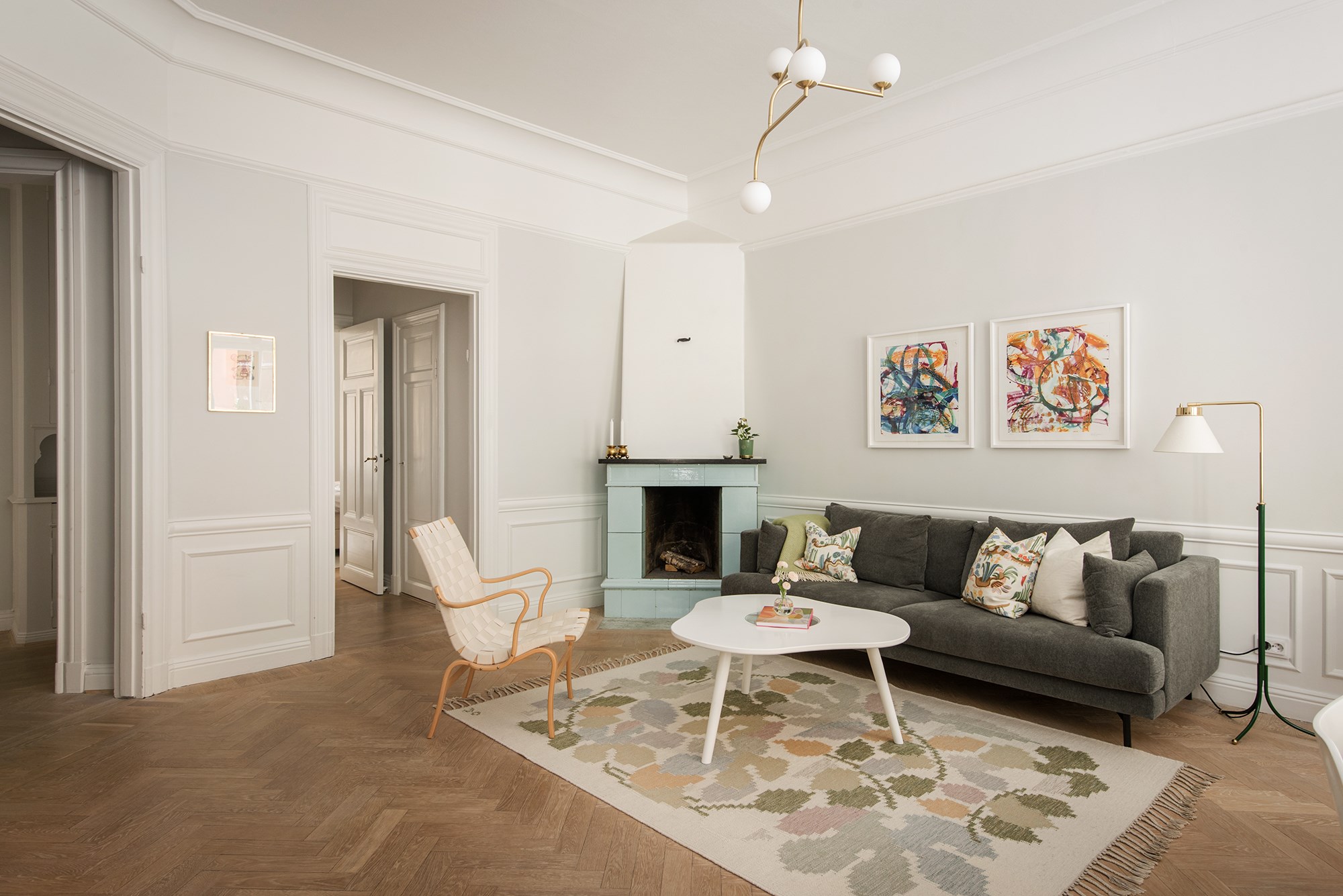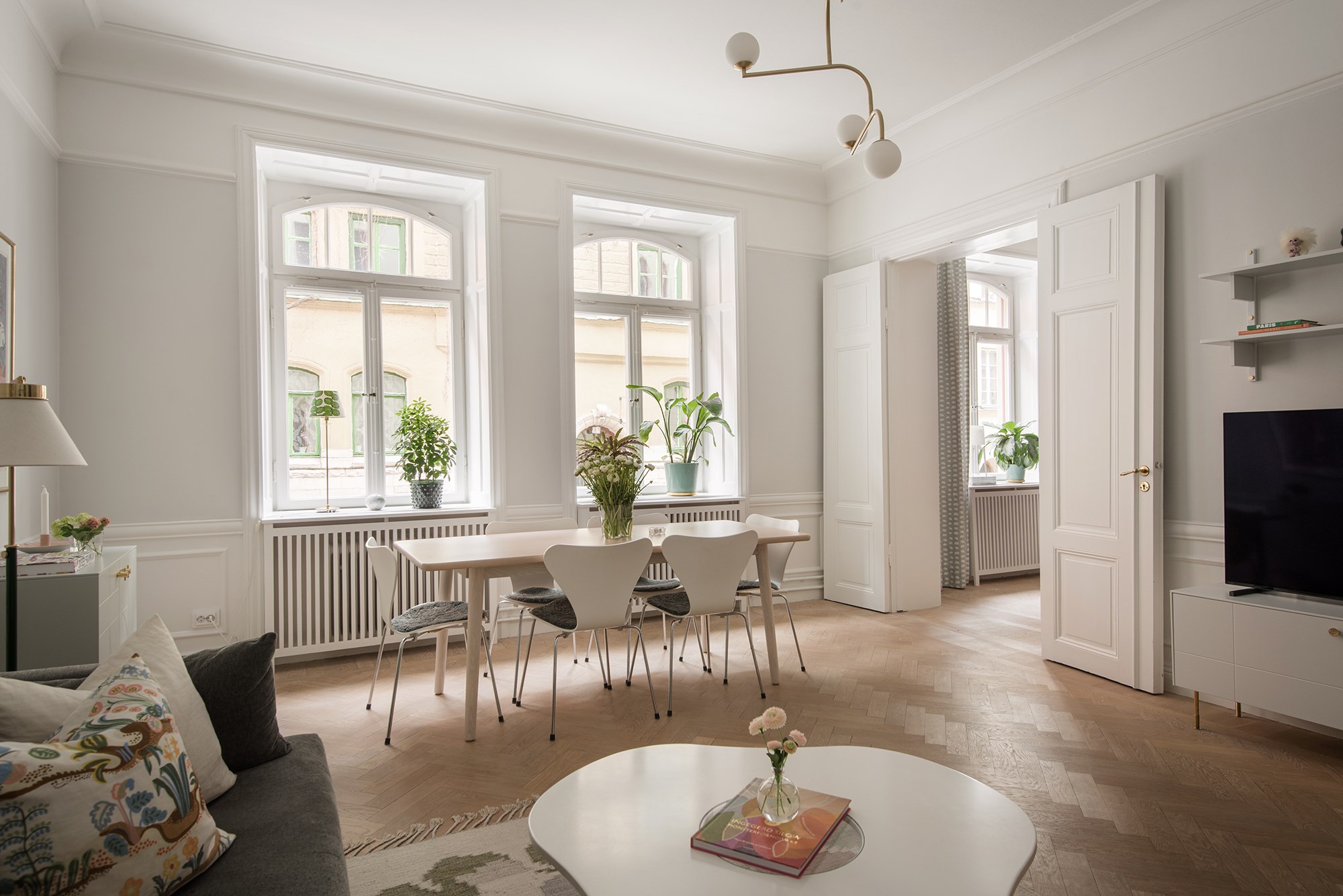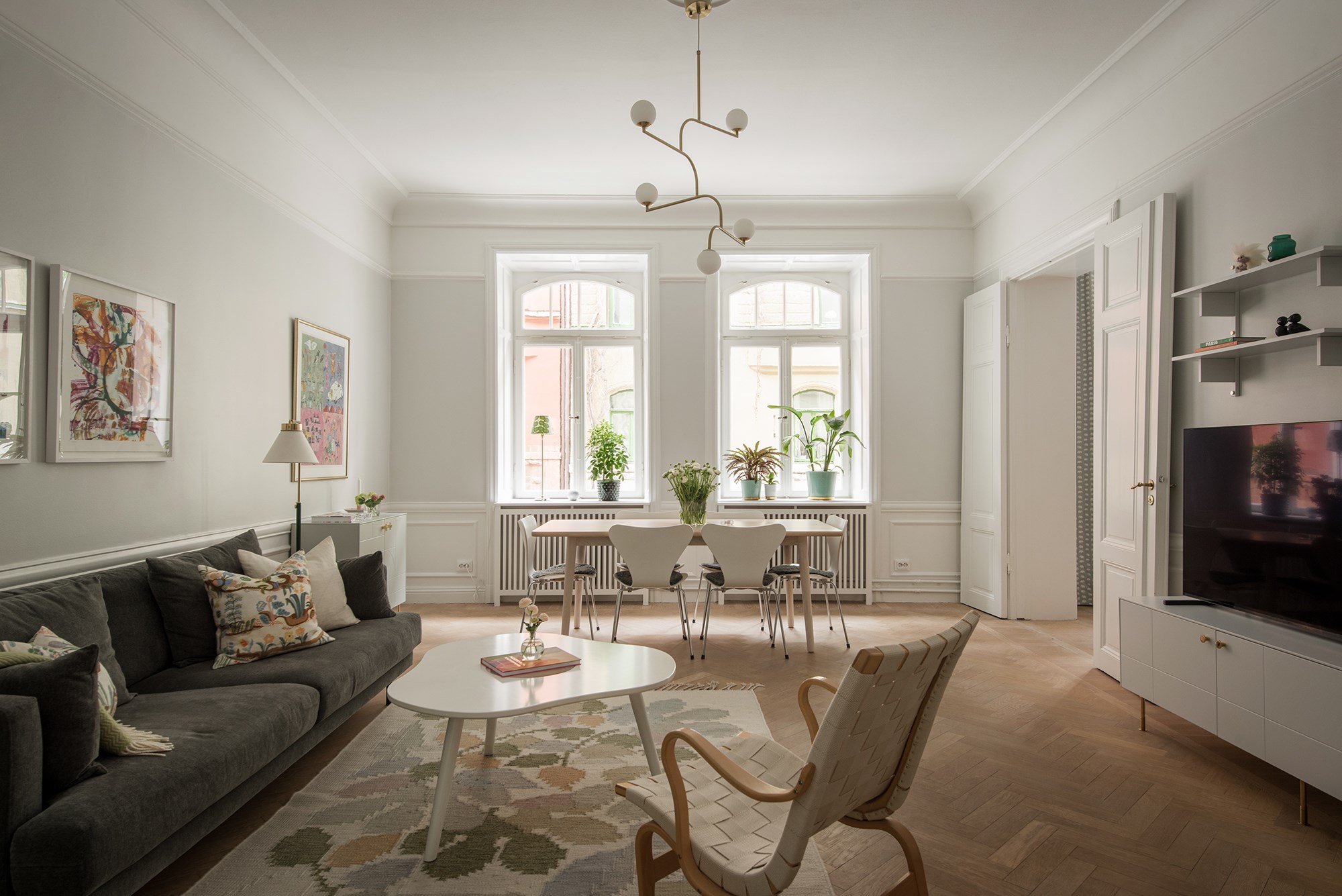 Här erbjuds magiskt sociala ytor med en planlösning som gjort för hemmamiddagar och mingel med familj och vänner! Bostaden är varsamt och stilfullt renoverad, som taget ur ett inredningsmagasin med sina sobra klassiska toner, exklusiva materialval och fina ljusinsläpp i två väderstreck. Representativt hem med bevarade detaljer från byggåret såsom dryga tre meter i tak, listverk, höga golvsocklar, speglade dörrar och pardörrar och stora fönsterpartier med djupa speglade nischer vilket ger en otrolig atmosfär.