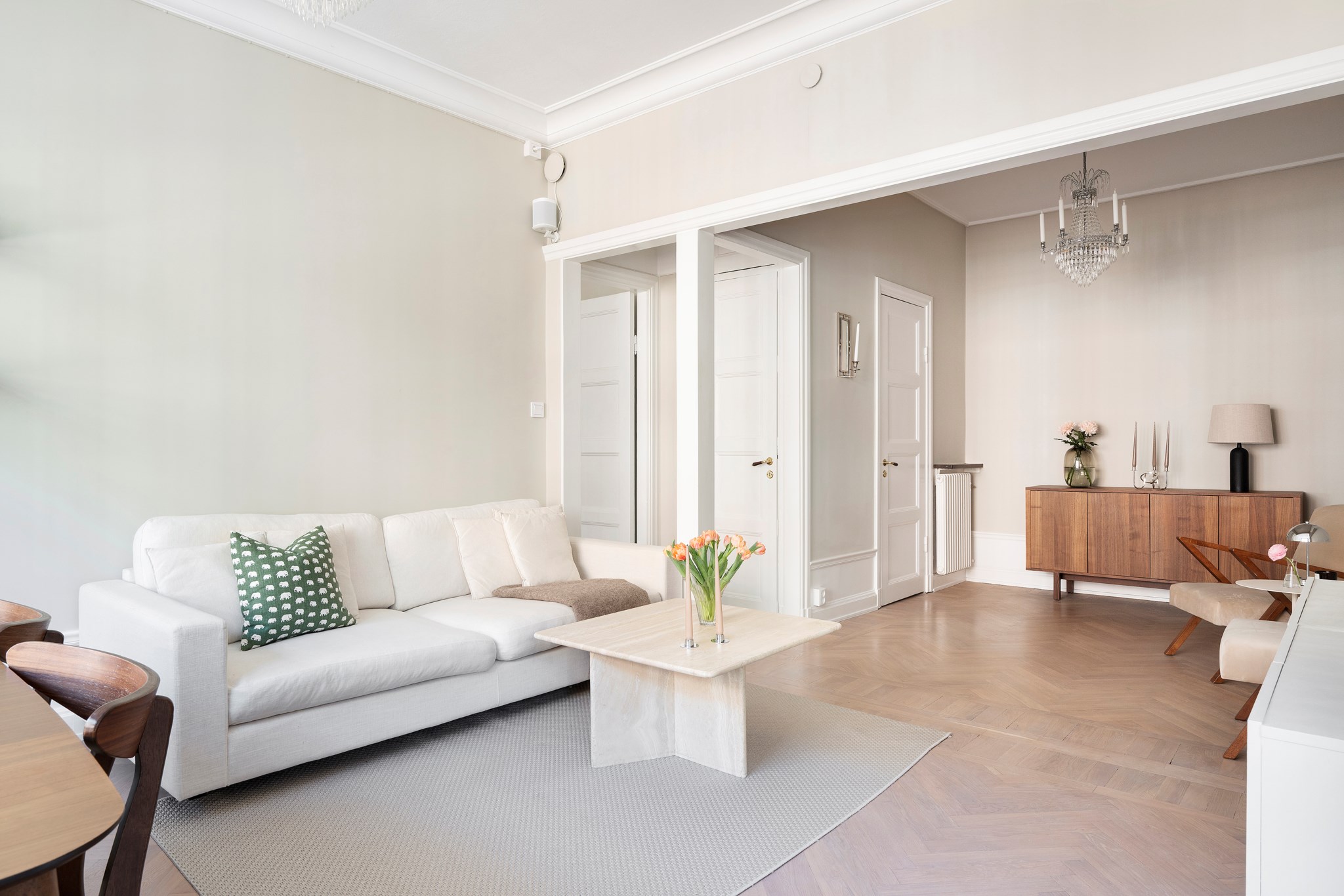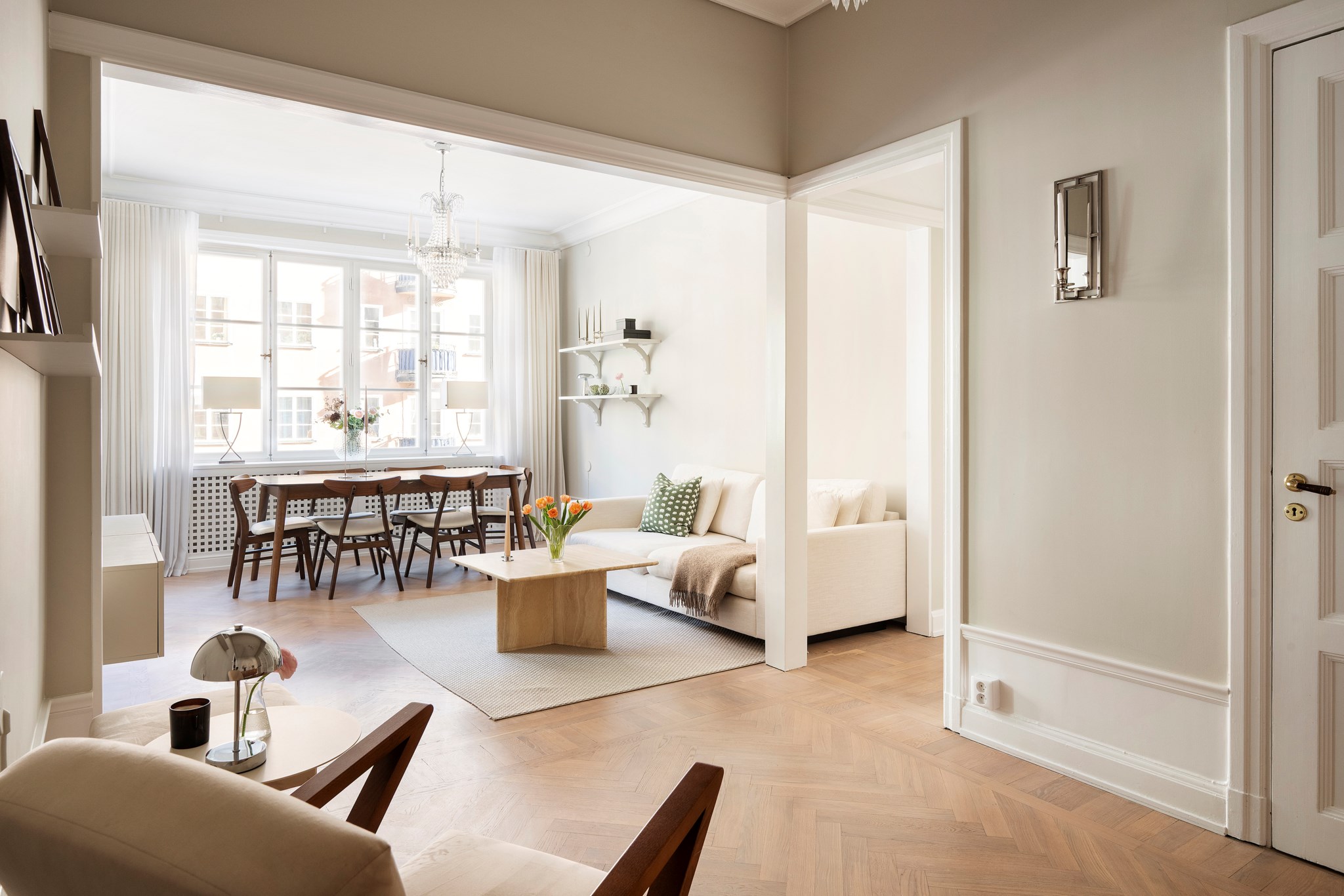 Ljust och lättmöblerat med plats för en större matgrupp, soffa, fåtöljer och mindre möblemang. Fantastiskt ljusinsläpp från stort fönsterparti.
