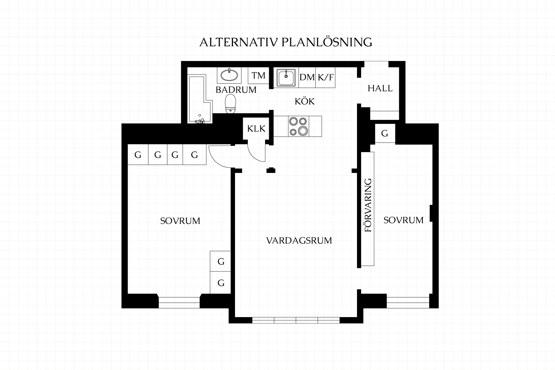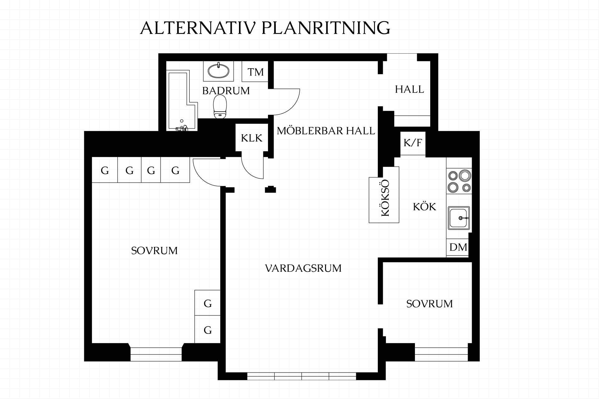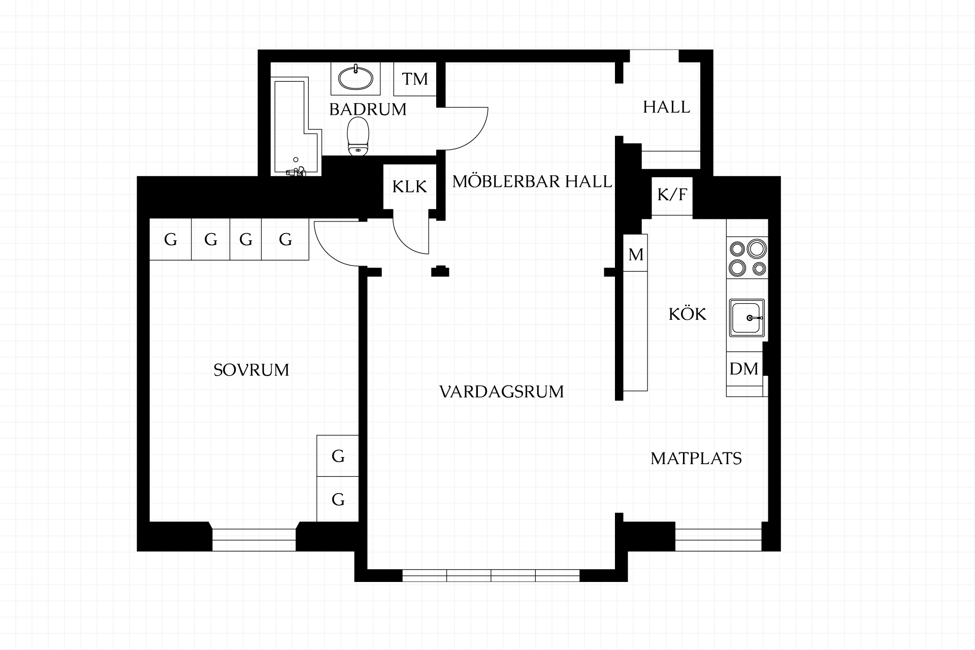 Stilrent kök med gott om förvaring bakom gråa skåpluckor. Köket är utrustat med spis, ugn, micro, kyl/frys och diskmaskin. I anslutning till köket finns det plats för en matplats. För dig som önskar göra lägenheten till en trea kan man enkelt nyttja ytan till att göra ett till rum.