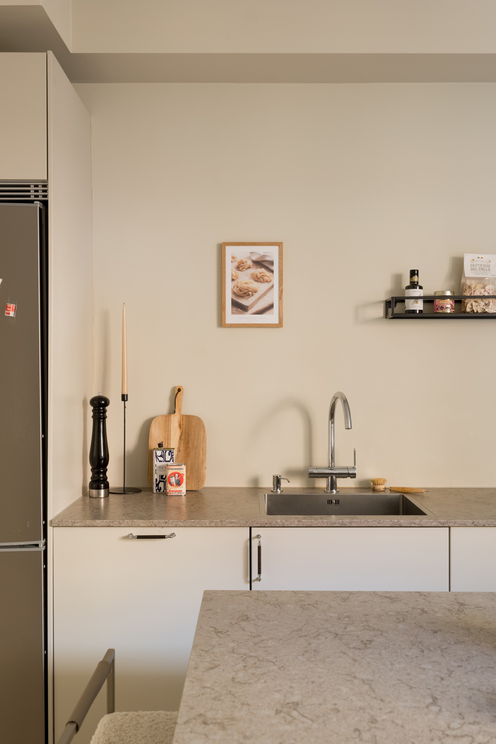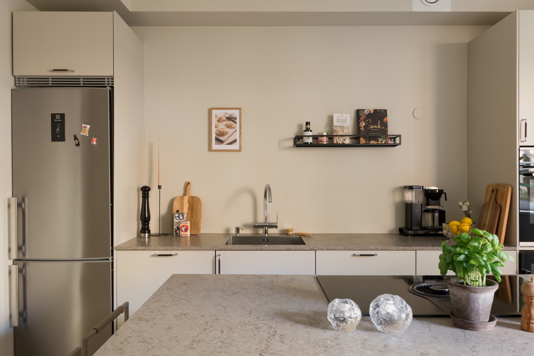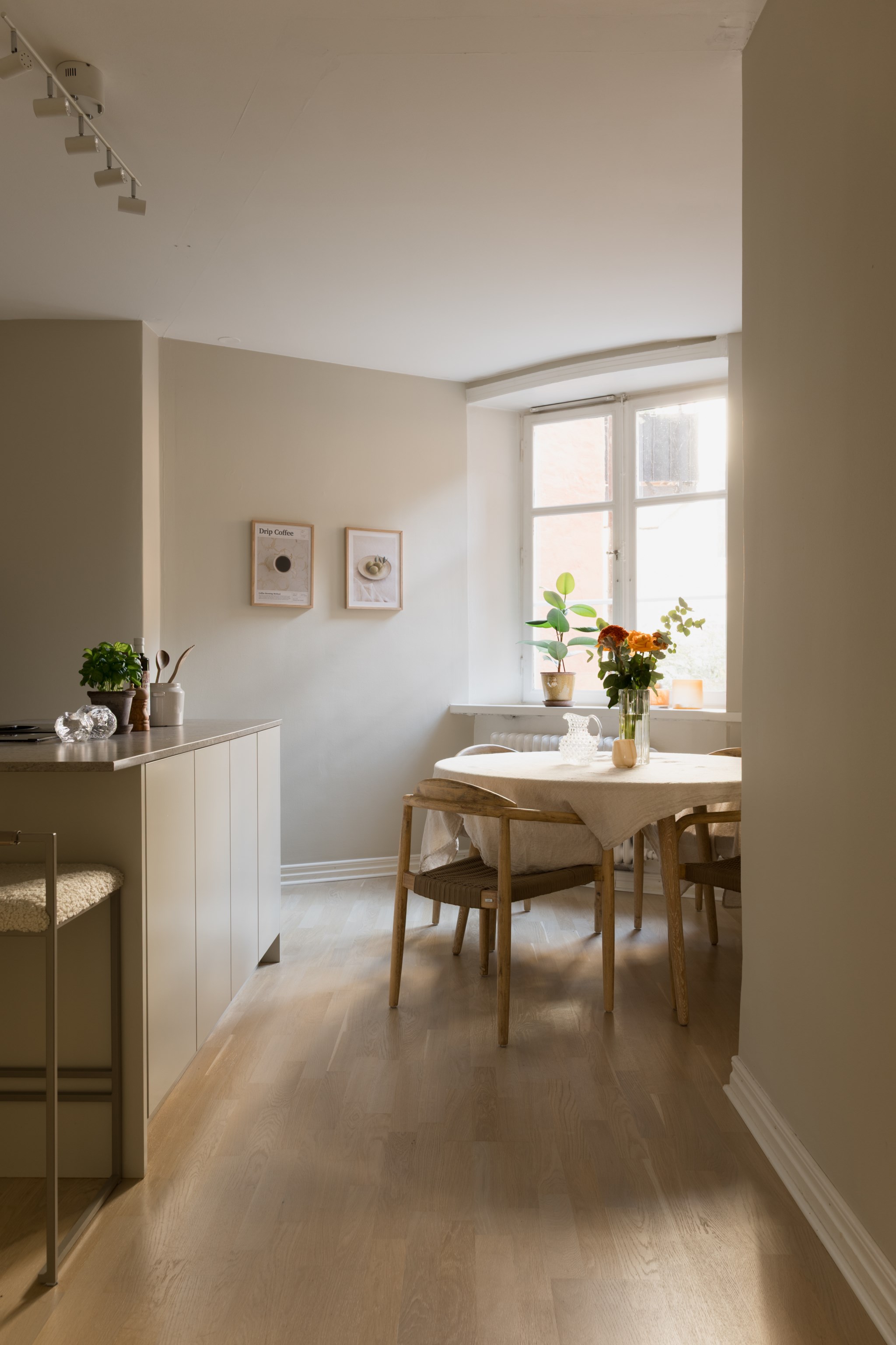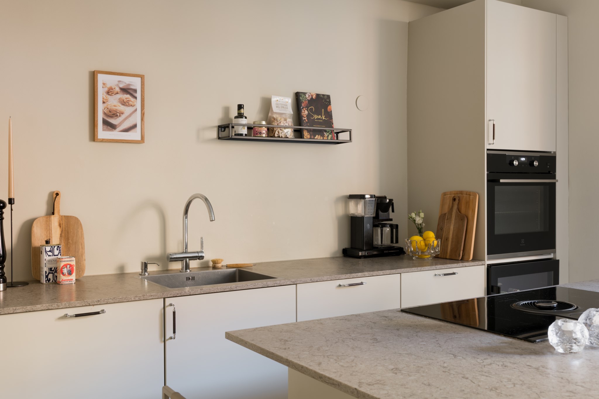 Snyggt och stilrent kök med gott om arbetsyta för den matlagningsglade. Den stora köksön blir platsen där vännerna vill samlas. Mycket goda förvaringsmöjligheter bakom ljusbeiga skåpsluckor. Den maskinella utrustningen består av ugn, spis med fläkt, diskmaskin, vinkyl, micro och kyl/frys. Fint ljusflöde från stort, spröjsat fönster. I köket finns det plats för ett matbord för 6 personer.