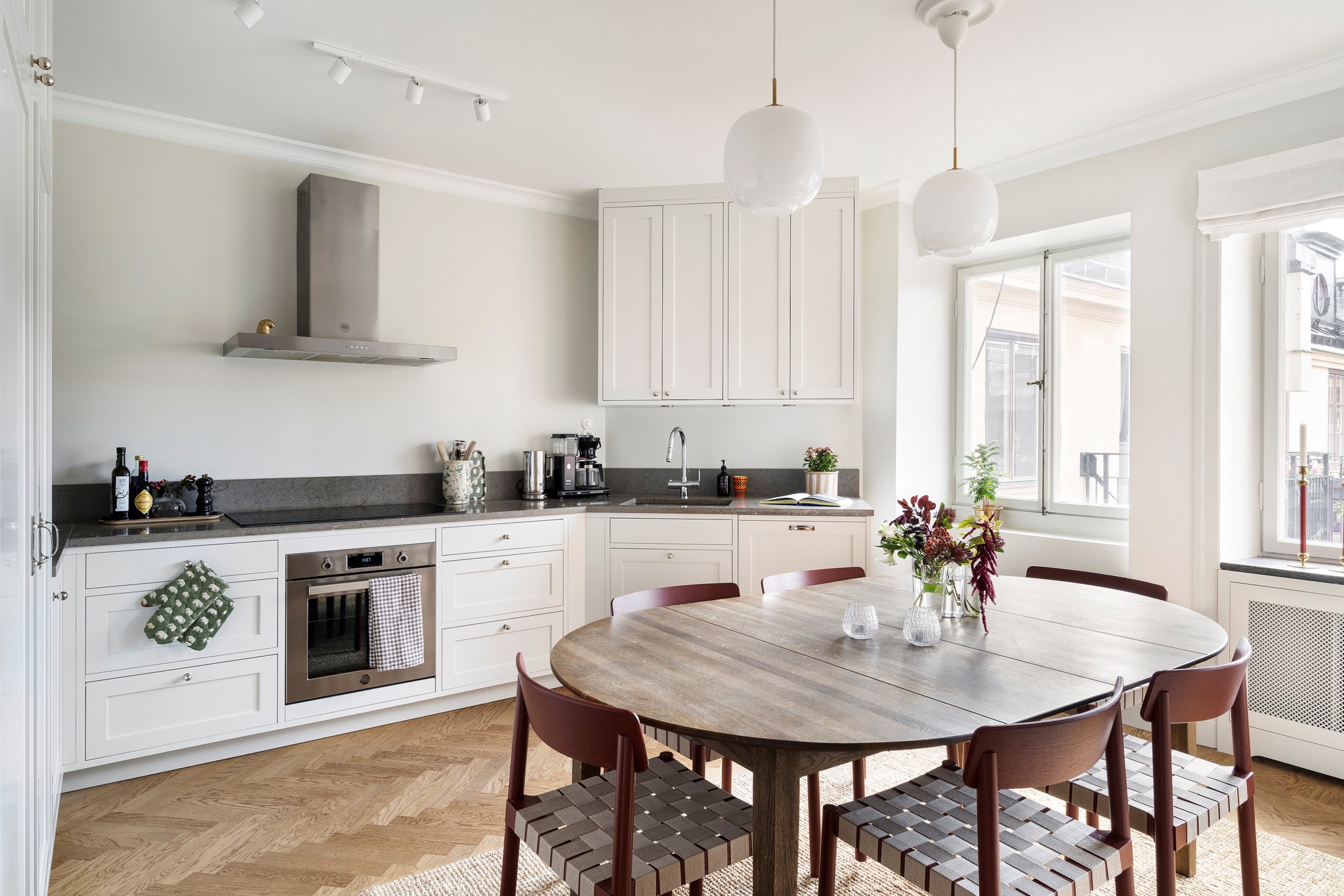 Ett luftigt och socialt kök med dubbla fönster mot innergården som släpper in rikligt med ljus. Köket från Nordiska Kök har tidlösa luckor i ljus ton, bänkskiva i kalksten och maskinell utrustning från bland annat italienska Bertazzoni. Här finns helkyl, helfrys och integrerad diskmaskin. En självklar samlingspunkt med plats för stora middagar och familjära helgfrukostar. Ett djup skafferi och ett originalskåp där tvättmaskin och torktumlare finns snyggt inbyggda.