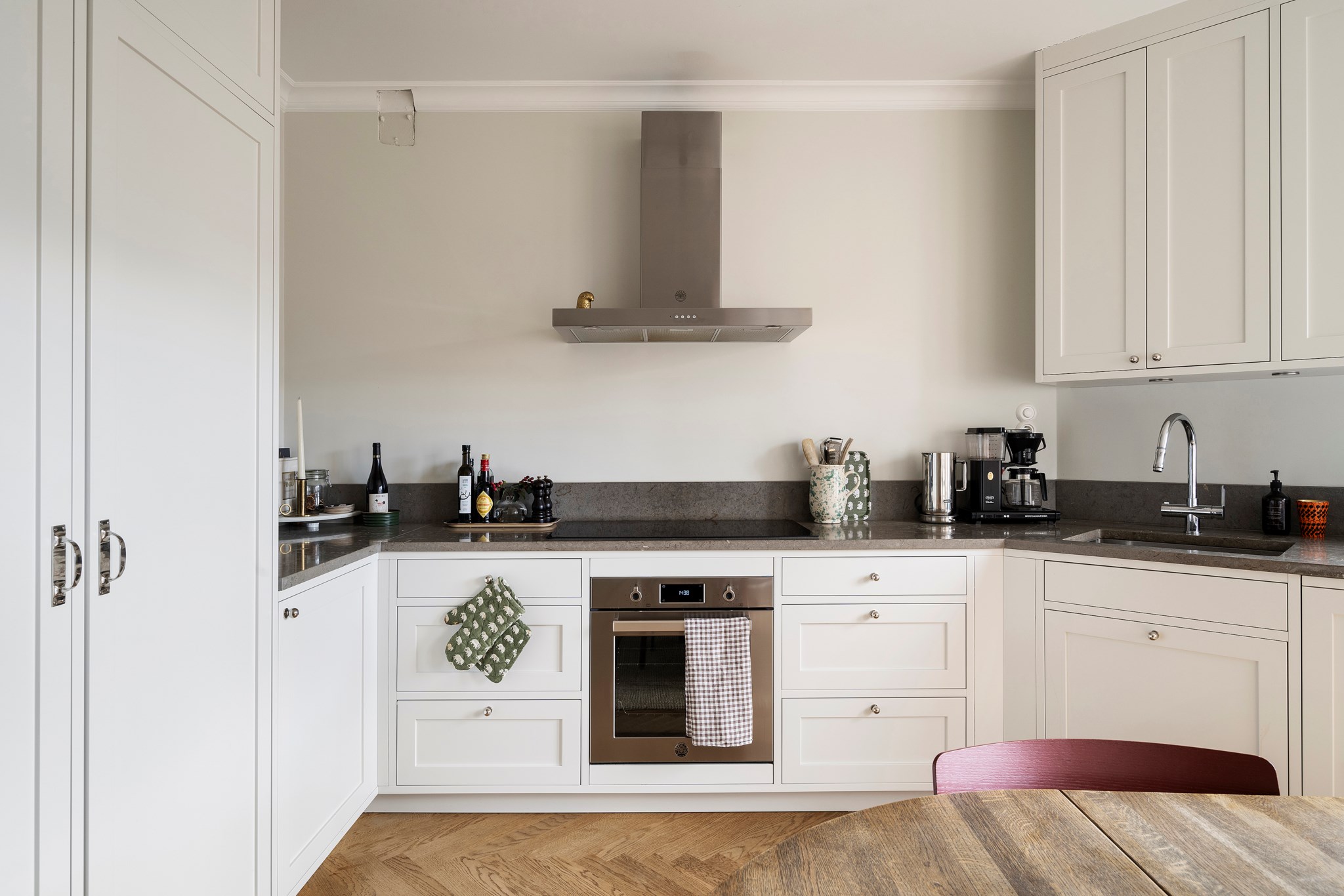 Köket från Nordiska Kök är både smakfullt och funktionellt, med bänkskiva i kalksten och toppmodern maskinell utrustning från bland annat italienska Bertazzoni. Här finns plats för stora middagar kring matbordet och gott om förvaring bakom snickerier i klassisk stil. En diskret skåpslösning rymmer tvättmaskin och torktumlare vilket förhöjer bekvämligheten i vardagen.