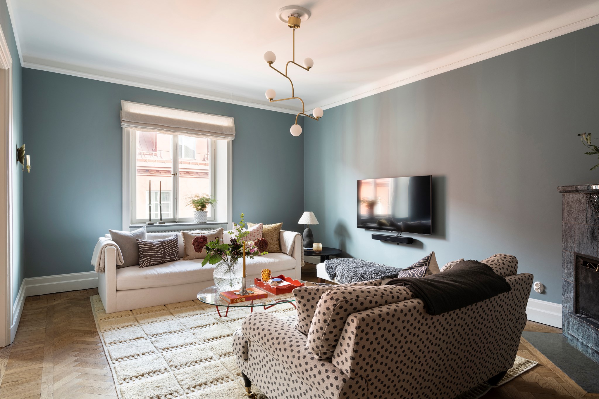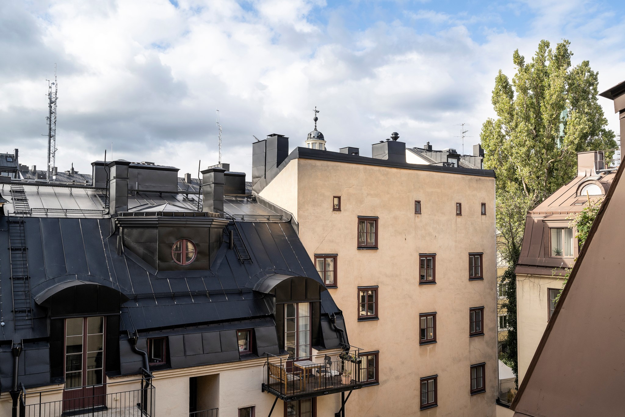 Högt upp i en vacker 1920-talsfastighet på Regeringsgatan 85 väntar ett hem som med varsam hand förenar tidlös elegans med modern komfort. Här möts fem stora fönster, skjutdörrar och stavparkett i fiskbensmönster -allt inramat av en harmonisk färgpalett och ett enastående ljusinsläpp. I vardagsrummet sprakar elden i den öppna spisen och utanför fönstren breder takåsarna ut sig, som en påminnelse om att du befinner dig mitt i staden men med en stilla ro ovanför myllret.