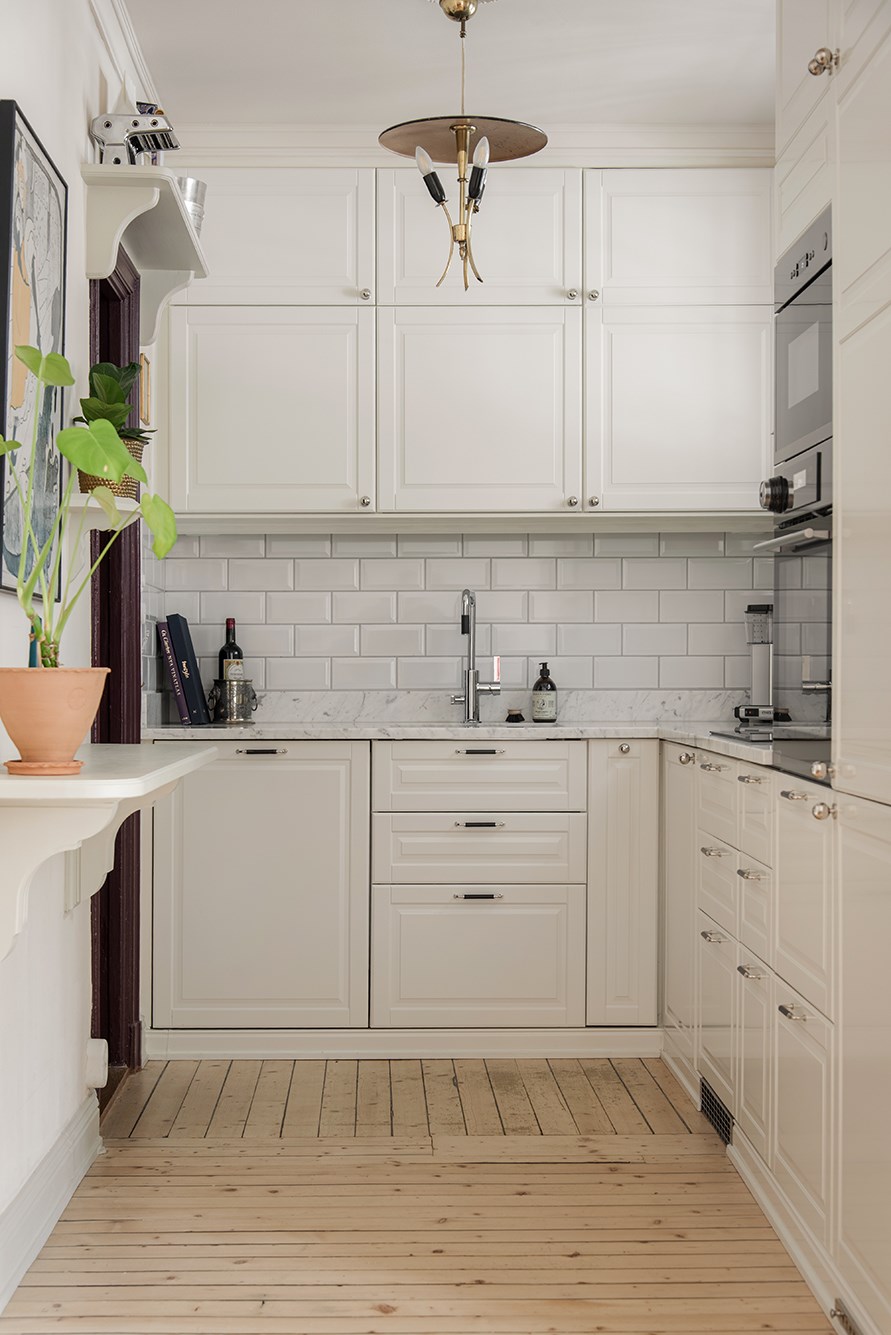 Öppen social planlösning där familj och vänner trevligt kan mingla och hjälpas åt med matlagningen. Vita snickerier upp till tak och generös bänkyta av klassisk Carrara med vitt kakel ovan samt vackert blyinfattat glas för ljusgenomsläpp. Här finns induktionshäll, inbyggnadsugn- och micro, fläkt och integrerad kyl/frys och diskmaskin.
