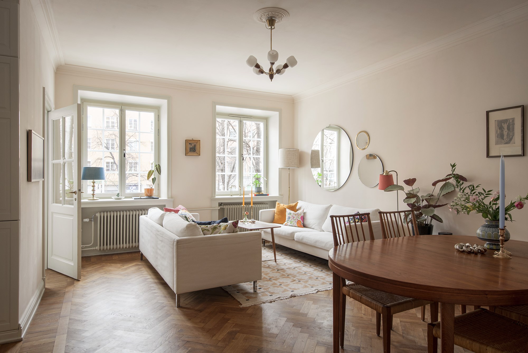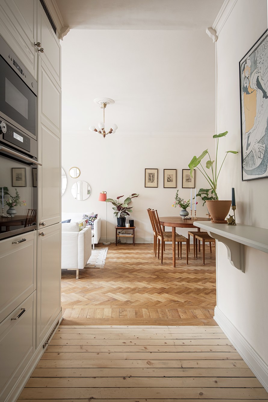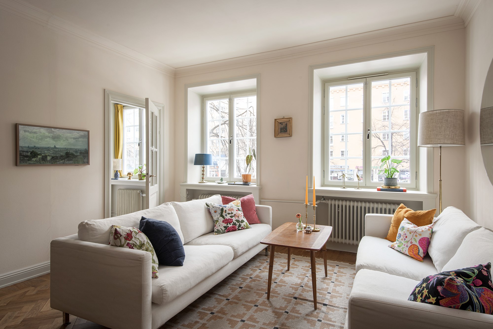 Fullkomligt magiskt och socialt sällskapsrum med två höga spröjsade fönster fil och öppen planlösning mot köket. Ytterligare två fönster ser man genom den vackra glasdörren mot sovrum nr 2. Generös takhöjd vilket tillsammans med de höga fönstren ger ett magiskt ljusinsläpp och skapar volym och rymd. Inbyggd klädkammare.