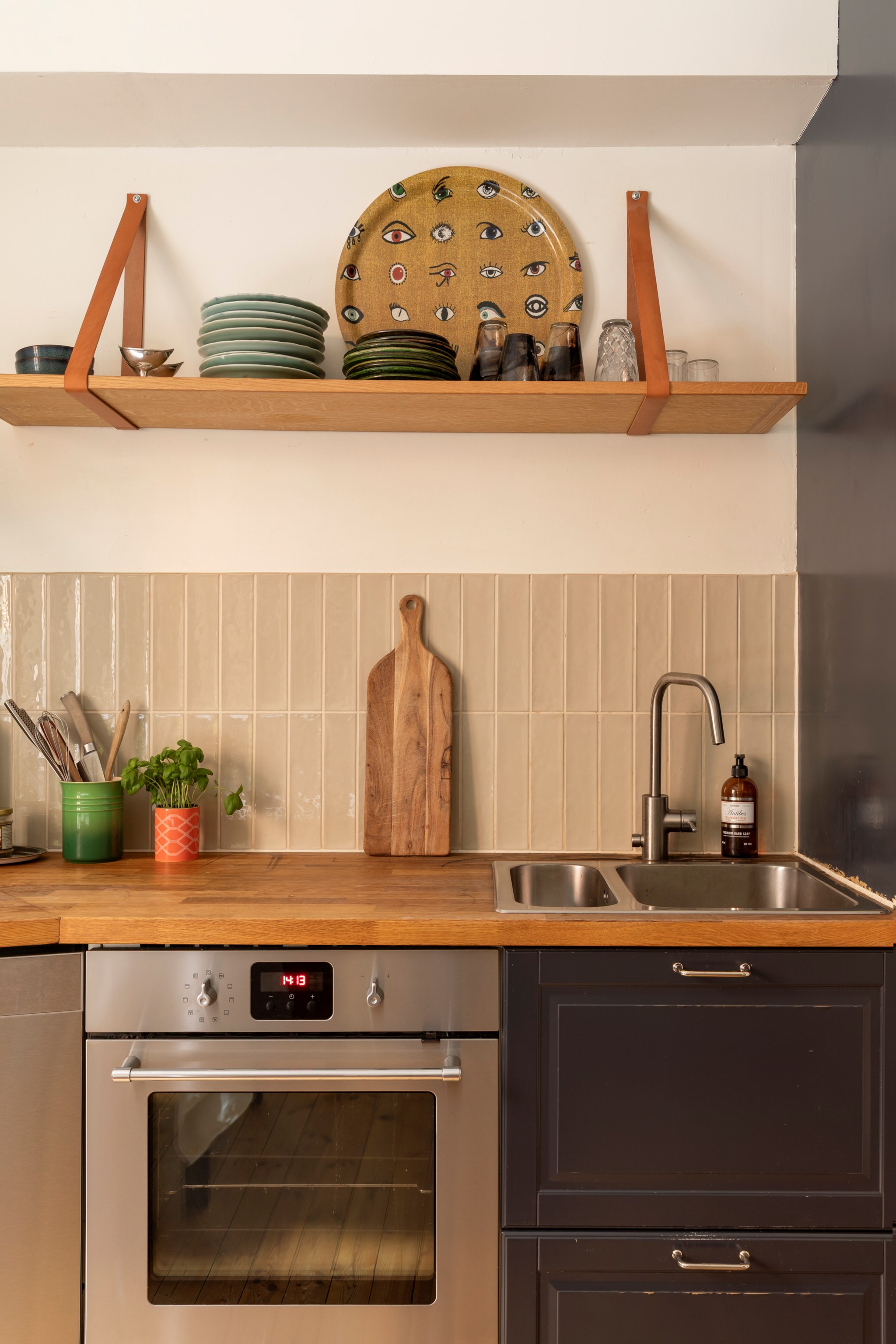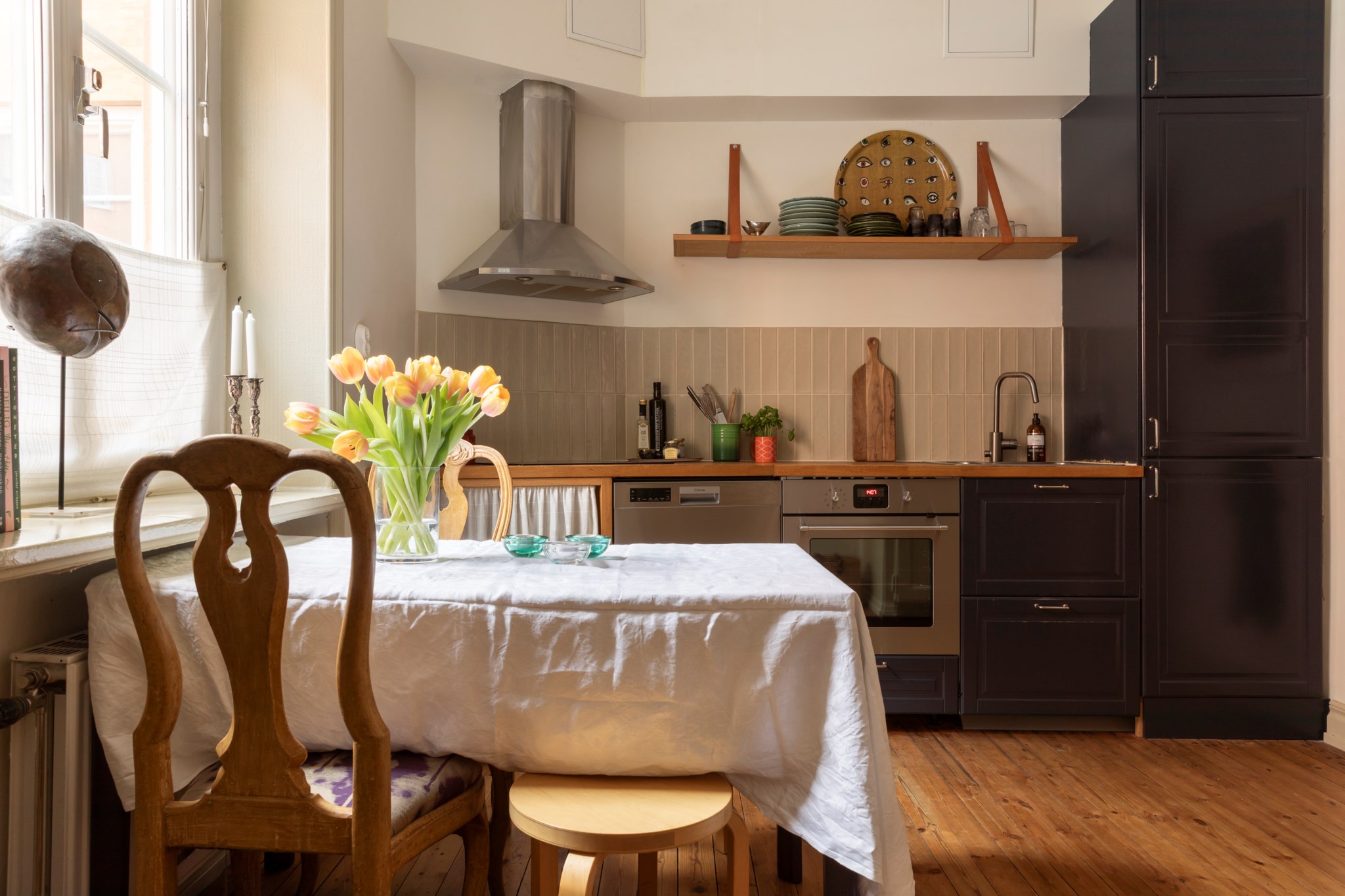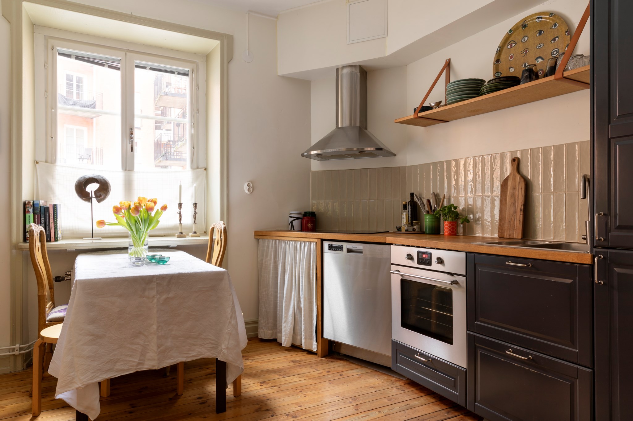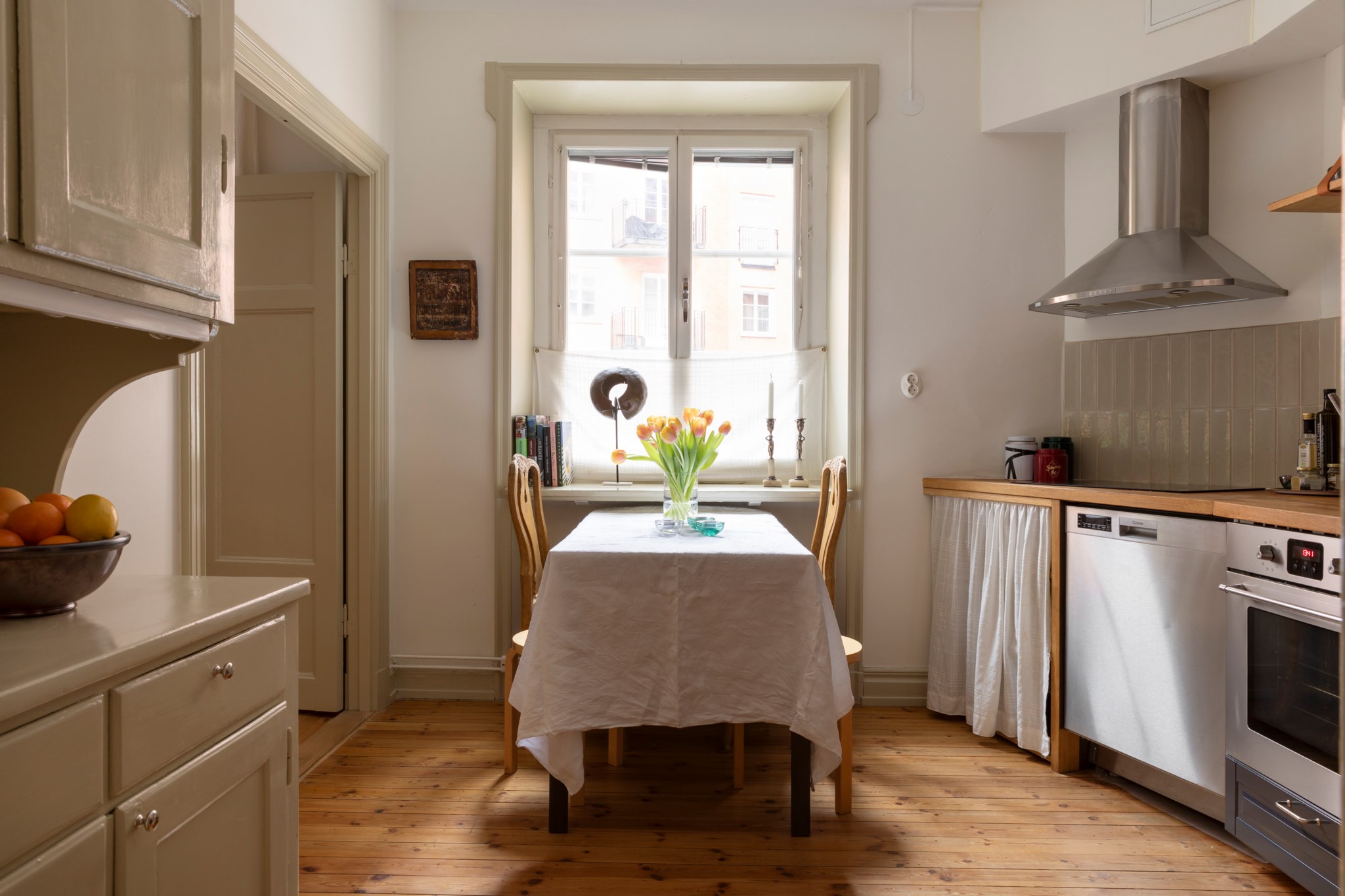 För den matlagningsintresserade och sociala är detta ett kök att trivas i! Här finns gott om plats för ett stort matbord, rejäla arbetsytor samt full maskinell utrustning i form av spis, ugn, kyl/frys och diskmaskin. Köket renoverades 2022 då luckorna lackades i mörkblått och fick beslag från Byggfabriken. Den oljade träbänkskivan harmonierar fint med det beige kaklet och väggar målade i en mjuk antikvit ton. Det charmiga originalskåpet erbjuder bra förvaring för porslin och är målat i samma kulör som bostadens övriga snickerier.