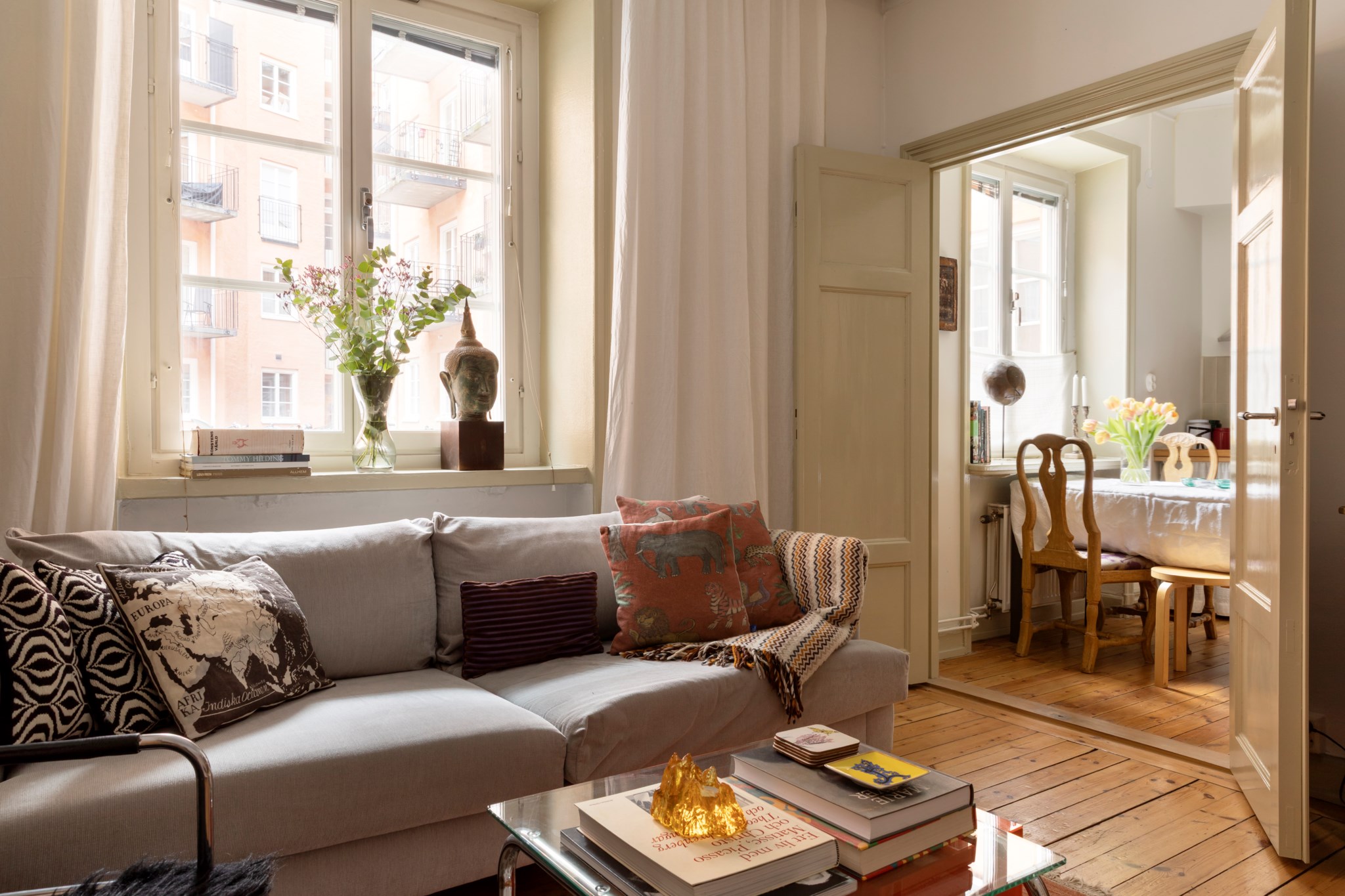 Från köket nås allrummet via vackra pardörrar, specialtillverkade av Nacka Byggnadsvård. De ger en öppen och luftig känsla mellan rummen, samtidigt som de gör det möjligt att stänga om sig vid behov. Rummet rymmer enkelt både soffgrupp och större säng och har dessutom en inbyggd garderob med gott om förvaring. Originalgolvet samspelar fint med den ljusa väggfärgen som även återfinns i hallen. Det finns ett tidigare beviljat, nu utgånget, bygglov för att installera altandörrar mot gården – en lösning som flera grannar redan har genomfört.