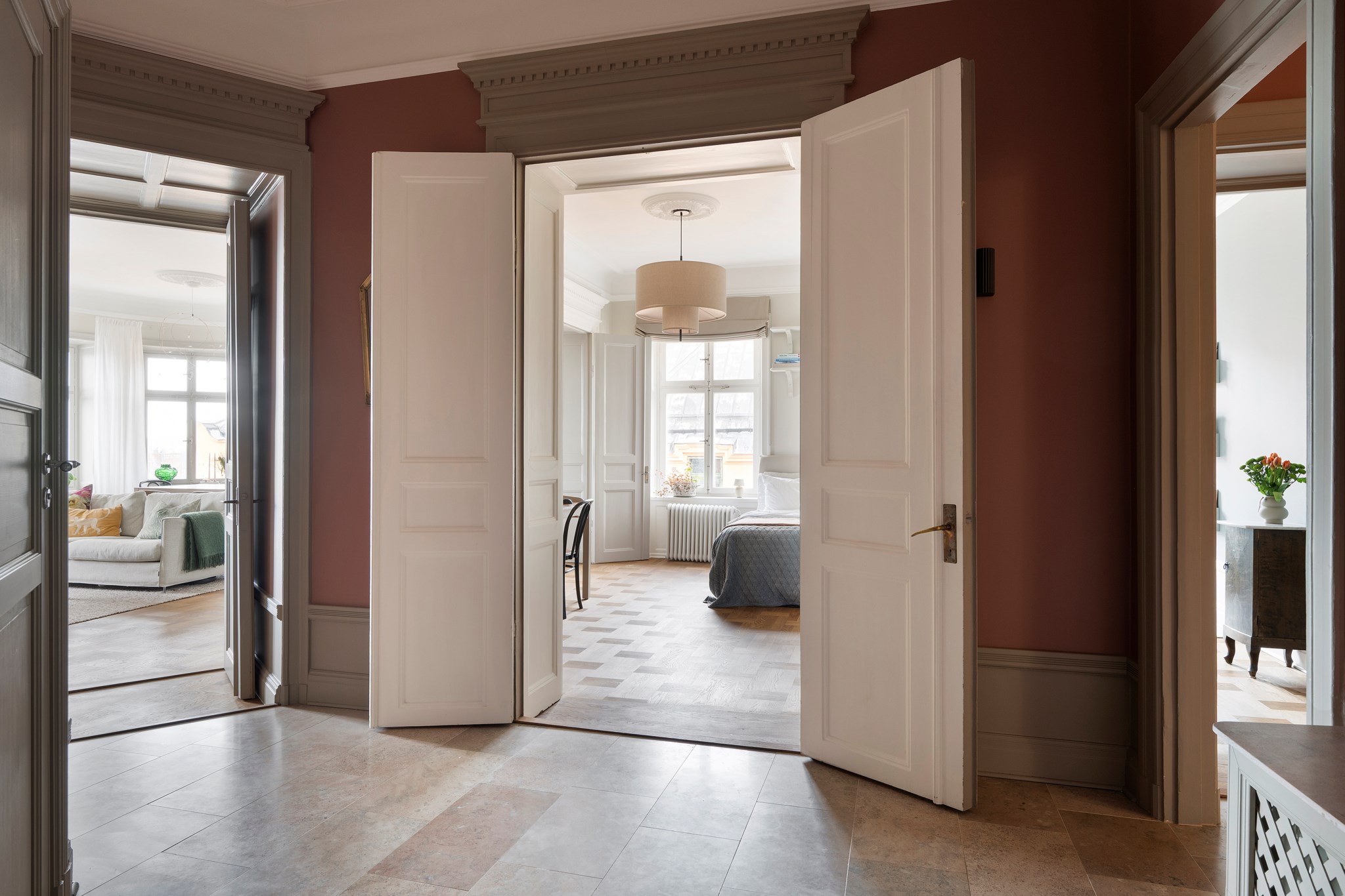 Högst upp i huset, i ett ljust hörnläge med fönster i tre väderstreck, breder denna sekelskiftesvåning från 1907 ut sig med en självklar närvaro. Här, sex trappor upp med hiss hela vägen, möts stadens takåsar och himmel i en fri horisont utan insyn – ett läge som är både urbant och oväntat rofyllt.