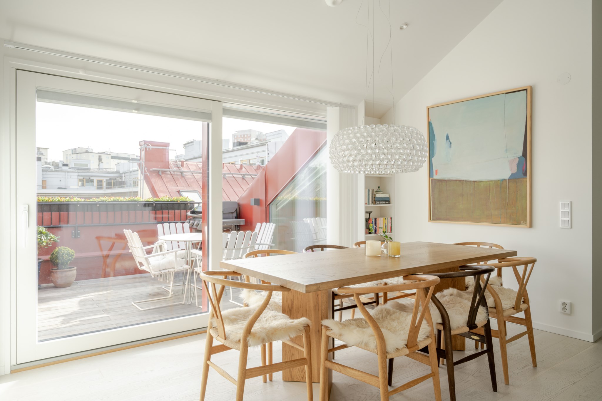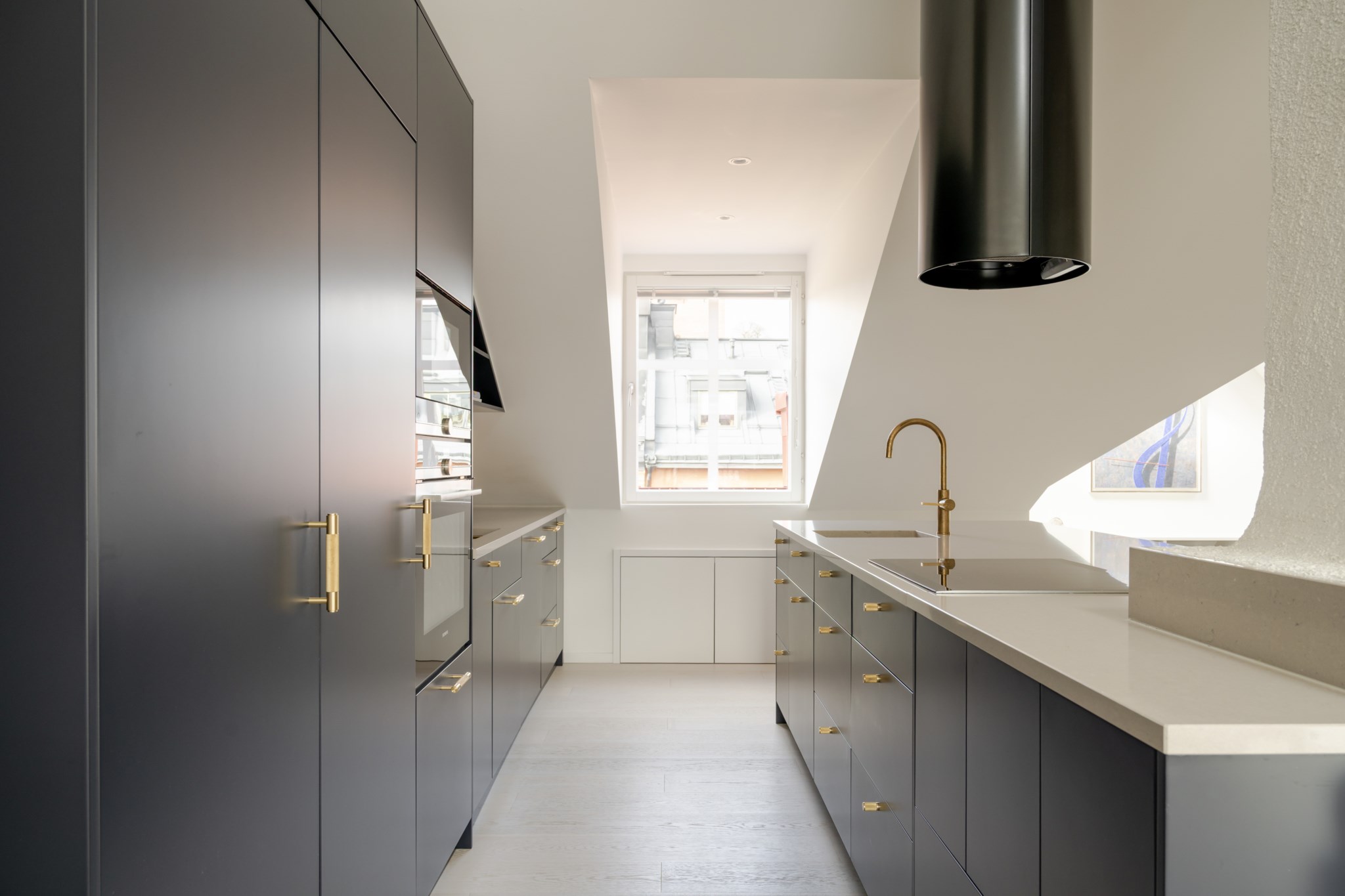 Stilrent platsbyggt kök med generösa arbetsytor och utmärkta förvaringsmöjligheter. Utrustat med fullstorkyl/frys, diskmaskin, ugn och mikro, induktionshäll samt dubbla diskhoar. Den stora köksön blir en naturlig samlingspunkt och intill finns plats för ett rymligt matbord med direkt närhet till terrassen.