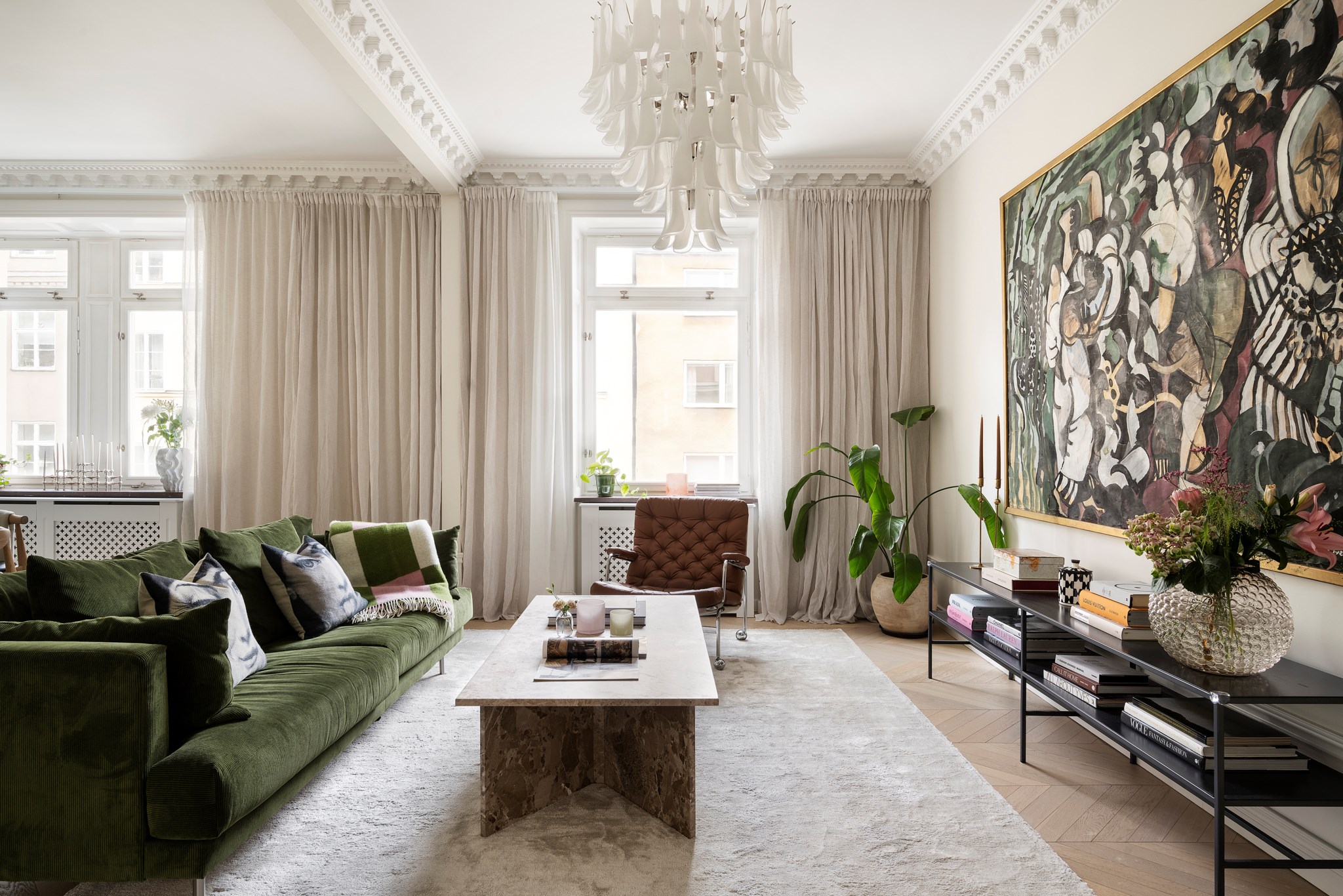 Planlösningen är flexibel och inbjudande. I dag disponeras bostaden som fyra rum och kök, med möjlighet att skapa ytterligare ett sovrum för den som behöver. De öppna sällskapsytorna binder samman kök och vardagsrum i en social helhet där middagar, samtal och vardagsliv får ta plats. Samtidigt finns avskildheten i sovrummen, en balans som gör hemmet lika trivsamt för familjeliv som för paret som vill ha arbetsrum och gästrum.