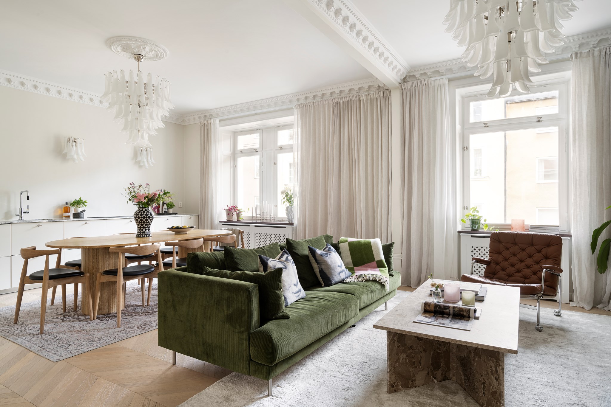 Köket är stilrent med bänkskivor i exklusiv marmor (Arabescato), integrerade vitvaror och god förvaring. Arbetsytorna är väl tilltagna och dispositionen genomtänkt för både vardag och middagar med många gäster. Stuckaturer och höga fönster ramar in rummet och ger en självklar sekelskifteskänsla.