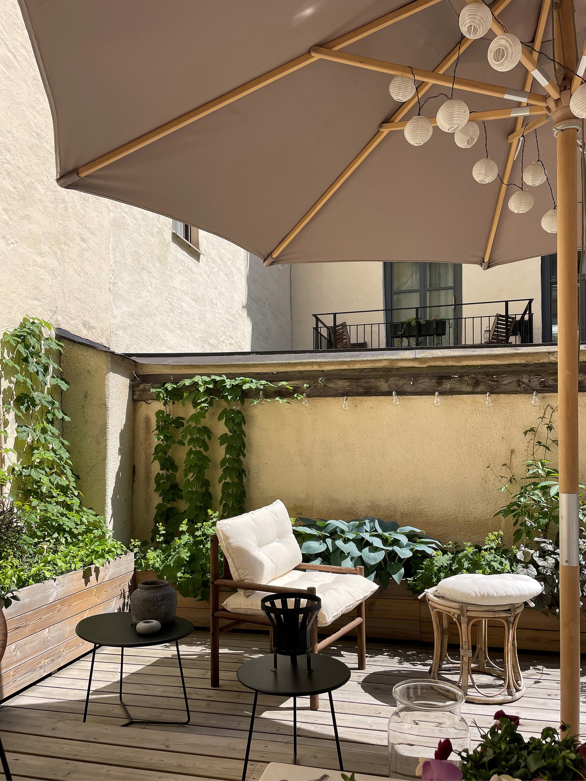 Från vardagsrummet når man den underbara och mysiga uteplatsen med grönska och sol. Här ryms möblemang och planteringar. En uteplats perfekt för sommarhalvårets bjudningar. Uteplatsen är ca 38 kvm och blir som ett extra vardagsrum under sommarhalvåret. Här ryms både matgrupp, solstolar, loungedel och planteringar. Här har man sol från ca 11.00 - 15.00 sommartid. Mycket privat uteplats, där endast en annan granne har uteplats och vistas, uteplatsen är belägen på egen innergård, som är separat från föreningens gemensamma innergård.