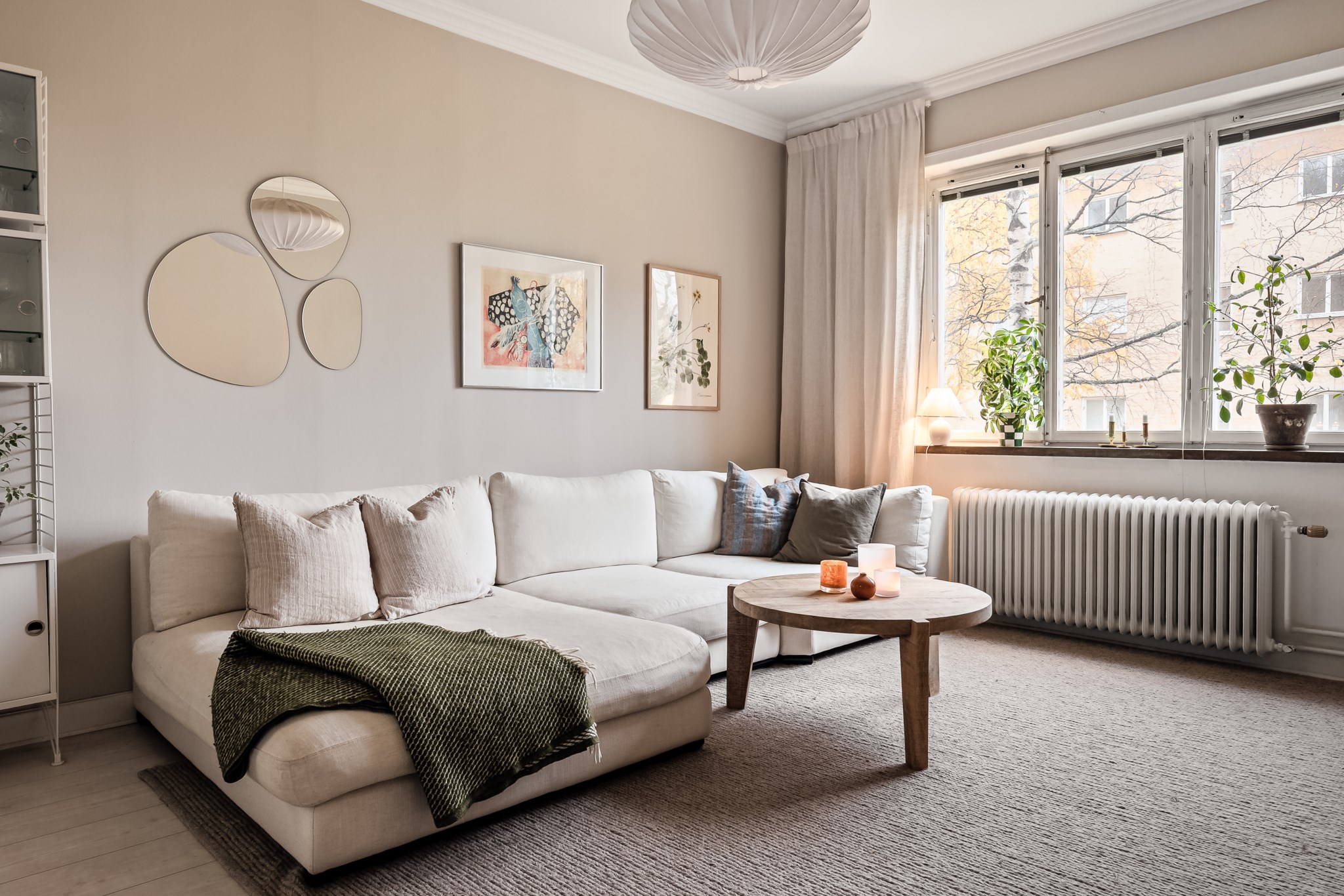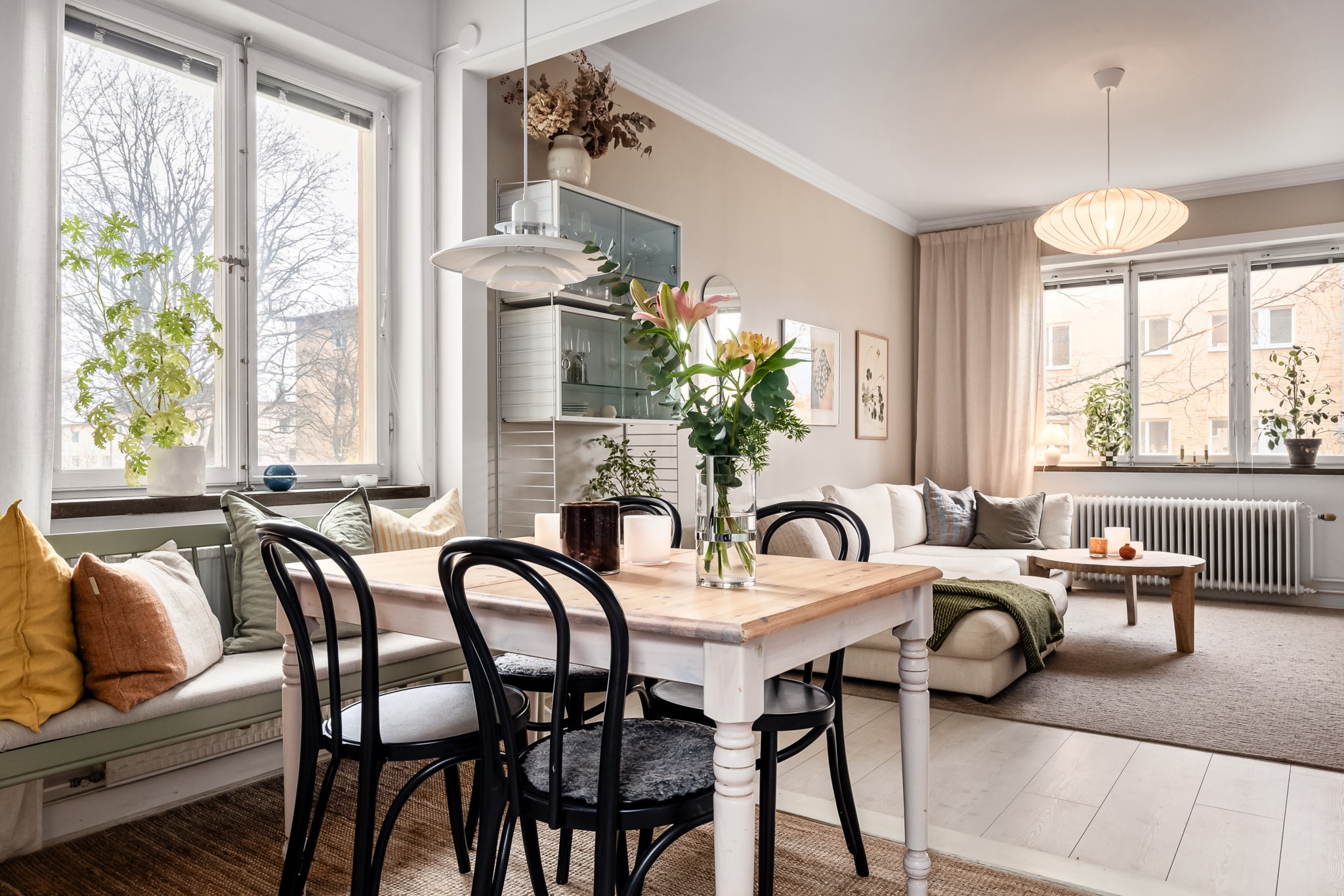 Ljust och luftigt rum med öppen planlösning mot köket. Här finns det gott om utrymme för större soffgrupp, tv-möbel och ett matsalsbord för flertalet middagsgäster. Stort fönsterparti mot lugn och lummig innergård.