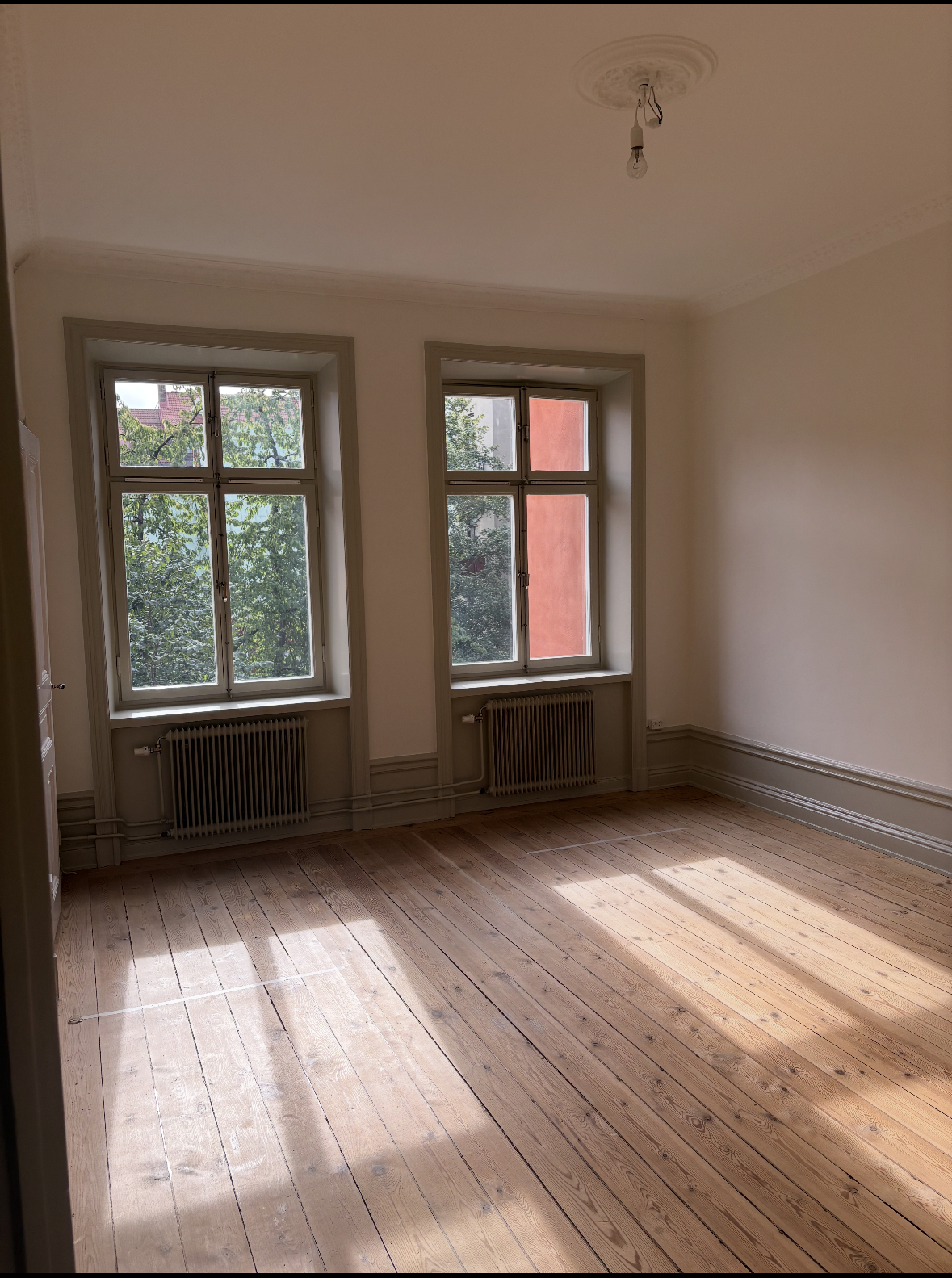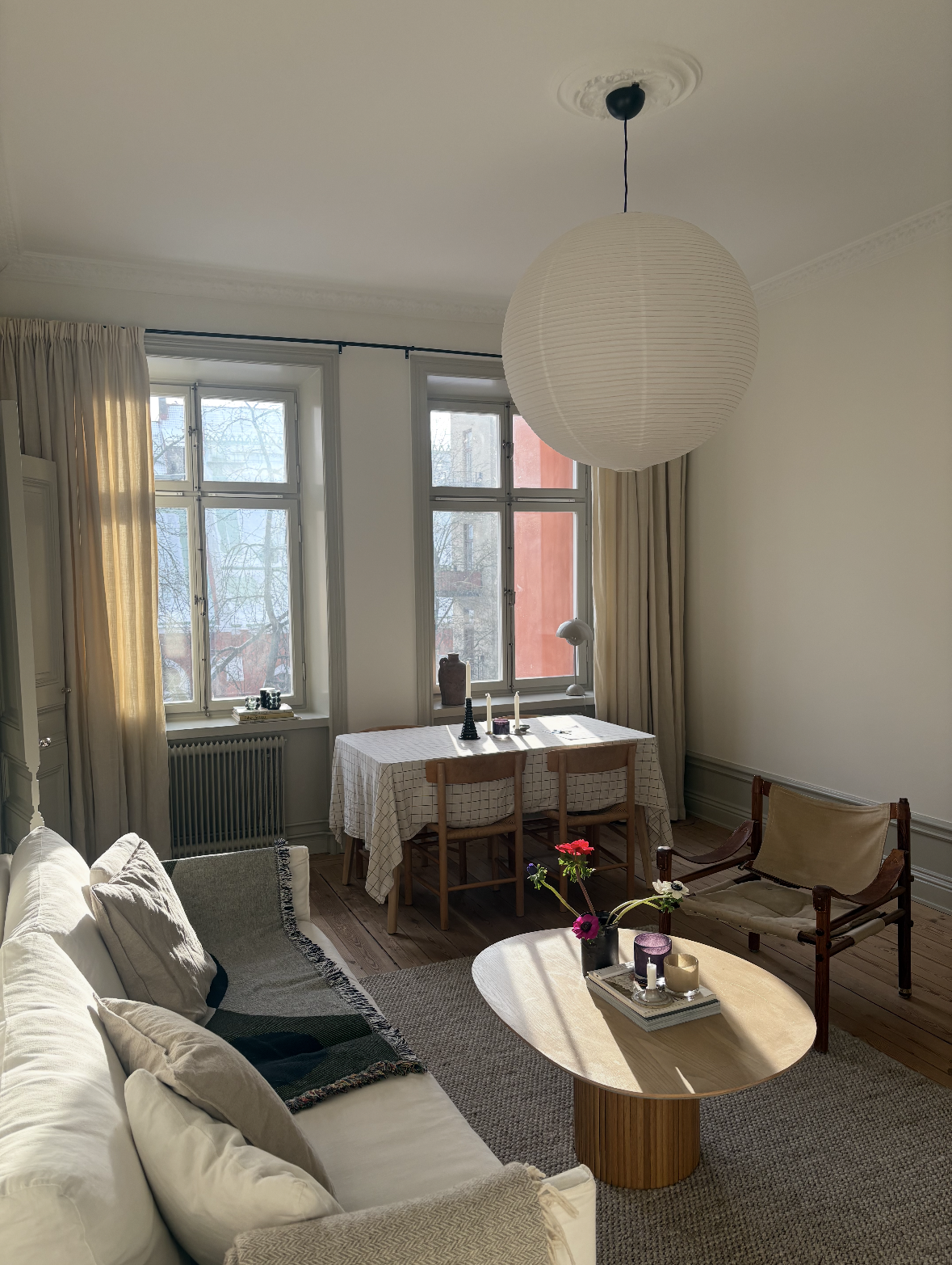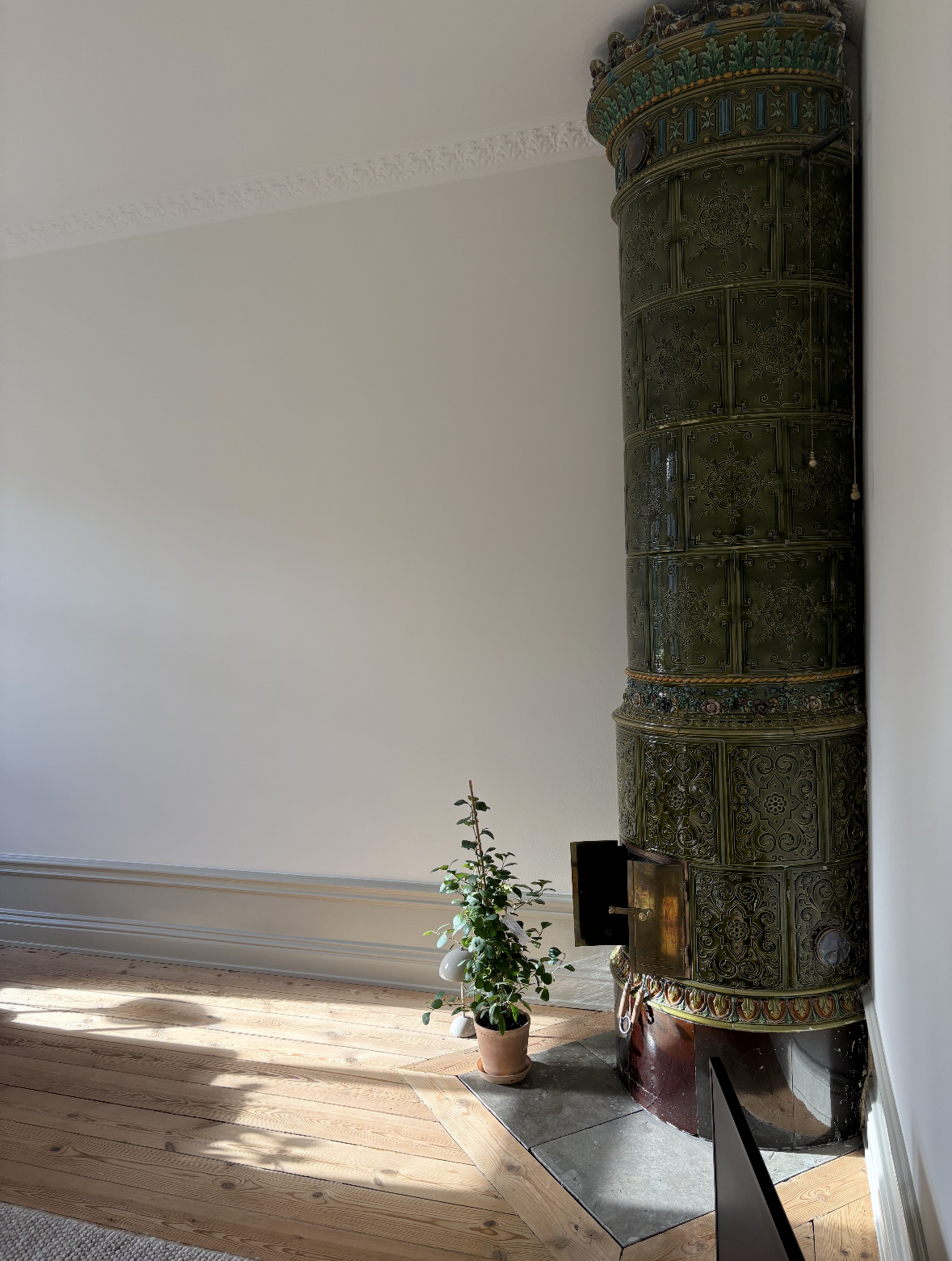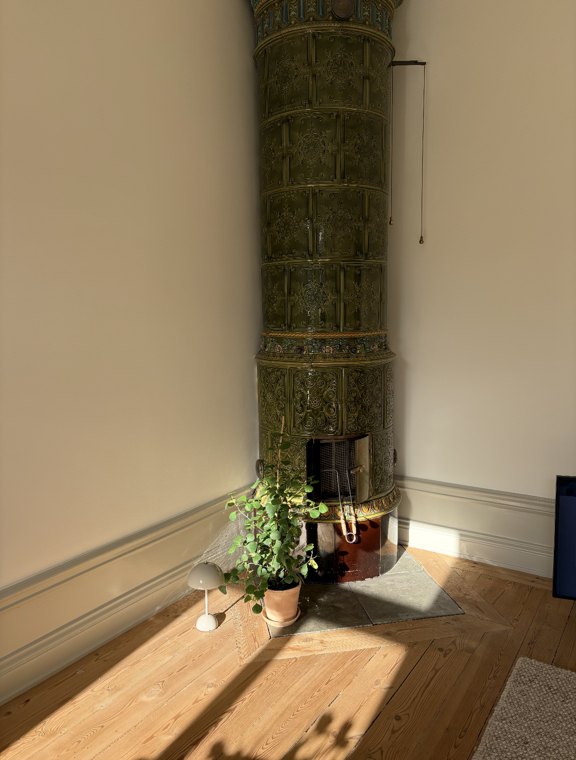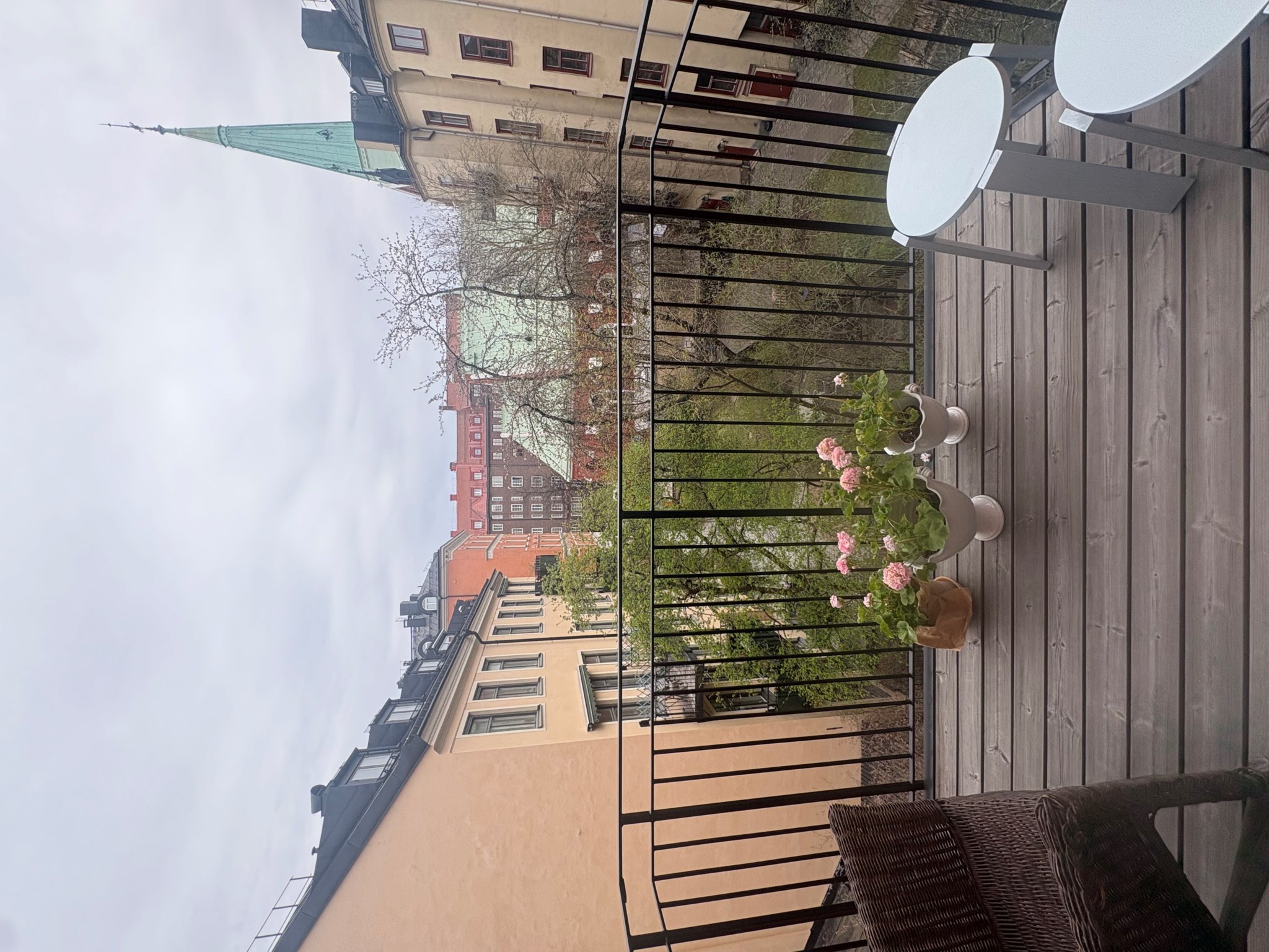 Balkongen ligger mot den insynsskyddade innergården med blommande körsbärsträd på försommaren och erbjuder sol från morgon till sen eftermiddag. Tack vare att hela lägenheten vetter mot gården flödar ljuset fritt genom de höga fönstren och ger en lugn, avskild känsla mitt i stan.
