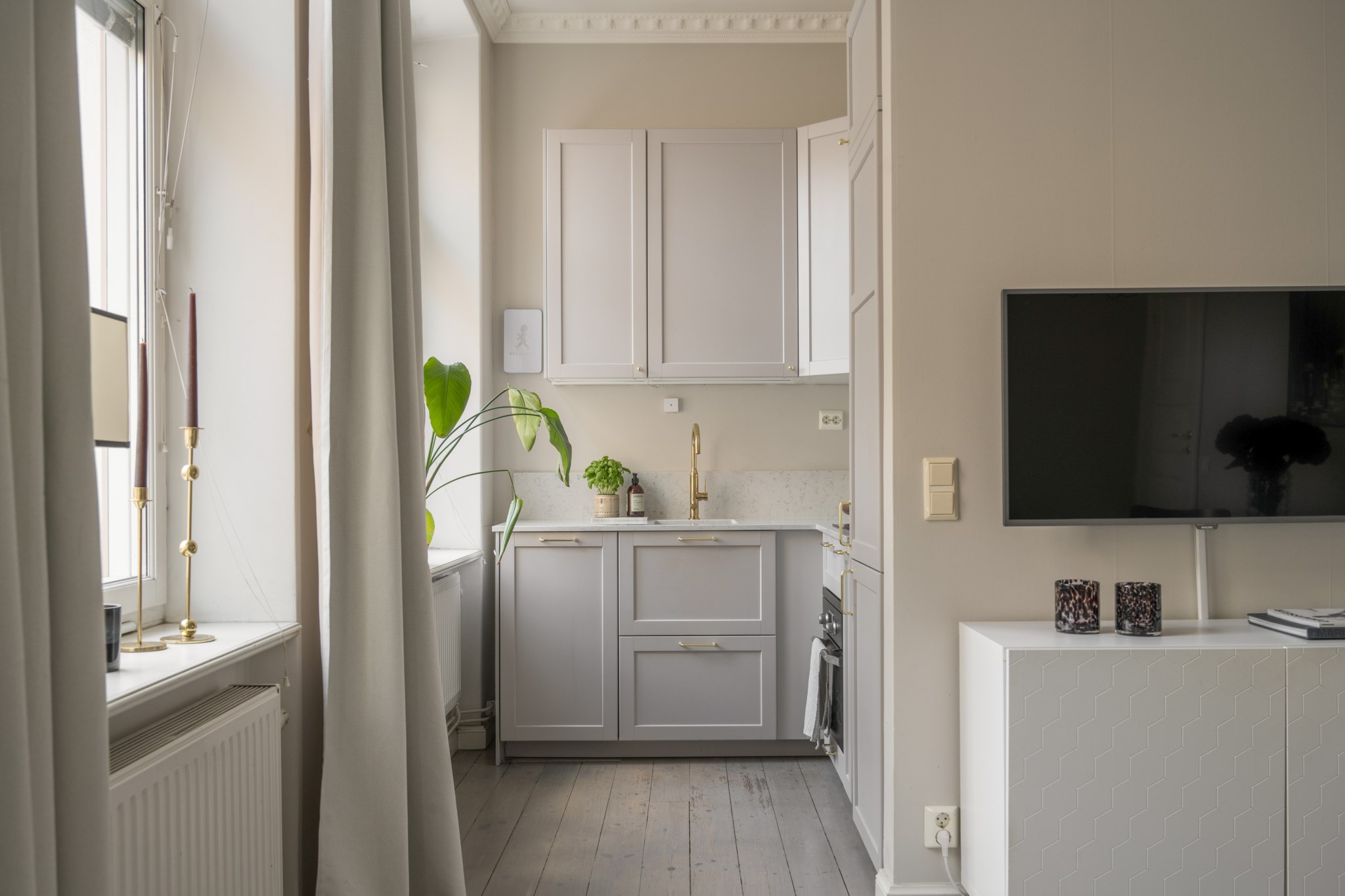 Tidsenliga detaljer från byggåret bevaras och lägenheten karaktäriseras av bl a vackra golv, höga fönster, stuckaturer och högt till tak. Planlösningen är mer eller mindre perfekt, den är ytterst väldisponerad och funktionell och väl anpassad för två personer.