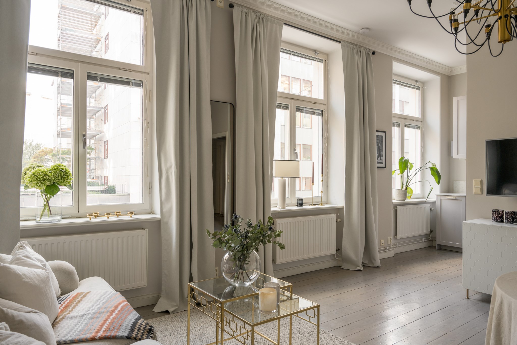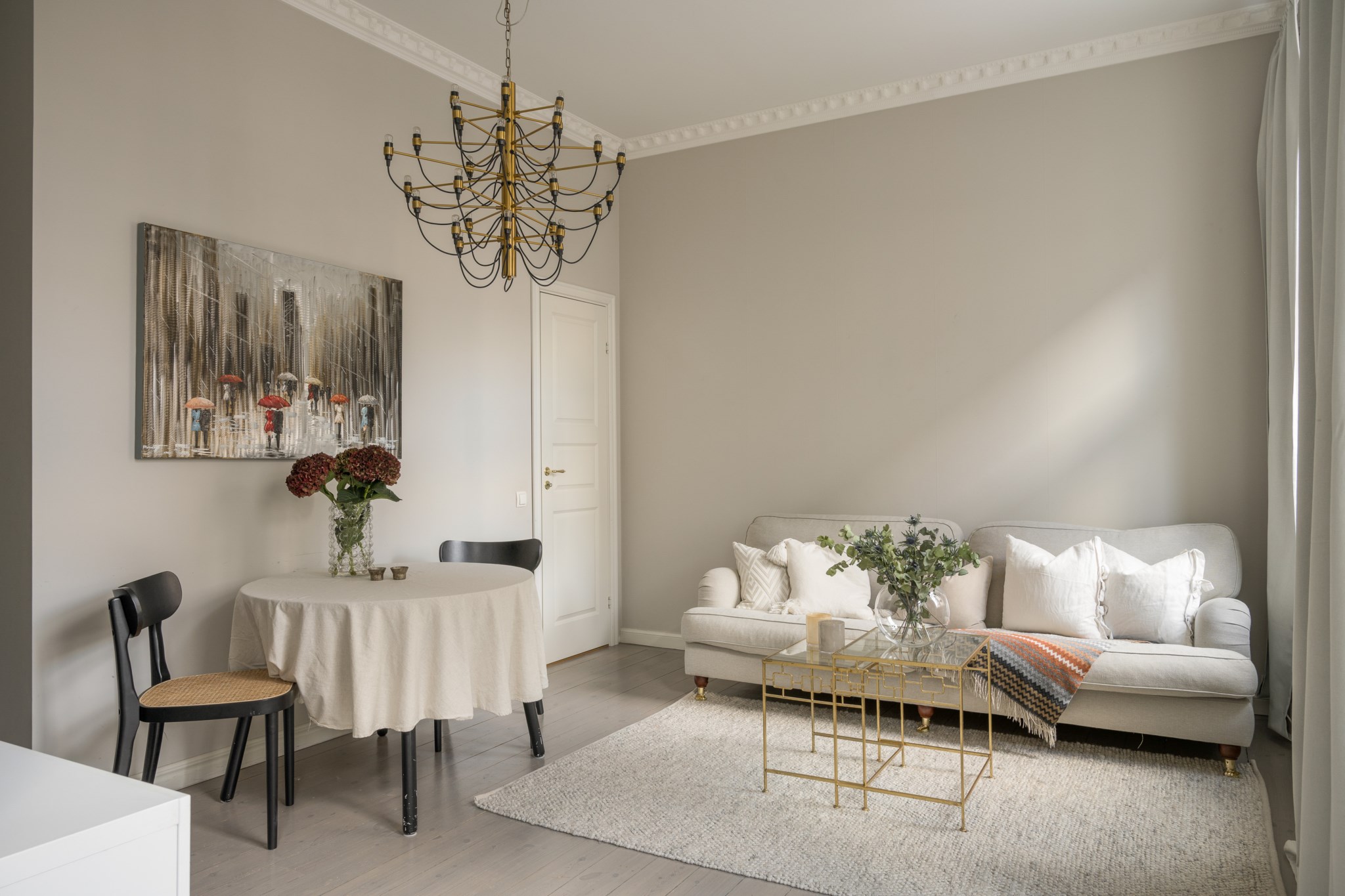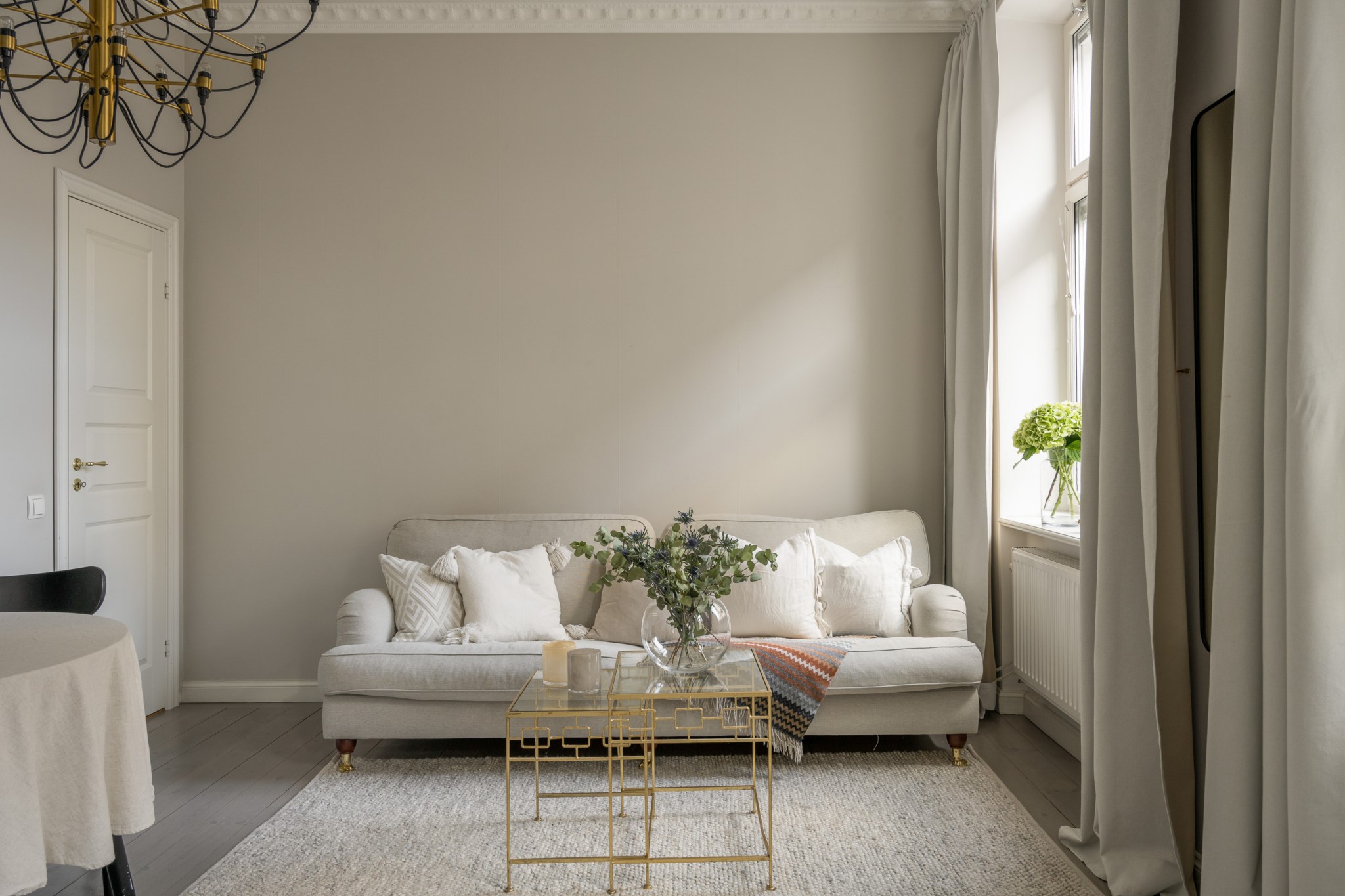 Ljust och lättmöblerat vardagsrum med stora fönster som ger ett fantastiskt ljusinsläpp. Sällskapsrummet ligger i öppen planlösning mot köket och rymmer såväl soffa som matbord.
