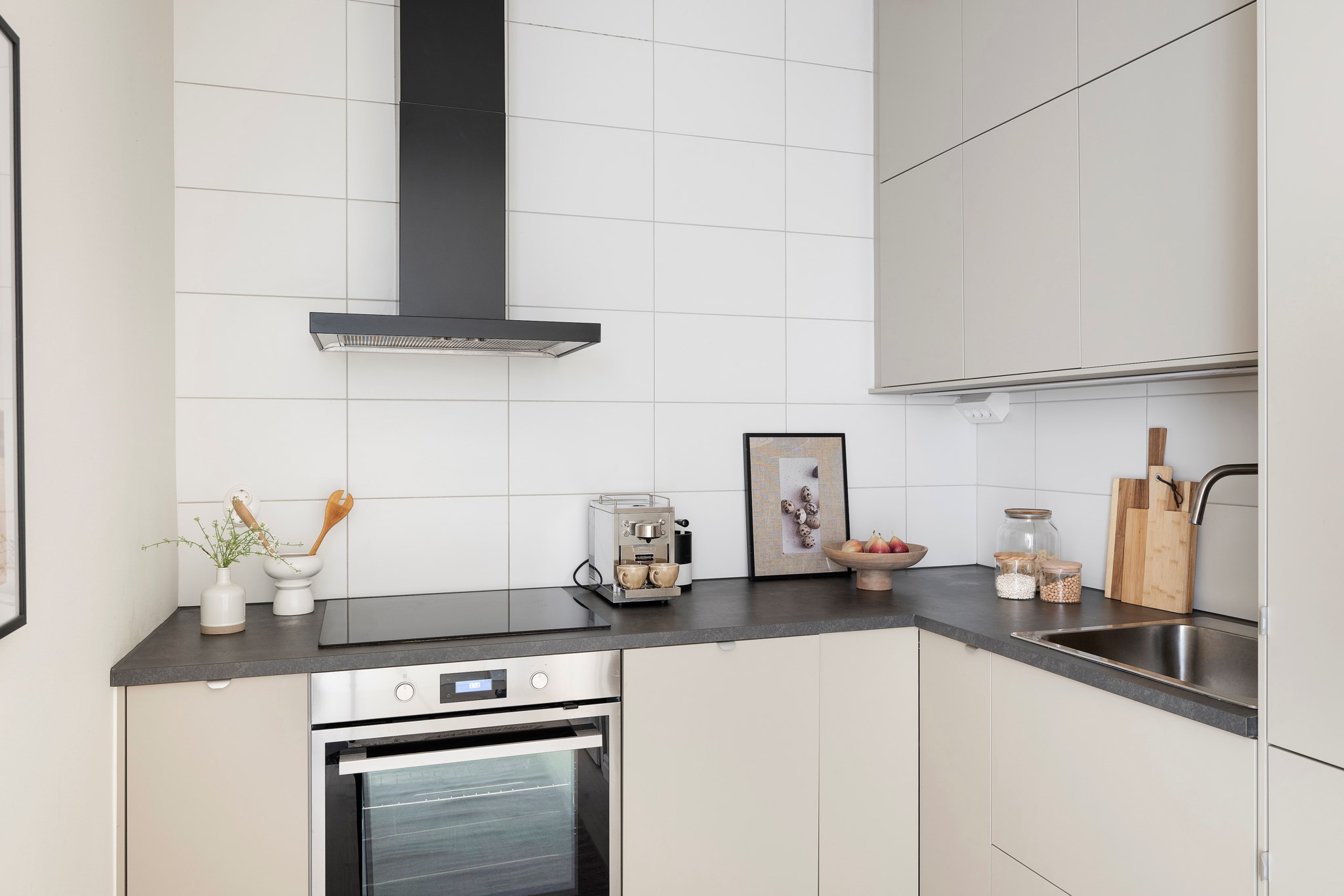 Nyrenoverat kök från 2022 med god förvaring bakom beigea luckor och arbetsytor i mörk bänkskiva. Köket är utrustat med induktionshäll, ugn, integrerad diskmaskin samt kyl och frys. Planlösningen ger möjlighet att öppna upp mot vardagsrummet för den som önskar en mer social disposition mellan kök och vardagsrum.