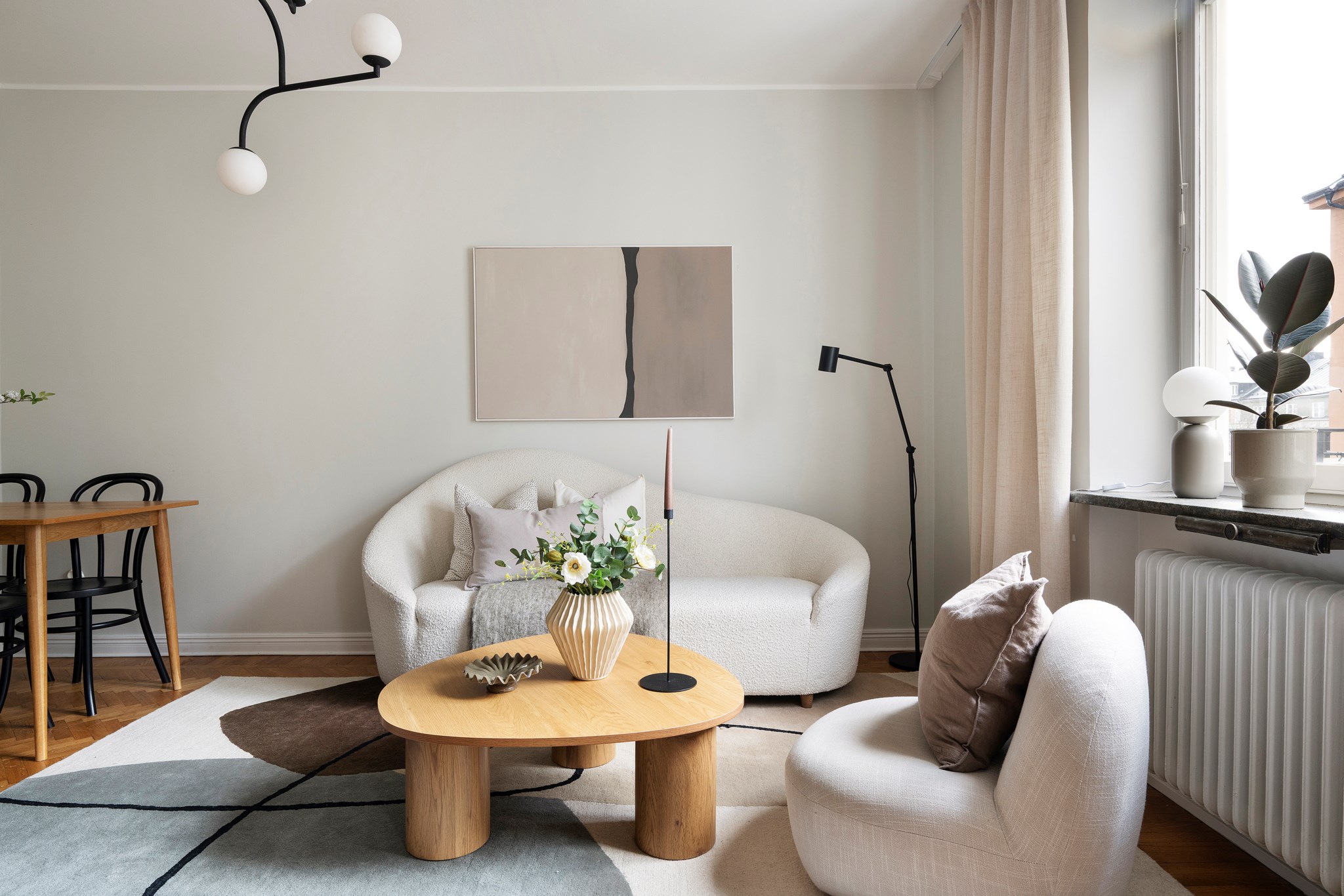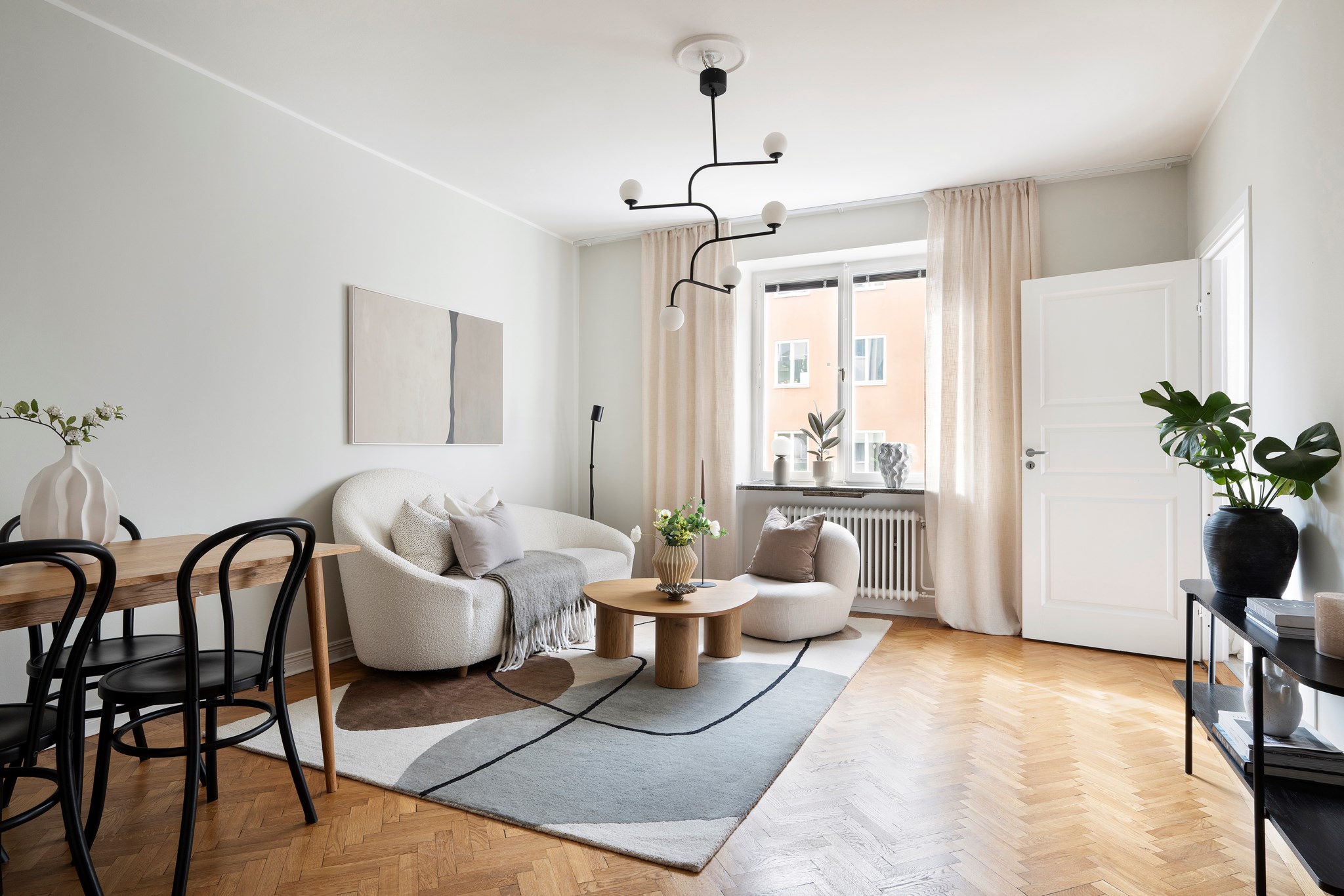 Ljust och lättmöblerat vardagsrum med vacker fiskbensparkett och målade väggar. Fönster mot lugn förgård ger ett högt och skyddat läge, indraget från Sveavägen. Här finns plats för både soffgrupp, TV-möbel, matbord och fåtöljer.