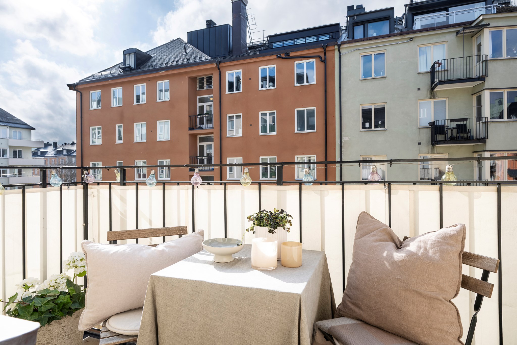 Solig balkong i härligt sydvästläge med sol från cirka 11.00 till kväll. Högt läge med fri känsla och utsikt över förgården och omkringliggande hus.